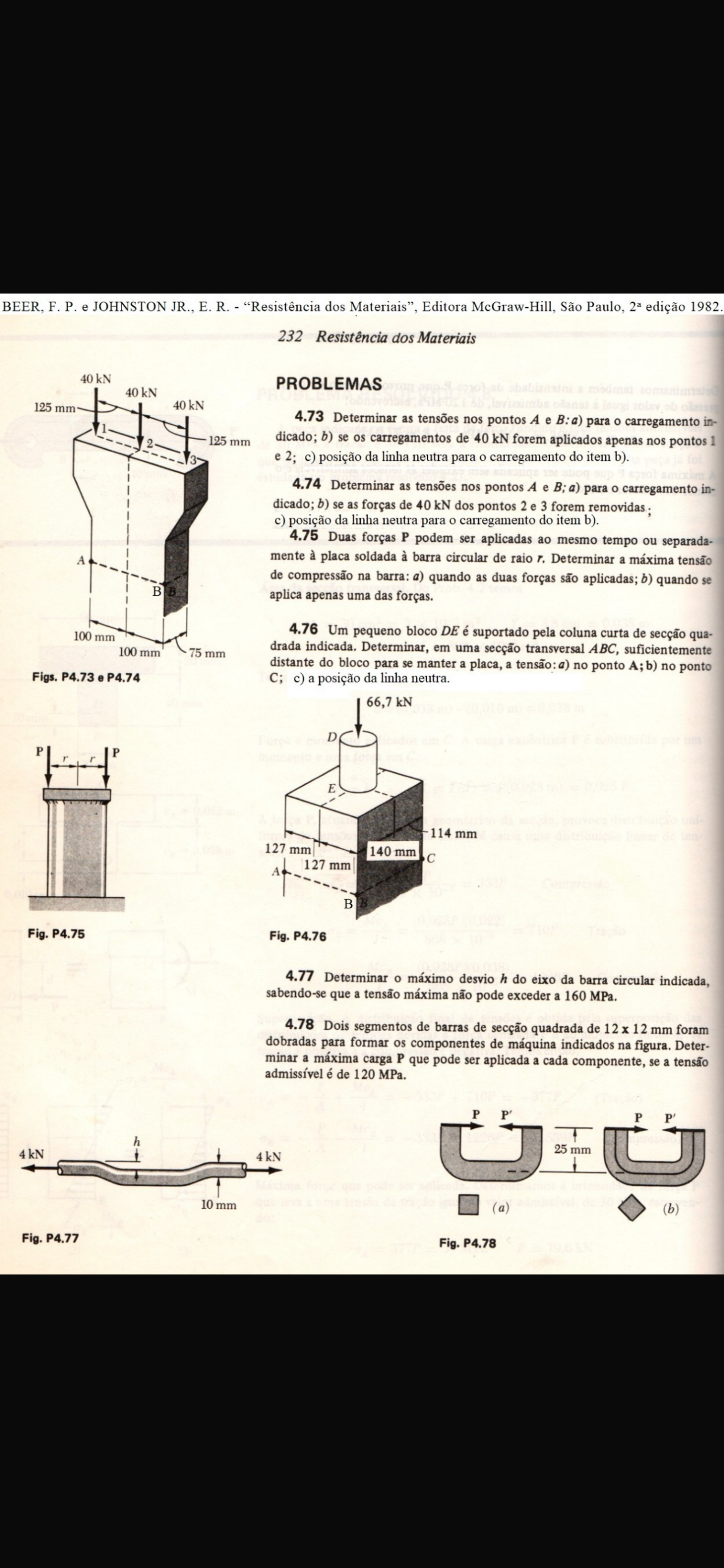 BEER, F.P. e JOHNSTON JR., E.R. "Resistência dos Materiais", Editora McGraw-Hill, São Paulo, edição 1982. 232 Resistência dos Materiais 40 kN PROBLEMAS 40 kN 125 mm 40 kN 4.73 Determinar as tensões nos pontos A e B:a) para o carregamento in- 2 125 mm dicado; b) se os carregamentos de 40 kN forem aplicados apenas nos pontos 1 3 e 2; c) posição da linha neutra para carregamento do item b). 4.74 Determinar as tensões nos pontos A e B; a) para carregamento in- dicado; b) se as forças de 40 kN dos pontos 2 e 3 forem c) posição da linha neutra para carregamento do item b). 4.75 Duas forças P podem ser aplicadas ao mesmo tempo ou separada- A mente à placa soldada à barra circular de raio r. Determinar a máxima tensão de compressão na barra: a) quando as duas forças são aplicadas; b) quando se aplica apenas uma das forças. 100 mm 4.76 Um pequeno bloco DE é suportado pela coluna curta de secção qua- 100 mm 75 mm drada indicada. Determinar, em uma secção transversal ABC, suficientemente distante do bloco para se manter a placa, a tensão: a) no ponto A; b) no ponto Figs. P4.73 e P4.74 C; c) a posição da linha neutra. 66,7 kN D P P E 114 mm 127 mm 140 mm 127 mm A B Fig. P4.75 Fig. P4.76 4.77 Determinar máximo desvio h do eixo da barra circular indicada, sabendo-se que a tensão máxima não pode exceder a 160 MPa. 4.78 Dois segmentos de barras de secção quadrada de 12 12 mm foram dobradas para formar os componentes de máquina indicados na figura. Deter- minar a máxima carga P que pode ser aplicada a cada componente, se a tensão admissível é de 120 MPa. P P' P P' h 4kN 25 mm 4 kN 10 mm (a) (b) Fig. P4.77 Fig. P4.78