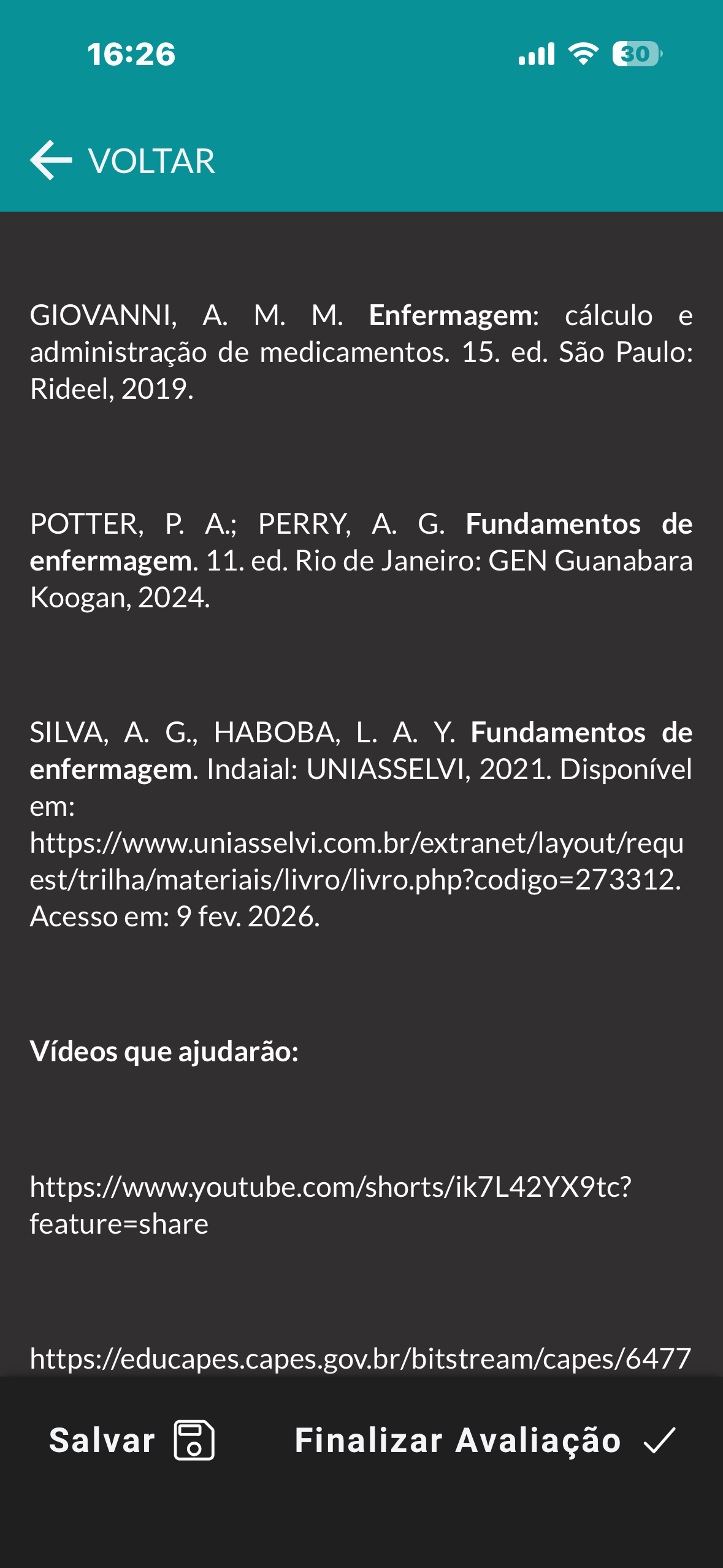 16:26 30 VOLTAR GIOVANNI, A. Enfermagem: cálculo e administração de medicamentos. 15. ed. São Paulo: Rideel, 2019. POTTER, P. A.; PERRY, A. G. Fundamentos de enfermagem. 11. ed. Rio de Janeiro: GEN Guanabara Koogan, 2024. SILVA, A. G., HABOBA, L. A. Y. Fundamentos de enfermagem. Indaial: UNIASSELVI, 2021. Disponível em: https://www.uniasselvi.com.br/extranet/layout/requ est/trilha/materiais/livro/livro.php?codigo=273312. Acesso em: 9 fev. 2026. Vídeos que ajudarão: https://www.youtube.com/shorts/ik7L42YX9tc? feature=share https://educapes.capes.gov.br/bitstream/capes/6477 Salvar Finalizar Avaliação
