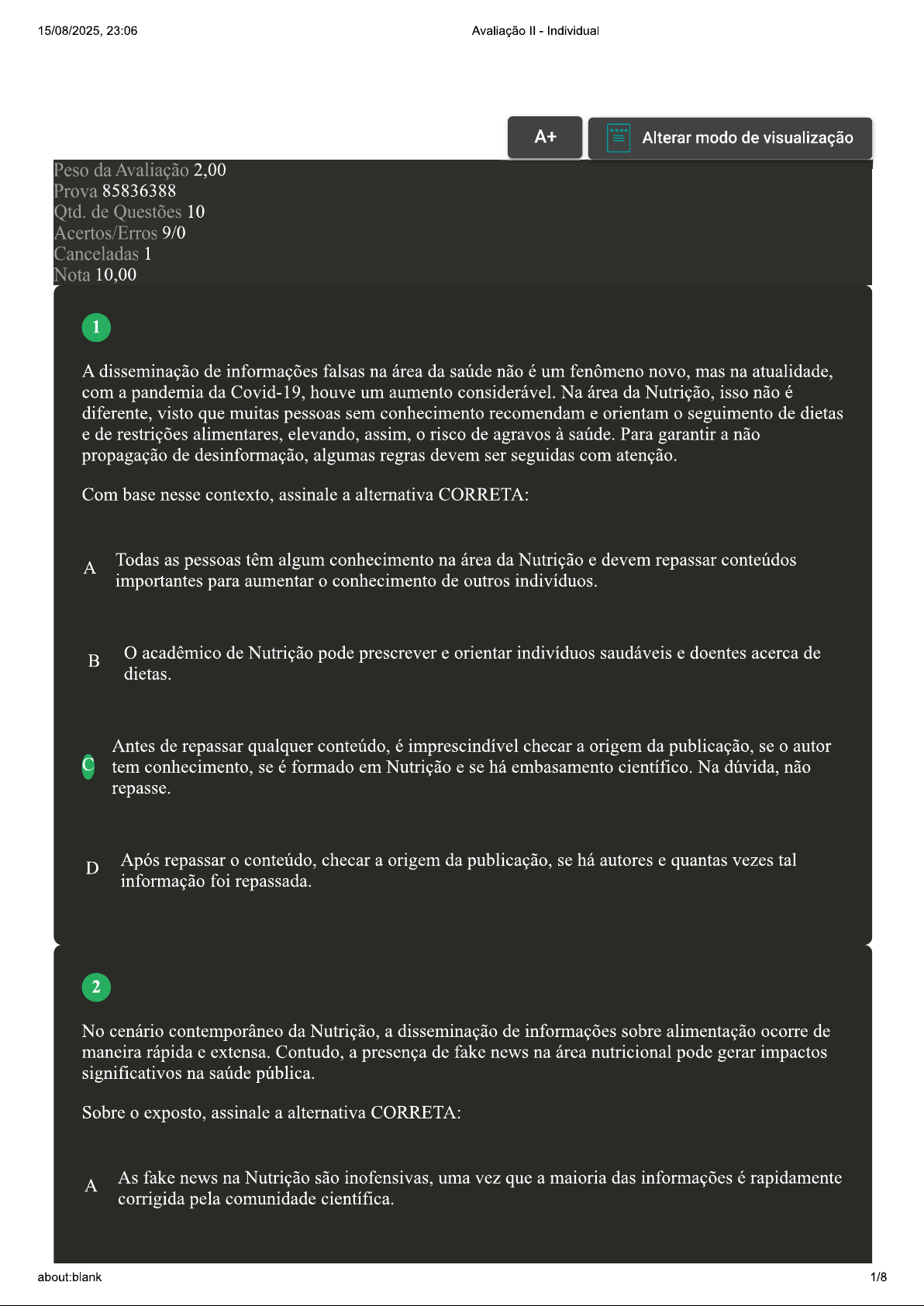 15/08/2025, 23:06 Avaliação Individual A+ Alterar modo de visualização Peso da Avaliação 2,00 Prova 85836388 Qtd. de Questões 10 Acertos/Erros 9/0 Canceladas 1 Nota 10,00 1 A disseminação de informações falsas na área da saúde não é um fenômeno novo, mas na atualidade, com a pandemia da Covid-19, houve um aumento considerável. Na área da Nutrição, isso não é diferente, visto que muitas pessoas sem conhecimento recomendam e orientam o seguimento de dietas e de restrições alimentares, elevando, assim, o risco de agravos à saúde. Para garantir a não propagação de desinformação, algumas regras devem ser seguidas com atenção. Com base nesse contexto, assinale a alternativa CORRETA: A Todas as pessoas têm algum conhecimento na área da Nutrição e devem repassar conteúdos importantes para aumentar o conhecimento de outros indivíduos. acadêmico de Nutrição pode prescrever e orientar indivíduos saudáveis e doentes acerca de dietas. Antes de repassar qualquer conteúdo, é imprescindível checar a origem da publicação, se o autor tem conhecimento, se é formado em Nutrição e se há embasamento científico. Na dúvida, não repasse. D Após repassar o conteúdo, checar a origem da publicação, se há autores e quantas vezes tal informação foi repassada. 2 No cenário contemporâneo da Nutrição, a disseminação de informações sobre alimentação ocorre de maneira rápida e extensa. Contudo, a presença de fake news na área nutricional pode gerar impactos significativos na saúde pública. Sobre o exposto, assinale a alternativa CORRETA: A As fake news na Nutrição são inofensivas, uma vez que a maioria das informações é rapidamente corrigida pela comunidade científica. about:blank 1/815/08/2025, 23:06 Avaliação Individual B Os profissionais de saúde não têm responsabilidade em combater as fake news na Nutrição, pois isso cabe exclusivamente aos órgãos reguladores. A verificação de fontes consulta a profissionais qualificados são medidas não tão eficazes para se proteger contra a influência de fake news na Nutrição. correto é acompanhar as tendências nas mídias sociais, que são atualizadas diariamente. D A disseminação de fake news na Nutrição pode influenciar negativamente as escolhas alimentares, levando a práticas alimentares inadequadas e impactando a saúde das pessoas. 3 cuidado em saúde deve ser pautado em evidências científicas e afastado das doutrinas dogmáticas. Com base na análise criteriosa de artigos científicos, classifique V para as sentenças verdadeiras e F para as falsas: tamanho da amostra não é um fator relevante para a qualidade de um artigo científico. As bases de dados utilizadas e o intervalo de tempo das publicações não são importantes para a avaliação de um artigo de revisão. rigor metodológico empregado na pesquisa e sua descrição detalhada, ausência ou controle de vieses torna o artigo confiável. Assinale a alternativa que apresenta a sequência CORRETA: A B D about:blank 2/815/08/2025, 23:06 Avaliação Individual Atenção: Esta questão foi cancelada, porém a pontuação foi considerada. 4 Considere a complexidade da relação entre conhecimento científico, senso comum, cultura e meio ambiente. Sobre o tema, classifique V para as sentenças verdadeiras e F para as falsas: A confiabilidade do conhecimento científico é inabalável, uma vez que este é produzido por meio de testagens rigorosas, verificação constante e análise metodológica minuciosa, características ausentes no senso comum. As idiossincrasias dos cientistas, incluindo suas experiências pessoais e competência, não exercem influência significativa na expressão tácita do conhecimento, que se baseia nas relações interpessoais entre pesquisadores. As políticas públicas de incentivo à pesquisa, recursos financeiros e tecnológicos são fatores externos que não influenciam as limitações do conhecimento científico gerado em um determinado contexto cultural e ambiental. A expressão explícita do conhecimento, formalizada em publicações científicas, manuais e bases de dados, proporciona uma compreensão mais completa e objetiva, independente das influências culturais e ambientais Assinale a alternativa que apresenta a sequência CORRETA: A V-V-F-F. V-V-F-V. F-F-V-V. D V-F-F-V. 5 artigo científico é uma publicação que apresenta os resultados de uma pesquisa. Discute ideias, métodos, técnicas, processos e resultados nas diversas áreas do conhecimento. Sobre as sessões de um artigo científico, ordene os itens a seguir: about:blank 3/815/08/2025, 23:06 Avaliação Individual I- Resultados. II- Resumo. III- Discussão. IV- Metodologia. Assinale a alternativa que apresenta a sequência CORRETA: A II IV I III. B III - - II - IV I. I III II IV. D IV III I II. 6 termo "nutrição baseada em evidências (NBE)" surgiu recentemente e pode ser definida como a adoção das melhores evidências científicas disponíveis, sistematicamente reunidas, na tomada de decisão na prática clínica e no contexto das políticas públicas (população). Sobre a hierarquia das evidências científicas, ordene os itens a seguir: I- Estudos controlados randomizados. II- Estudos de caso-controle. III- Estudos de coorte. about:blank 4/815/08/2025, 23:06 Avaliação Individual IV- Relatos de caso. Assinale a alternativa que apresenta a sequência CORRETA: A III II IV I. II IV - I III. I III - II IV. D IV III I II. 7 As pesquisas se referem aos mais diversos objetos e perseguem objetivos diferentes, dessa forma, são classificadas de diferentes formas. Cada pesquisa é naturalmente diferente de qualquer outra. Referente à pesquisa quantitativa, analise as afirmativas a seguir: I- Tipo de pesquisa que não faz uso de estatísticas e de recursos, como por exemplo, porcentagem. II- Por meio de questões do tipo "fechadas", apresenta-se um conjunto de alternativas de respostas no intuito de se obter aquela q