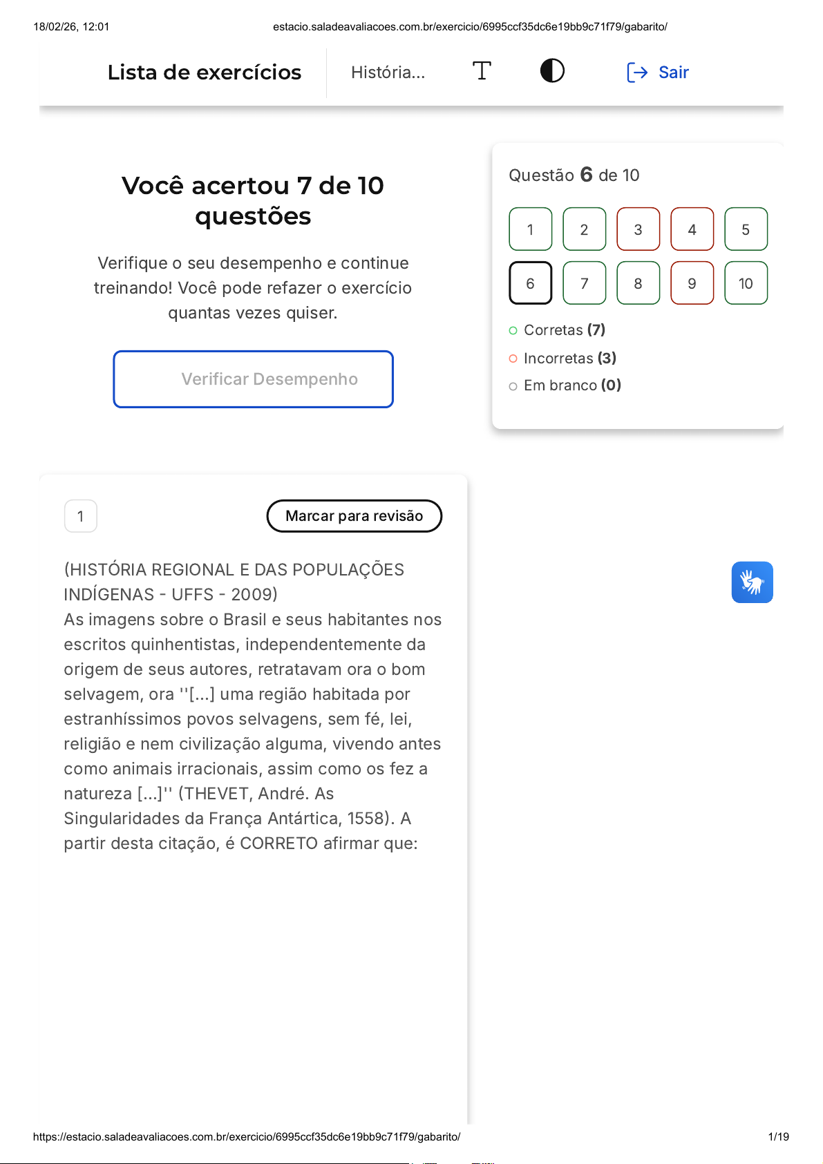Você acertou 7 de 10 questões Verifique o seu desempenho e continue treinando! Você pode refazer o exercício quantas vezes quiser. Verificar Desempenho 1 Marcar para revisão (HISTÓRIA REGIONAL E DAS POPULAÇÕES INDÍGENAS - UFFS - 2009) As imagens sobre o Brasil e seus habitantes nos escritos quinhentistas, independentemente da origem de seus autores, retratavam ora o bom selvagem, ora ''[...] uma região habitada por estranhíssimos povos selvagens, sem fé, lei, religião e nem civilização alguma, vivendo antes como animais irracionais, assim como os fez a natureza [...]'' (THEVET, André. As Singularidades da França Antártica, 1558). A partir desta citação, é CORRETO afirmar que: Questão 6 de 10 Corretas (7) Incorretas (3) Em branco (0) 1 2 3 4 5 6 7 8 9 10 Lista de exercícios História… Sair 18/02/26, 12:01 estacio.saladeavaliacoes.com.br/exercicio/6995ccf35dc6e19bb9c71f79/gabarito/ https://estacio.saladeavaliacoes.com.br/exercicio/6995ccf35dc6e19bb9c71f79/gabarito/ 1/19 A B C D E Os relatos e as imagens elaboradas pelos viajantes e difundidas na Europa eram objetos de curiosidade que aguçavam a imaginação dos leitores e contribuíam para a difusão da imagem dos habitantes do Brasil como povos selvagens e bárbaros. Os relatos serviam apenas para os mercadores difundirem a ideia de que havia muita riqueza a ser explorada numa terra habitada por um povo sem civilização. Os viajantes, missionários e naturalistas descreviam os habitantes, a fauna e a flora unicamente por simples curiosidade. Os relatos sensacionalistas serviam para um maior conhecimento sobre as regiões distantes, mas não despertavam a curiosidade científica dos europeus. Os habitantes integravam a natureza inóspita das florestas e se comportavam de acordo com o meio em que viviam, sem transformá-lo. Resposta correta Parabéns, você selecionou a alternativa correta. Confira o gabarito comentado! Gabarito Comentado 18/02/26, 12:01 estacio.saladeavaliacoes.com.br/exercicio/6995ccf35dc6e19bb9c71f79/gabarito/ https://estacio.saladeavaliacoes.com.br/exercicio/6995ccf35dc6e19bb9c71f79/gabarito/ 2/19 A alternativa correta é a "A". Os relatos e imagens elaborados pelos viajantes e difundidos na Europa eram, de fato, objetos de curiosidade que aguçavam a imaginação dos leitores. Esses relatos e imagens contribuíam para a difusão da imagem dos habitantes do Brasil como povos selvagens e bárbaros. Isso ocorria porque, na época, havia um grande interesse em explorar e entender as novas terras e culturas descobertas. Portanto, esses relatos e imagens não apenas satisfaziam a curiosidade dos europeus, mas também reforçavam a visão eurocêntrica de que esses povos eram "selvagens" e "bárbaros". 2 Marcar para revisão (Adaptada de HISTÓRIA REGIONAL E DAS POPULAÇÕES INDÍGENAS- UFFS - 2009) Assinale a alternativa CORRETA. ''[...] Parecem- me gente de tal inocência que, se homem os entendesse e eles a nós, seriam logo cristãos, porque eles, segundo parece, não têm, nem entendem em nenhuma crença [...] E imprimir- se-á ligeiramente neles qualquer cunho, que lhes quiserem dar. [...]'' (Carta de Pero Vaz de Caminha, de Porto Seguro, 1o de maio de 1500). As primeiras impressões sobre as populações indígenas descrevem-nos vivendo sem crença alguma. Com o passar do tempo essa representação foi se modificando devido: 18/02/26, 12:01 estacio.saladeavaliacoes.com.br/exercicio/6995ccf35dc6e19bb9c71f79/gabarito/ https://estacio.saladeavaliacoes.com.br/exercicio/6995ccf35dc6e19bb9c71f79/gabarito/ 3/19 A B C D E Aos europeus que aprenderam a língua indígena e logo perceberam que os nativos eram ingênuos. Aos nativos Tupiniquins que mostraram-se cruéis e sanguinários em relação aos portugueses. Aos valores cristãos que foram logo adotados pelos indígenas que, entretanto, continuavam sendo poligâmicos, fato que era indiferente ao clero português. À intensificação dos contatos e à resistência dos indígenas na conversão à fé cristã, passando a ser tratados e retratados como o inimigo a vencer e a submeter, o empecilho a eliminar. À aceitação pelos portugueses das práticas religiosas dos indígenas, reconhecendo-as como legítimas. Resposta correta Parabéns, você selecionou a alternativa correta. Confira o gabarito comentado! Gabarito Comentado A alternativa correta é a letra D. A representação dos indígenas foi se modificando ao longo do tempo devido à intensificação dos contatos e à resistência dos indígenas na conversão à fé cristã. Isso fez com que eles passassem a ser tratados 18/02/26, 12:01 estacio.saladeavaliacoes.com.br/exercicio/6995ccf35dc6e19bb9c71f79/gabarito/ https://estacio.saladeavaliacoes.com.br/exercicio/6995ccf35dc6e19bb9c71f79/gabarito/ 4/19 A B e retratados como o inimigo a vencer e a submeter, o empecilho a eliminar. Essa mudança na percepção dos indígenas reflete a dificuldade que os europeus encontraram para impor suas crenças e costumes, bem como a resistência dos povos indígenas em abandonar suas próprias tradições e crenças. 3 Marcar para revisão (Adaptada de UESC-BA¿2007) No Nordeste, a terra é seca E bastante concentrada, Tem caatinga e tem pobreza E uma população desamparada. Mas o solo não é pobre E, quando há chuva, há produção. Do que a população precisa É de uma política de inclusão, Que fixe toda a sua gente Nessa imensa região. Sobre o Nordeste e os problemas retratados nos versos, pode-se concluir que: Mostra uma grande estagnação econômica, devido à ausência das atividades secundárias. Apresenta um grande número de novas fronteiras agrícolas, com predomínio da pecuária intensiva. 18/02/26, 12:01 estacio.saladeavaliacoes.com.br/exercicio/6995ccf35dc6e19bb9c71f79/gabarito/ https://estacio.saladeavaliacoes.com.br/exercicio/6995ccf35dc6e19bb9c71f79/gabarito/ 5/19 C D E É a região mais populosa e povoada do país, todavia, devido às condições naturais, é a de maior repulsão do B