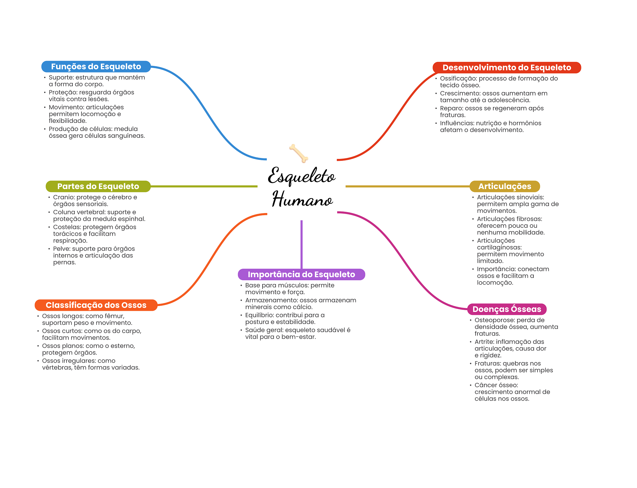 Funções do Esqueleto Desenvolvimento do Esqueleto Suporte: estrutura que mantém Ossificação: processo de formação do a forma do corpo. tecido ósseo. Proteção: resguarda órgãos Crescimento: ossos aumentam em vitais contra lesões. tamanho até a adolescência. Movimento: articulações Reparo: se regeneram após permitem locomoção e fraturas. flexibilidade. Influências: nutrição e hormônios Produção de células: medula afetam desenvolvimento. óssea gera células sanguíneas. Esqueleto Partes do Esqueleto Articulações Cranio: protege cérebro e Humano Articulações sinoviais: órgãos sensoriais. permitem ampla gama de Coluna vertebral: suporte e movimentos. proteção da medula espinhal. Articulações fibrosas: Costelas: protegem órgãos oferecem pouca ou torácicos e facilitam nenhuma mobilidade. respiração. Articulações Pelve: suporte para órgãos cartilaginosas: internos e articulação das permitem movimento pernas. limitado. Importância: conectam Importância do Esqueleto e facilitam a Base para músculos: permite locomoção. movimento e força. Armazenamento: OSSOS armazenam Classificação dos Ossos minerais como cálcio. Doenças Ósseas Ossos longos: como fêmur, contribui para a suportam peso e movimento. postura e estabilidade. Osteoporose: perda de Ossos curtos: como do carpo, Saúde geral: esqueleto saudável é densidade óssea, aumenta fraturas. facilitam movimentos. vital para bem-estar. Artrite: inflamação das Ossos planos: como esterno, articulações, causa dor protegem órgãos. e rigidez. Ossos irregulares: como Fraturas: quebras nos vértebras, têm formas variadas. podem ser simples ou complexas. Câncer ósseo: crescimento anormal de células nos OSSOS.
