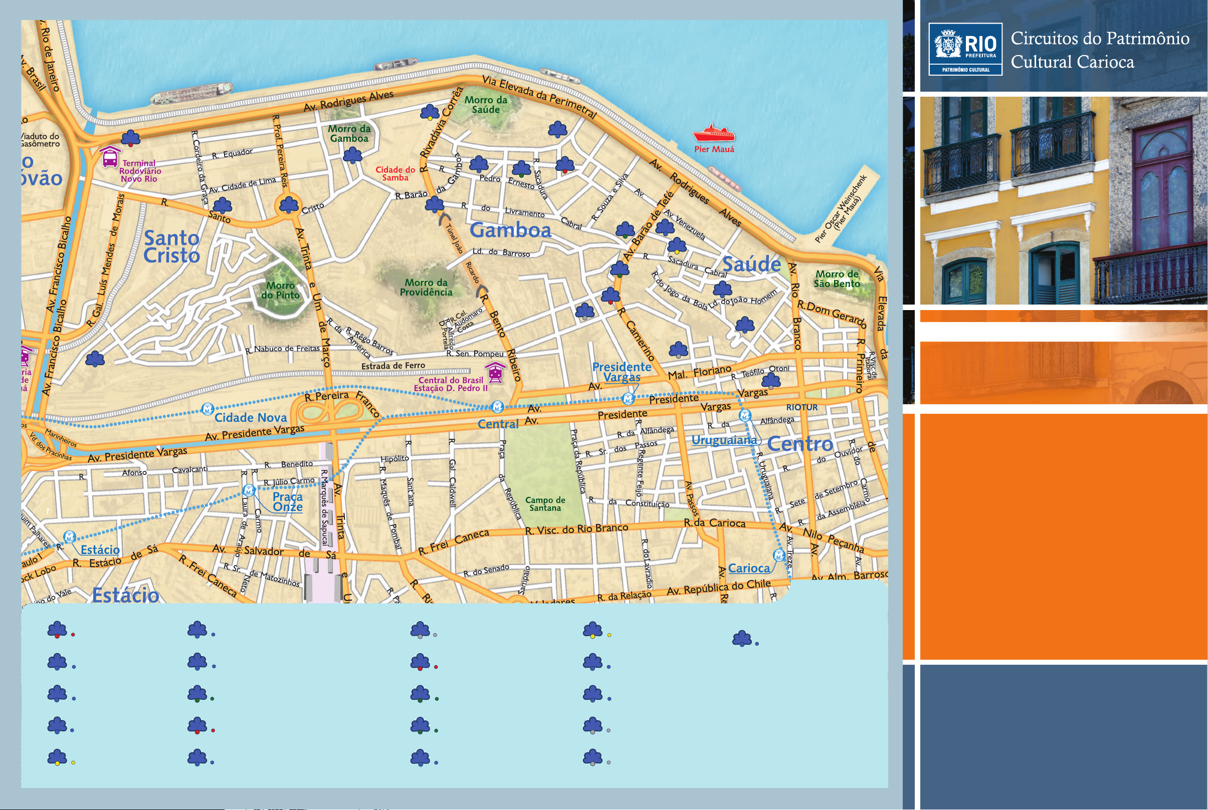 Mapa 1 Centro e Porto- Mapa 2 - Urca ao Leblon Mapa 3 - Glória ao Cosme Velho Mapa 4 - Santa Cruz e Zona Norte A cidade do Rio de Janeiro possui um diferenciado acervo de bens culturais. Devido à sua posição de irradiadora de cultura, foi aqui, que ocorreram diversos fatos significativos para nossa história cultural. É sobre este âmbito que atua o projeto Circuitos do Patrimônio Cultural Carioca. Dentro de onze temas iniciais – samba, bossa nova, choro, bar tradicional, art déco, arquitetura, sítio arqueológico, abastecimento de água, entorno da Praça Tiradentes, Machado de Assis e personagens e acontecimentos notáveis – o Patrimônio Cultural selecionou locais de destaque. Desta maneira, por meio da fixação de uma placa informativa, a Prefeitura promove um ato simbólico que produz na cidade novos documentos- monumentos, reescrevendo o significado destes locais para seus habitantes e promovendo uma nova relação entre eles. Este não é um projeto novo. O antigo Departamento Geral de Patrimônio Cultural iniciou esta prática na década de 1990, com a instalação de placas informativas como parte do projeto “Identificando Bens”. Este ano, o IRPH, Instituto Rio Patrimônio da Humanidade, lança quatro mapas com indicação dos locais das placas colocadas desde a década de 1990 até hoje, como uma síntese de documentos-monumentos da cidade do Rio de Janeiro. Os mapas foram organizados de modo a facilitar o percurso dos visitantes. Em cada um deles é possível destacar a temática predominante. No Centro destacam-se os bares tradicionais, a bossa nova, o choro, o samba, importantes exemplares arquitetônicos e o entorno da Praça Tiradentes. Já no Porto destacam-se os exemplares arquitetônicos, os sítios arqueológicos e os bares tradicionais. IRPH – Instituto Rio Patrimônio da Humanidade Rua Gago Coutinho, 52, 3º andar CEP: 22.221-070 Laranjeiras Rio de Janeiro – RJ Tel: (21) 2976-6626 Fax: (21) 2976-6615 www.rio.rj.gov.br/patrimonio Ano 2012 Textos Leyla Mariath Juliana Oakim Foto Zeca Linhares Prefeito da Cidade do Rio de Janeiro Eduardo Paes Presidente IRPH Washington Menezes Fajardo Secretário da Casa Civil Guilherme Nogueira Schleder Vice-prefeito Carlos Alberto Vieira Muniz Gerente de Cadastro, Pesquisa e Proteção Henrique Costa Fonseca Gerente de Projetos Vanessa Ameixoeira Coordenadora de Projetos e Fiscalização Laura Di Blasi 3434 3535 3636 3737 3838 3939 4040 4141 4242 4343 4444 D is tr ib u iç ã o g ra tu it a 2424 2525 2626 2727 2828 2929 3030 3131 3232 3333 O IRPH agradece a RIOTUR pelo fornecimento do mapa digital/ 2009. linha de carris de Vila Guarani (BTM) Legendas Rua Pedro Alves, 210 - arquitetura BTM - Bem Tombado Municipal BTE - Bem Tombado Estadual BTF - Bem Tombado Federal BCNI - Bem Cultural de Natureza Imaterial CBBT - Cadastro dos Bares e Botequins Tradicionais SA - Sitio Arqueológico 4444 Estação e cocheira da Jardim Suspenso do Valongo (BTF/SA) Rua Camerino - sítio arqueológico3636 Praça Barão de Tefé (SA) Praça Barão de Tefé - sitio arqueológico3737 Praça dos Estivadores Praça dos Estivadores - notáveis3535 Restaurante 28 (CBBT) Rua Barão de São Félix, 28 - bar tradicional3434 Docas D. Pedro II Rua Barão de Tefé - arquitetura3838 Pedra do Sal (BTE) Rua Argemiro Bulcão - samba3939 Serviço Geográfico do Exército (BTF) Rua Major Daemon, 81 - arquitetura4141 Bar do Jóia (CBBT) Rua da Conceição, esquina com a Rua Julia Lopes - bar tradicional4343 Casa Paladino (CBBT) Rua Uruguaiana, 226 - bar tradicional4242 Fortaleza da Conceição (BTF) Praça Major Valô - arquitetura4040 Cemitério dos Ingleses (BTM/BTE) Rua da Gamboa, 181 - arquitetura2929 Igreja de Nossa Senhora da Saúde (BTM/BTF) Rua Silvino Montenegro, s/n - arquitetura3333 Centro Cultural Municipal José Bonifácio (BTM) Rua da Constituição, 48 - arquitetura3030 Cemitério dos Pretos Novos (SA) Rua Pedro Ernesto, 36 - sítio arqueológico3131 Praça Coronel Assunção, antiga Praça da Harmonia Praça Coronel Assunção - notáveis3232 Igreja de Santo Cristo Praça Santo Cristo - arquitetura2626 Cidade do Samba Rua Rivadávia Correa, 6 - samba2828 Profeta Gentileza (BTM) Avenida Rodrigues Alves, s/n - notáveis2424 Escola Benjamim Constant Praça Marechal Hermes, s/n - arquitetura2525 Hospital da Gamboa (BTM) Rua Comendador Leonardo, s/n - arquitetura2727 Adega Flor de Coimbra (CBBT) Rua do Teotônio Regadas, 34 - bar tradicional1616 Armazém Senado (CBBT) Rua Gomes Freire, 256 - bar tradicional1818 Bar Brasil (CBBT) Av. Mem de Sá, 90 - bar tradicional1313 Bar Luiz (BTE / CBBT) Rua da Carioca, 39 - bar tradicional - Pç. Tiradentes33 Centro Cultural Carioca Rua do Teatro, 37 - choro - Pç. Tiradentes55 Centro de Artes Hélio Oiticica Rua Luis de Camões, 68 - arquitetura66 Cosmopolita (CBBT) Travessa do Mosqueira, 4 - bar tradicional1414 Dispensário São Vicente de Paula (BTM) Rua Mem de Sá, 271 - arquitetura2020 Hospital Moncorvo Filho (BTE) Rua Moncorvo Filho, 90 - arquitetura2222 Igreja de Santo Antônio dos Pobres (BTM) Rua dos Inválidos, 42 - arquitetura1919 Nova Capela (CBBT) Avenida Mem de Sá, 96 - bar tradicional1212 Rio Minho (BTF) Rua do Ouvidor, 10 - bar tradicional11 Sociedade Brasileira de Belas Artes (BTE) Rua do Lavradio, 84 - arquitetura1111 Escola Municipal Celestino Silva (BTM) Rua do Lavradio, 56 - arquitetura1010 Guitarra de Prata (BTE) Rua da Carioca, 37 - choro22 - Pç. Tiradentes - samba Casa de Bidu Sayão Rua da Constituição, 48 - Pç. Tiradentes77 - notáveis Faculdade de Direito da UFRJ (BTE) Largo do Caco ou Rua Moncorvo Filho, 2 a 8 - arquitetura2121 Casa Villarino Av. Calógeras, 6b - bossa nova1515 - bar tradicional Clube dos Democráticos (BTM) Rua do Riachuelo, 91/93 - samba1717 - art-déco Teatro Carlos Gomes (BTM) Praça Tiradentes, 19 -art-déco88 -Pç. Tiradentes Zicartola Rua da Carioca, 53 - bar tradicional44 - samba 99 11 22 3344 55 77 88 1010 1111 1212 1313 1414 1515 1616 1717 18181919 