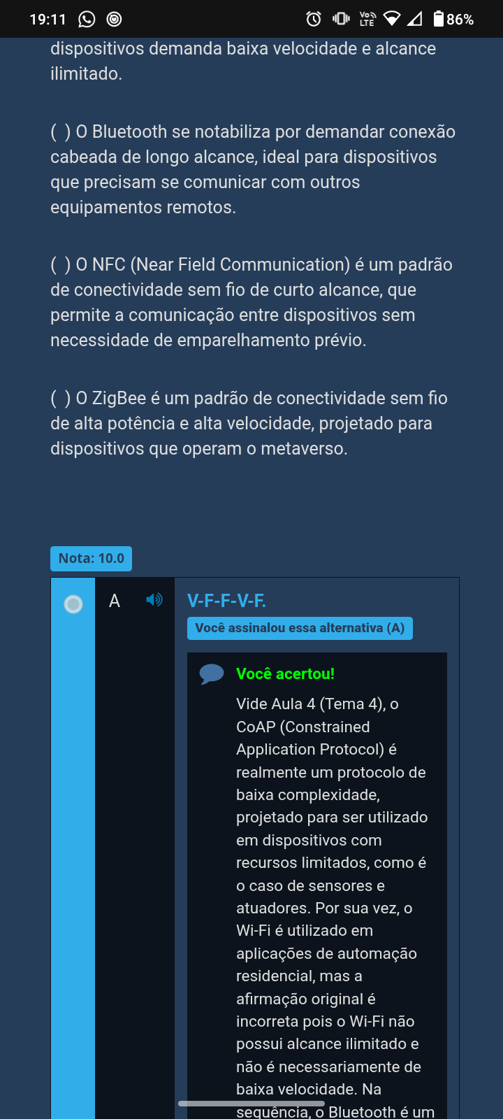 19:11 LTE 86% dispositivos demanda baixa velocidade e alcance ilimitado. 0 Bluetooth se notabiliza por demandar conexão cabeada de longo alcance, ideal para dispositivos que precisam se comunicar com outros equipamentos remotos. NFC (Near Field Communication) é um padrão de conectividade sem fio de curto alcance, que permite a comunicação entre dispositivos sem necessidade de emparelhamento prévio. ZigBee é um padrão de conectividade sem fio de alta potência e alta velocidade, projetado para dispositivos que operam metaverso. Nota: 10.0 A V-F-F-V-F. Você assinalou essa alternativa (A) Você acertou! Vide Aula 4 (Tema 4), CoAP (Constrained Application Protocol) é realmente um protocolo de baixa complexidade, projetado para ser utilizado em dispositivos com recursos limitados, como é caso de sensores e atuadores. Por sua vez, Wi-Fi é utilizado em aplicações de automação residencial, mas a afirmação original é incorreta pois Wi-Fi não possui alcance ilimitado e não é necessariamente de baixa velocidade. Na sequência, Bluetooth é um