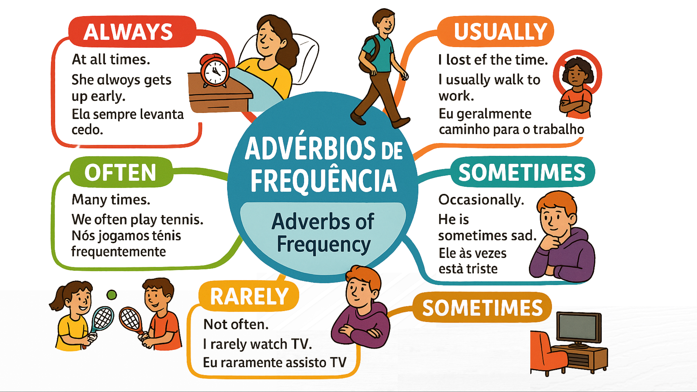 ALWAYS USUALLY At all times. I lost ef the time. She alwoys gets I usually walk to up early. work. Ela sempre levanta Eu geralmente cedo. caminho para o trabalho ADVÉRBIOS DE OFTEN FREQUÊNCIA SOMETIMES Many times. Occasionally. We often play tennis. Adverbs of He is Nós jogamos ténis sometimes sad. frequentemente Frequency Ele às vezes està triste RARELY SOMETIMES Not often. I rarely watch TV. Eu raramente assisto TV