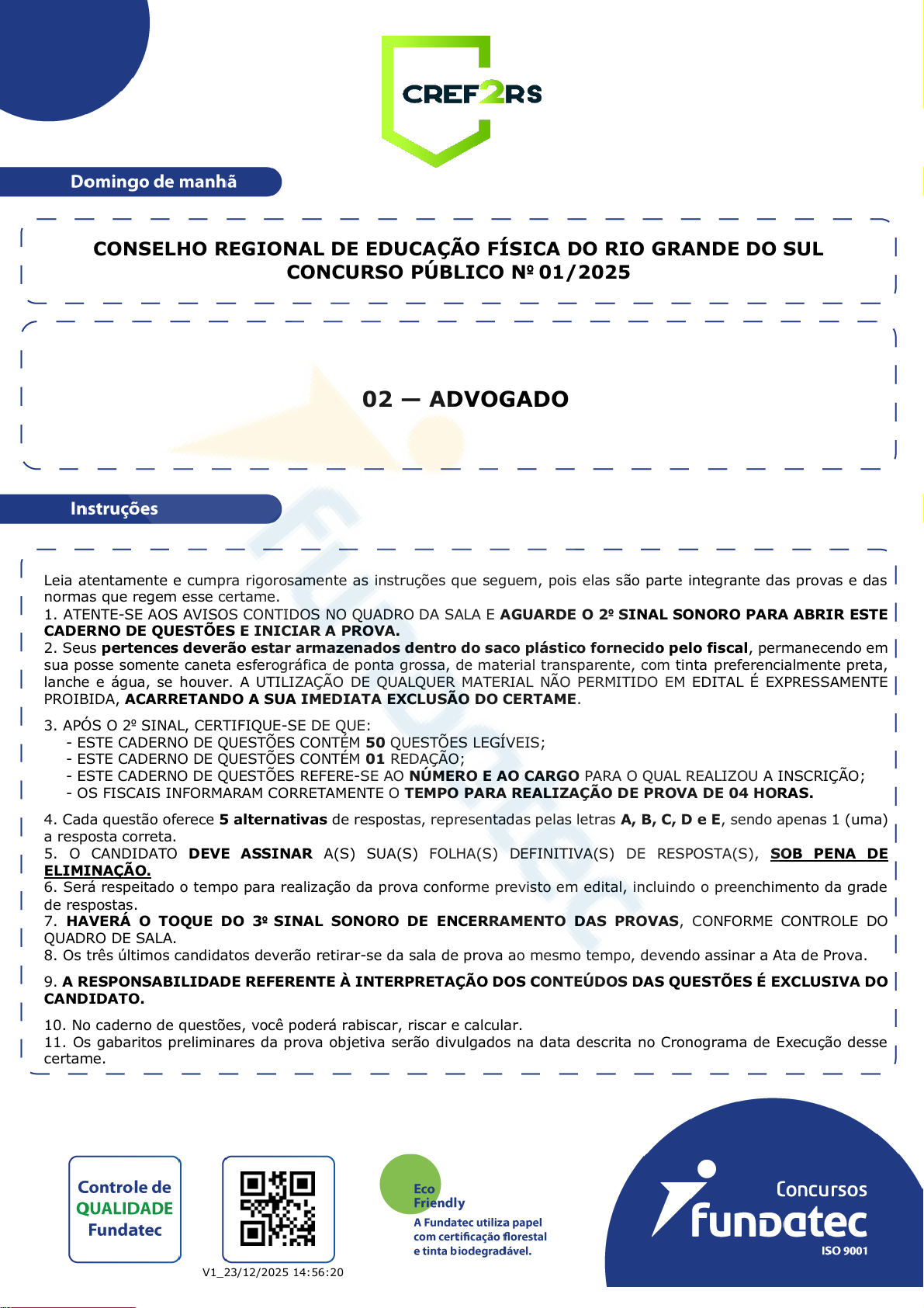pcimarkpci MDAwMDowMDAwOjAwMDA6MDAwMDowMDAwOmZmZmY6YmQ1MDplYjdh:V2VkLCAxOCBGZWIgMjAyNiAxNDoxNDowMCAtMDMwMA== www.pciconcursos.com.br CONSELHO REGIONAL DE EDUCAÇÃO FÍSICA DO RIO GRANDE DO SUL CONCURSO PÚBLICO Nº 01/2025 02 — ADVOGADO QR code V1_23/12/2025 14:56:20 Leia atentamente e cumpra rigorosamente as instruções que seguem, pois elas são parte integrante das provas e das normas que regem esse certame. 1. ATENTE-SE AOS AVISOS CONTIDOS NO QUADRO DA SALA E AGUARDE O 2º SINAL SONORO PARA ABRIR ESTE CADERNO DE QUESTÕES E INICIAR A PROVA. 2. Seus pertences deverão estar armazenados dentro do saco plástico fornecido pelo fiscal, permanecendo em sua posse somente caneta esferográfica de ponta grossa, de material transparente, com tinta preferencialmente preta, lanche e água, se houver. A UTILIZAÇÃO DE QUALQUER MATERIAL NÃO PERMITIDO EM EDITAL É EXPRESSAMENTE PROIBIDA, ACARRETANDO A SUA IMEDIATA EXCLUSÃO DO CERTAME. 3. APÓS O 2º SINAL, CERTIFIQUE-SE DE QUE: - ESTE CADERNO DE QUESTÕES CONTÉM 50 QUESTÕES LEGÍVEIS; - ESTE CADERNO DE QUESTÕES CONTÉM 01 REDAÇÃO; - ESTE CADERNO DE QUESTÕES REFERE-SE AO NÚMERO E AO CARGO PARA O QUAL REALIZOU A INSCRIÇÃO; - OS FISCAIS INFORMARAM CORRETAMENTE O TEMPO PARA REALIZAÇÃO DE PROVA DE 04 HORAS. 4. Cada questão oferece 5 alternativas de respostas, representadas pelas letras A, B, C, D e E, sendo apenas 1 (uma) a resposta correta. 5. O CANDIDATO DEVE ASSINAR A(S) SUA(S) FOLHA(S) DEFINITIVA(S) DE RESPOSTA(S), SOB PENA DE ELIMINAÇÃO. 6. Será respeitado o tempo para realização da prova conforme previsto em edital, incluindo o preenchimento da grade de respostas. 7. HAVERÁ O TOQUE DO 3º SINAL SONORO DE ENCERRAMENTO DAS PROVAS, CONFORME CONTROLE DO QUADRO DE SALA. 8. Os três últimos candidatos deverão retirar-se da sala de prova ao mesmo tempo, devendo assinar a Ata de Prova. 9. A RESPONSABILIDADE REFERENTE À INTERPRETAÇÃO DOS CONTEÚDOS DAS QUESTÕES É EXCLUSIVA DO CANDIDATO. 10. No caderno de questões, você poderá rabiscar, riscar e calcular. 11. Os gabaritos preliminares da prova objetiva serão divulgados na data descrita no Cronograma de Execução desse certame. pcimarkpci MDAwMDowMDAwOjAwMDA6MDAwMDowMDAwOmZmZmY6YmQ1MDplYjdh:V2VkLCAxOCBGZWIgMjAyNiAxNDoxNDowMCAtMDMwMA== www.pciconcursos.com.br RASCUNHO Utilize esse espaço para anotar suas respostas *A anotação neste rascunho NÃO substitui o preenchimento da grade de respostas. 01 02 03 04 05 06 07 08 09 10 11 12 13 14 15 16 17 18 19 20 21 22 23 24 25 26 27 28 29 30 31 32 33 34 35 36 37 38 39 40 41 42 43 44 45 46 47 48 49 50 51 52 53 54 55 56 57 58 59 60 61 62 63 64 65 66 67 68 69 70 71 72 73 74 75 76 77 78 79 80 81 82 83 84 85 86 87 88 89 90 91 92 93 94 95 96 97 98 99 100 pcimarkpci MDAwMDowMDAwOjAwMDA6MDAwMDowMDAwOmZmZmY6YmQ1MDplYjdh:V2VkLCAxOCBGZWIgMjAyNiAxNDoxNDowMCAtMDMwMA== www.pciconcursos.com.br 1024_BASE_NS_DM 09/01/2026 11:27:20 Execução: Fundatec NÍVEL SUPERIOR LÍNGUA PORTUGUESA Esporte ajuda a formar jovens mais seguros e preparados para o futuro Por Fernanda Bertin Quinta 01 02 03 04 05 06 07 08 09 10 11 12 13 14 15 16 17 18 19 20 21 22 23 24 Conforme o Instituto Brasileiro de Geografia e Estatística (IBGE), em 2024, 8,7 milhões de jovens entre 14 e 29 anos não completaram o Ensino Médio por terem abandonado a escola ou nunca a terem frequentado. Ainda, o órgão aponta que cerca de 84% dos jovens no país são inativos fisicamente. Esse cenário acende um alerta sobre temas como ______ escolar, insegurança emocional e exposição a comportamentos de risco. Mesmo em meio a tantos desafios, o esporte surge como uma ferramenta acessível e eficiente para fortalecer crianças e adolescentes. Mais do que movimentar o corpo, ele ajuda a criar vínculos, organizar a rotina e desenvolver habilidades ____________. O esporte ensina disciplina, foco, tomada de decisão e convivência coletiva — pilares essenciais na formação de jovens. Mario Sérgio Andrade Silva, consultor da AES Impulso, explica que a prática vai além da competição: “O esporte desperta ____________ e ensina virtudes para a vida, como respeito e resiliência. Os jovens aprendem a lidar com frustrações e a superar obstáculos internos e externos”. Benefícios comprovados para famílias e jovens O relatório “The generational ROI of youth sports” da First Tee e da Harris Poll, com pesquisa realizada com responsáveis por crianças e adolescentes, aponta que: 92% ............. que o esporte ajuda a desenvolver ________; 90% ............. que ele ensina habilidades para a vida; 88% ............. a prática esportiva no orçamento familiar, mesmo em momentos desafiadores; Mais de 90% dos pais de adultos reconhecem impactos positivos anos depois da infância. Esses dados reforçam a ideia de que a atividade física regular contribui para o bem-estar emocional, melhora a autoestima e cria hábitos que acompanham o jovem até a vida adulta. (Disponível em: https://gauchazh.clicrbs.com.br/donna/noticia/2025/12 – texto adaptado especialmente para esta prova). QUESTÃO 01 – Assinale a alternativa que preenche, correta e respectivamente, as lacunas tracejadas das linhas 04, 08, 12 e 18. A) invasão – socioemocionais – auto-confiança – caráter B) evazão – socio-emocionais – autoconfiança – carácter C) evasão – socioemocionais – auto-confiança – caráter D) invasão – socio-emocionais – autoconfiança – carácter E) evasão – socioemocionais – autoconfiança – caráter QUESTÃO 02 – Sobre o completamento das lacunas pontilhadas do fragmento de texto abaixo pelos verbos “acreditar”, “afirmar” e “manter”, respectivamente, analise as assertivas abaixo: 92% ............. que o esporte ajuda a desenvolver ________; 90% ............. que ele ensina habilidades para a vida; 88% ............. a prática esportiva no orçamento familiar, mesmo em momentos desafiadores; I. Devido à ocorrência de sujeito representado por po