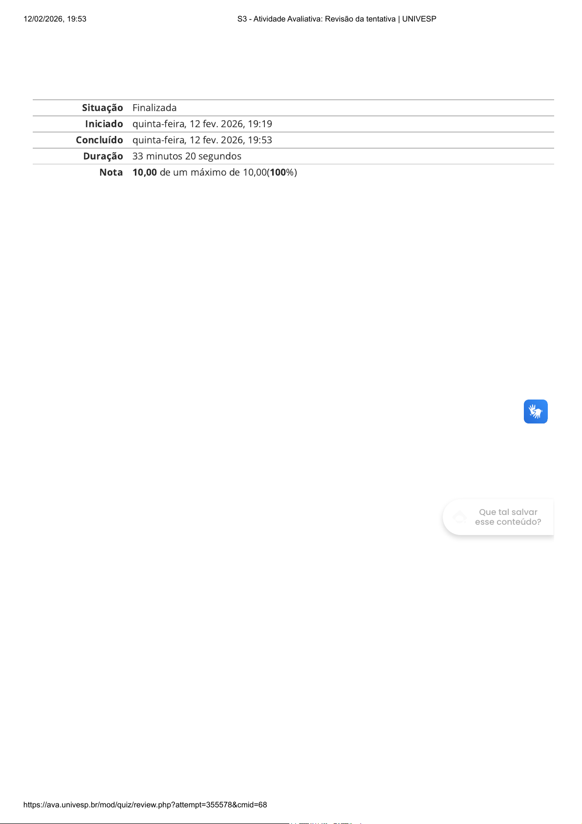 Situação Finalizada Iniciado quinta-feira, 12 fev. 2026, 19:19 Concluído quinta-feira, 12 fev. 2026, 19:53 Duração 33 minutos 20 segundos Nota 10,00 de um máximo de 10,00(100%) Que tal salvar esse conteúdo? 12/02/2026, 19:53 S3 - Atividade Avaliativa: Revisão da tentativa | UNIVESP https://ava.univesp.br/mod/quiz/review.php?attempt=355578&cmid=68567 1/5 Questão 1 Completo Atingiu 2,50 de 2,50 A BNCC estabelece competências gerais que devem ser integradas de forma abrangente e prática ao currículo esco promover uma educação de qualidade e completa, contemplando diversos aspectos do desenvolvimento dos aluno assegurando a formação de cidadãos críticos e responsáveis (Brasil, 2018). BRASIL. Ministério da Educação. Base Nacional Comum Curricular. Brasília, DF, 2018. Com relação a este contexto e sobre o conteúdo estudado, analise as asserções a seguir e a relação proposta entre I. A Base Nacional Comum Curricular (BNCC) promove uma formação educacional integral e holística ao desenvolve conjunto amplo e diversificado de competências que transcendem o mero conhecimento acadêmico tradicional, incorporando dimensões sociais, emocionais e práticas no currículo escolar. PORQUE II. As competências gerais definidas pela BNCC incluem, entre outras, habilidades essenciais para o século XXI, com empatia, a comunicação eficaz, a resolução de problemas complexos, e a capacidade de adaptar-se a contextos var desafiadores, visando preparar os alunos para uma vida plena e produtiva tanto no âmbito pessoal quanto profissi A respeito dessas asserções assinale a alternativa correta: a. A asserção I é uma proposição verdadeira, e a II é uma proposição falsa. b. As asserções I e II são falsas. c. As asserções I e II são proposições verdadeiras, e a II é uma justificativa da I. d. As asserções I e II são proposições verdadeiras, mas a II não é uma justificativa da I. e. A asserção I é uma proposição falsa, e a II é uma proposição verdadeira. Que tal salvar esse conteúdo? 12/02/2026, 19:53 S3 - Atividade Avaliativa: Revisão da tentativa | UNIVESP https://ava.univesp.br/mod/quiz/review.php?attempt=355578&cmid=68567 2/5 Questão 2 Completo Atingiu 2,50 de 2,50 Leia o trecho abaixo: "Na paisagem diversificada da educação brasileira, três documentos se destacam como faróis guiando o caminho d profissionais da educação: a Base Nacional Comum Curricular (BNCC), o Currículo Paulista e o Projeto Político-Peda (PPP). Cada um, a sua maneira, contribui para moldar a experiência educativa no país, mas como exatamente eles s entrelaçam?" (Telles, [2024], p.1). Com base nesse contexto, assinale a alternativa correta sobre a inter-relação entre esses documentos educacionais a. A BNCC é um documento normativo que define os aprendizados essenciais, enquanto o Currículo Paulista s dessas diretrizes por questões regionais específicas. b. O Currículo Paulista é um exemplo de aplicação regional da BNCC, sendo ajustado às necessidades e ao con estado de São Paulo. c. A BNCC não está fundamentada na Constituição Brasileira de 1988 e na Lei de Diretrizes e Bases da Educaç Brasileira de 1996. d. O Projeto Político-Pedagógico (PPP) é elaborado por cada escola de forma independente e sem qualquer re direta com a BNCC. e. O Currículo Paulista e o PPP são desenvolvidos sem a necessidade de considerar as diretrizes estabelecidas BNCC. Que tal salvar esse conteúdo? 12/02/2026, 19:53 S3 - Atividade Avaliativa: Revisão da tentativa | UNIVESP https://ava.univesp.br/mod/quiz/review.php?attempt=355578&cmid=68567 3/5 Questão 3 Completo Atingiu 2,50 de 2,50 Leia o trecho abaixo: "A implementação da Base Nacional Comum Curricular é um movimento significativo na educação brasileira, trazen impactos profundos e multifacetados para professores, estudantes, instituições educacionais, e todos os envolvido processo educacional da educação básica." (Telles, [2024], p.3). Com relação a este tema, observe as afirmativas a seguir: I. A BNCC propõe uma transformação significativa nas metodologias de ensino dos professores, focando no desenv de competências e habilidades essenciais para o século XXI. II. A implementação da BNCC promove um aprendizado limitado à memorização de conteúdos, sem incentivar o pe crítico e a resolução de problemas. III. A sinergia entre a BNCC, o Currículo Paulista e o Projeto Político-Pedagógico visa uma educação mais coesa e ad atendendo às necessidades específicas das comunidades escolares. Está correto o que se afirma em: a. I e III, apenas. b. II e III, apenas. c. I, apenas. d. I e II, apenas. e. I, II e III. Que tal salvar esse conteúdo? 12/02/2026, 19:53 S3 - Atividade Avaliativa: Revisão da tentativa | UNIVESP https://ava.univesp.br/mod/quiz/review.php?attempt=355578&cmid=68567 4/5 Questão 4 Completo Atingiu 2,50 de 2,50 Leia o trecho abaixo: A BNCC estabelece competências que devem ser desenvolvidas de maneira integrada e prática, promovendo um aprendizado que transcenda o conteúdo teórico, englobando habilidades aplicáveis em contextos reais e preparan alunos para os desafios da vida contemporânea e futura. BRASIL. Ministério da Educação. Base Nacional Comum Curricular. Com relação a este tema, observe as afirmativas a seguir: I. A competência de cultura digital implica a habilidade de utilizar tecnologias de forma crítica e ética, englobando a compreensão das suas implicações sociais e a capacidade de criar conteúdos digitais inovadores e responsáveis. II. A competência de comunicação envolve a capacidade de expressar e compartilhar informações de maneira clara utilizando múltiplas linguagens e tecnologias para alcançar uma compreensão mútua eficaz em diversos contextos. III. A competência de autoconhecimento e autocuidado enfatiza o desenvolvimento integral dos alunos, abarcando emocionais, físicos e sociais, e promovendo a capacidade de gerir 