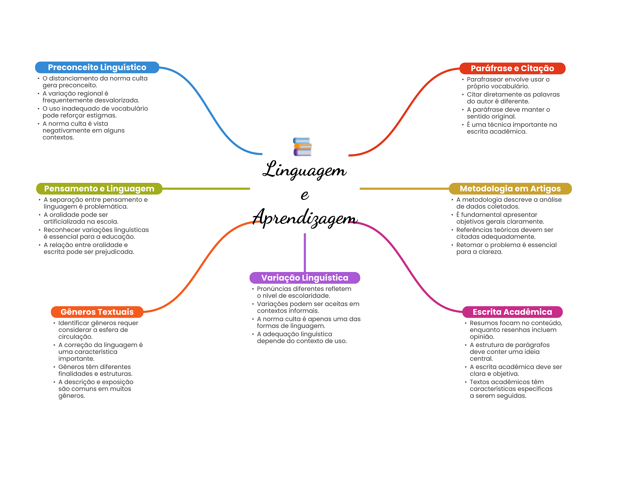 Preconceito Linguístico Paráfrase e Citação distanciamento da norma culta Parafrasear envolve usar gera preconceito. próprio vocabulário. A variação regional é Citar diretamente as palavras frequentemente desvalorizada. do autor é diferente. uso inadequado de vocabulário A paráfrase deve manter pode reforçar estigmas. sentido original. A norma culta é vista É uma técnica importante na negativamente em alguns escrita acadêmica. contextos. Linguagem Pensamento e Linguagem Metodologia em Artigos e A separação entre pensamento e A metodologia descreve a análise linguagem é problemática. de dados coletados. A oralidade pode ser Aprendizagem É fundamental apresentar artificializada na escola. objetivos gerais claramente. Reconhecer variações linguísticas Referências teóricas devem ser é essencial para a educação. citadas adequadamente. A relação entre oralidade e Retomar problema é essencial escrita pode ser prejudicada. para a clareza. Variação Linguística Pronúncias diferentes refletem O nível de escolaridade. Variações podem ser aceitas em Gêneros Textuais contextos informais. Escrita Acadêmica A norma culta é apenas uma das Identificar gêneros requer considerar a esfera de formas de linguagem. Resumos focam no conteúdo, enquanto resenhas incluem circulação. A adequação linguística opinião. depende do contexto de uso. A correção da linguagem é A estrutura de parágrafos uma característica deve conter uma ideia importante. central. Gêneros têm diferentes A escrita acadêmica deve ser finalidades e estruturas. clara e objetiva. A descrição e exposição Textos acadêmicos têm são comuns em muitos características específicas gêneros. a serem seguidas.