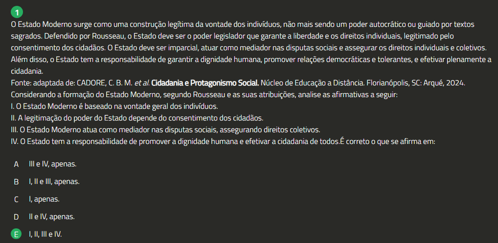 1 0 Estado Moderno surge como uma construção legítima da vontade dos indivíduos, não mais sendo um poder autocrático ou guiado por textos sagrados. Defendido por Rousseau, 0 Estado deve ser 0 poder legislador que garante a liberdade e direitos individuais, legitimado pelo consentimento dos cidadãos. 0 Estado deve ser imparcial, atuar como mediador nas disputas sociais e assegurar direitos individuais e coletivos. Além disso, 0 Estado tem a responsabilidade de garantir a dignidade humana, promover relações democráticas e tolerantes, e efetivar plenamente a cidadania. Fonte: adaptada de: CADORE, et al. Cidadania e Protagonismo Social. Núcleo de Educação a Distância. Florianópolis, SC: Arqué, 2024. Considerando a formação do Estado Moderno, segundo Rousseau e as suas atribuições, analise as afirmativas a seguir: 1.0 Estado Moderno é baseado na vontade geral dos indivíduos. II. A legitimação do poder do Estado depende do consentimento dos cidadãos. III. 0 Estado Moderno atua como mediador nas disputas sociais, assegurando direitos coletivos. IV. 0 Estado tem a responsabilidade de promover a dignidade humana e efetivar a cidadania de todos.É correto que se afirma em: A III e IV, apenas. I, e III, apenas. I, apenas. D e IV, apenas. E I, II, III e IV.
