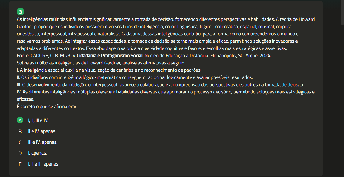 3 As inteligências múltiplas influenciam significativamente a tomada de decisão, fornecendo diferentes perspectivas e habilidades. A teoria de Howard Gardner propõe que indivíduos possuem diversos tipos de inteligência, como linguística, lógico-matemática, espacial, musical, corporal- cinestésica, interpessoal, intrapessoal e naturalista. Cada uma dessas inteligências contribui para a forma como compreendemos 0 mundo e resolvemos problemas. Ao integrar essas capacidades, a tomada de decisão se torna mais ampla e eficaz, permitindo soluções inovadoras e adaptadas a diferentes contextos. Essa abordagem valoriza a diversidade cognitiva e favorece escolhas mais estratégicas e assertivas. Fonte: CADORE, C.B. M. et al. Cidadania e Protagonismo Social. Núcleo de Educação a Distância. Florianópolis, SC: Arqué, 2024. Sobre as múltiplas inteligências de Howard Gardner, analise as afirmativas a seguir: I. A inteligência espacial auxilia na visualização de cenários e no reconhecimento de padrões. II. Os indivíduos com inteligência lógico-matemática conseguem raciocinar logicamente e avaliar possíveis resultados. III. 0 desenvolvimento da inteligência interpessoal favorece a colaboração e a compreensão das perspectivas dos outros na tomada de decisão. IV. As diferentes inteligências múltiplas oferecem habilidades diversas que aprimoram processo decisório, permitindo soluções mais estratégicas e eficazes. É correto 0 que se afirma em: A I, II, III e IV. e IV, apenas. III e IV, apenas. D I, apenas. E I, e III, apenas.