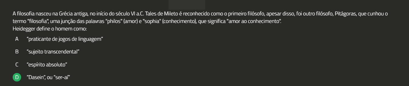A filosofia nasceu na Grécia antiga, no início do século VI a.C. Tales de Mileto é reconhecido como 0 primeiro filósofo, apesar disso, foi outro filósofo, Pitágoras, que cunhou 0 termo "filosofia", uma junção das palavras "philos" (amor) e "sophia" (conhecimento), que significa "amor ao conhecimento". Heidegger define 0 homem como: A "praticante de jogos de linguagem" "sujeito transcendental" C "espirito absoluto" D "Dasein", ou "ser-ai"