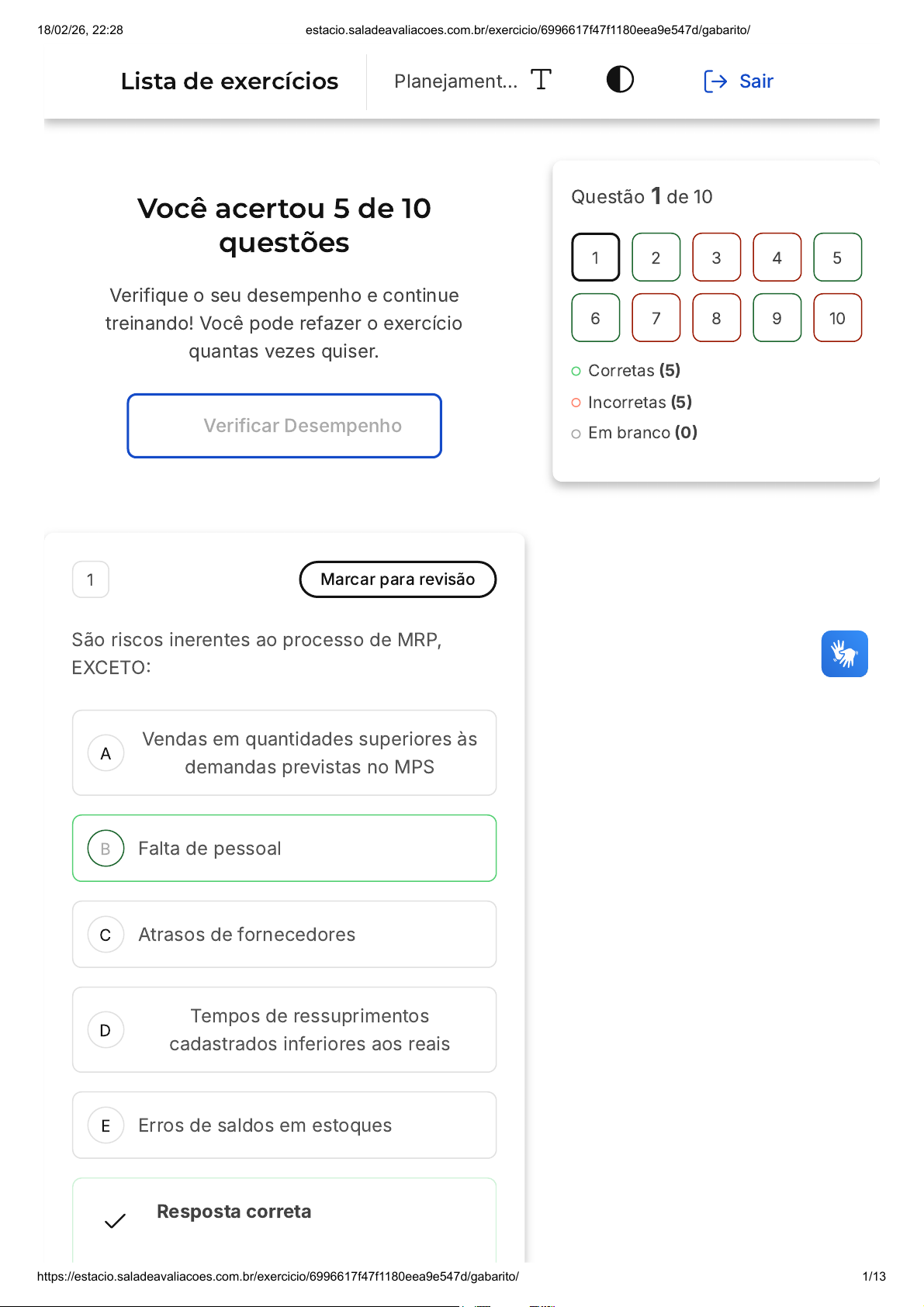Você acertou 5 de 10 questões Verifique o seu desempenho e continue treinando! Você pode refazer o exercício quantas vezes quiser. Verificar Desempenho A B C D E 1 Marcar para revisão São riscos inerentes ao processo de MRP, EXCETO: Vendas em quantidades superiores às demandas previstas no MPS Falta de pessoal Atrasos de fornecedores Tempos de ressuprimentos cadastrados inferiores aos reais Erros de saldos em estoques Resposta correta Questão 1 de 10 Corretas (5) Incorretas (5) Em branco (0) 1 2 3 4 5 6 7 8 9 10 Lista de exercícios Planejament… Sair 18/02/26, 22:28 estacio.saladeavaliacoes.com.br/exercicio/6996617f47f1180eea9e547d/gabarito/ https://estacio.saladeavaliacoes.com.br/exercicio/6996617f47f1180eea9e547d/gabarito/ 1/13 A B C Parabéns, você selecionou a alternativa correta. Confira o gabarito comentado! Gabarito Comentado O MRP (Planejamento de Necessidades de Materiais) é um sistema de controle de produção que tem como objetivo principal determinar a quantidade de cada item que deve ser produzido e o momento adequado para a produção. Os riscos inerentes a esse processo incluem vendas em quantidades superiores às demandas previstas, atrasos de fornecedores, tempos de ressuprimentos cadastrados inferiores aos reais e erros de saldos em estoques. No entanto, a falta de pessoal não é um risco inerente ao processo de MRP, pois este é um sistema que depende mais da precisão das informações e do planejamento do que do número de pessoas envolvidas. Portanto, a alternativa correta é a "B". 2 Marcar para revisão Os Sistemas de Planejamento dos Recursos de Manufatura são conhecidos pela sigla: ERP ECR CRM 18/02/26, 22:28 estacio.saladeavaliacoes.com.br/exercicio/6996617f47f1180eea9e547d/gabarito/ https://estacio.saladeavaliacoes.com.br/exercicio/6996617f47f1180eea9e547d/gabarito/ 2/13 D E A B C MRP MRP II Resposta correta Parabéns, você selecionou a alternativa correta. Confira o gabarito comentado! Gabarito Comentado A sigla MRP II representa os Sistemas de Planejamento dos Recursos de Manufatura. Esses sistemas são uma evolução do MRP (Planejamento de Necessidades de Materiais) e incluem outras funções além do planejamento de produção, como planejamento financeiro e de recursos humanos. Portanto, a alternativa correta é a letra E, que indica a sigla MRP II. 3 Marcar para revisão São saídas do Sistema MRP: Ordens Firmes Ordens Planejadas Pedidos de Compras 18/02/26, 22:28 estacio.saladeavaliacoes.com.br/exercicio/6996617f47f1180eea9e547d/gabarito/ https://estacio.saladeavaliacoes.com.br/exercicio/6996617f47f1180eea9e547d/gabarito/ 3/13 D E A B C Programação de Produção Informações de capacidade Resposta incorreta Opa! A alternativa correta é a letra B. Confira o gabarito comentado! Gabarito Comentado O Sistema MRP (Planejamento de Recursos de Manufatura) é uma ferramenta de controle de produção que tem como objetivo principal determinar a quantidade de cada item que deve ser produzido e o momento adequado para a produção. Dentre as saídas desse sistema, estão as Ordens Planejadas, que são planos de produção futuros, ainda não liberados para o chão de fábrica. Portanto, a alternativa correta é a "Ordens Planejadas". 4 Marcar para revisão O MRP surgiu da necessidade em se planejar materiais de demanda: Dependente Independente Intermitente 18/02/26, 22:28 estacio.saladeavaliacoes.com.br/exercicio/6996617f47f1180eea9e547d/gabarito/ https://estacio.saladeavaliacoes.com.br/exercicio/6996617f47f1180eea9e547d/gabarito/ 4/13 D E Aleatórias Cíclicas Resposta incorreta Opa! A alternativa correta é a letra A. Confira o gabarito comentado! Gabarito Comentado O MRP (Material Requirement Planning ou Planejamento das Necessidades de Materiais) foi desenvolvido para auxiliar no planejamento de materiais de demanda dependente. A demanda dependente é aquela que está diretamente ligada à demanda de outros itens. Por exemplo, a demanda por pneus em uma fábrica de carros é dependente da quantidade de carros que serão produzidos. Portanto, a alternativa correta é a "Dependente". 5 Marcar para revisão O MRP (Material Requirements Planning - Planejamento das Necessidades de Materiais) é uma ferramenta que permite que as empresas efetuem o planejamento de todos os seus materiais. Como resultados gerados pelo MRP, podemos esperar: 18/02/26, 22:28 estacio.saladeavaliacoes.com.br/exercicio/6996617f47f1180eea9e547d/gabarito/ https://estacio.saladeavaliacoes.com.br/exercicio/6996617f47f1180eea9e547d/gabarito/ 5/13 A B C D E Ordens de venda. Ordens de compra. Ordens de ação. Ordens de embargo. Ordens de estoque. Resposta correta Parabéns, você selecionou a alternativa correta. Confira o gabarito comentado! Gabarito Comentado O MRP é uma ferramenta de planejamento que gera Ordens de Compra e Ordens de Produção para todos os itens que a empresa necessita, sejam eles comprados ou fabricados. Essas ordens indicam as quantidades necessárias e as datas de início e término de cada material, abrangendo desde as matérias-primas até os produtos acabados. Além disso, o MRP também realiza todos os replanejamentos necessários em função de alterações de datas de entrega e cancelamento de pedidos de produtos acabados. Portanto, dentre as opções apresentadas, a alternativa B, "Ordens de compra", é a que melhor representa um resultado gerado pelo MRP. 18/02/26, 22:28 estacio.saladeavaliacoes.com.br/exercicio/6996617f47f1180eea9e547d/gabarito/ https://estacio.saladeavaliacoes.com.br/exercicio/6996617f47f1180eea9e547d/gabarito/ 6/13 A B C D E 6 Marcar para revisão O MRP (Material Requirements Planning - Planejamento das Necessidades de Materiais) é uma ferramenta que permite que as empresas efetuem o planejamento de todos os seus materiais. Acerca do MRP, marque V, para verdadeiro e F, para falso, para as afirmativas abaixo: ( ) O MRP permite determinar o que, quando, quanto produzir e comprar. ( ) O MRP permite apenas o necessário e ape