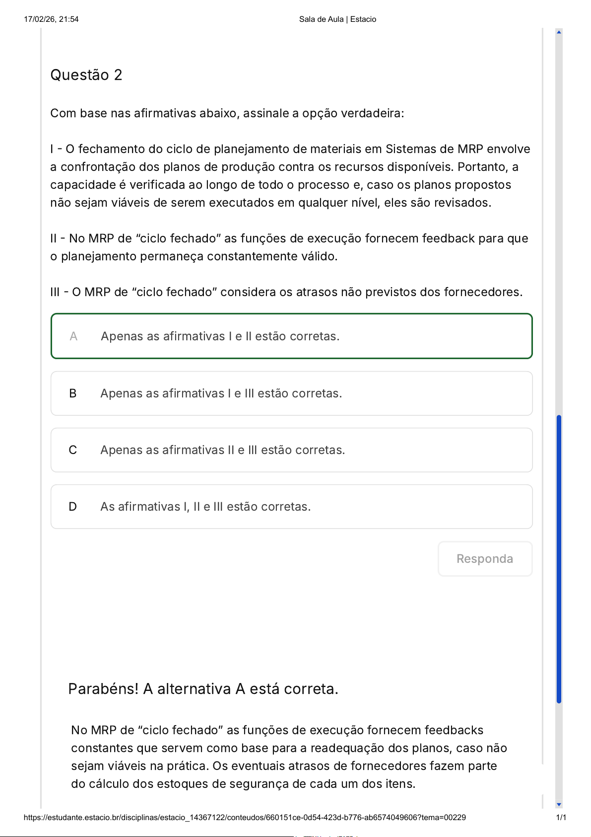 Questão 2 Com base nas afirmativas abaixo, assinale a opção verdadeira: I - O fechamento do ciclo de planejamento de materiais em Sistemas de MRP envolve a confrontação dos planos de produção contra os recursos disponíveis. Portanto, a capacidade é verificada ao longo de todo o processo e, caso os planos propostos não sejam viáveis de serem executados em qualquer nível, eles são revisados. II - No MRP de “ciclo fechado” as funções de execução fornecem feedback para que o planejamento permaneça constantemente válido. III - O MRP de “ciclo fechado” considera os atrasos não previstos dos fornecedores. A Apenas as afirmativas I e II estão corretas. B Apenas as afirmativas I e III estão corretas. C Apenas as afirmativas II e III estão corretas. D As afirmativas I, II e III estão corretas. Parabéns! A alternativa A está correta. Responda No MRP de “ciclo fechado” as funções de execução fornecem feedbacks constantes que servem como base para a readequação dos planos, caso não sejam viáveis na prática. Os eventuais atrasos de fornecedores fazem parte do cálculo dos estoques de segurança de cada um dos itens. 17/02/26, 21:54 Sala de Aula | Estacio https://estudante.estacio.br/disciplinas/estacio_14367122/conteudos/660151ce-0d54-423d-b776-ab6574049606?tema=00229 1/1