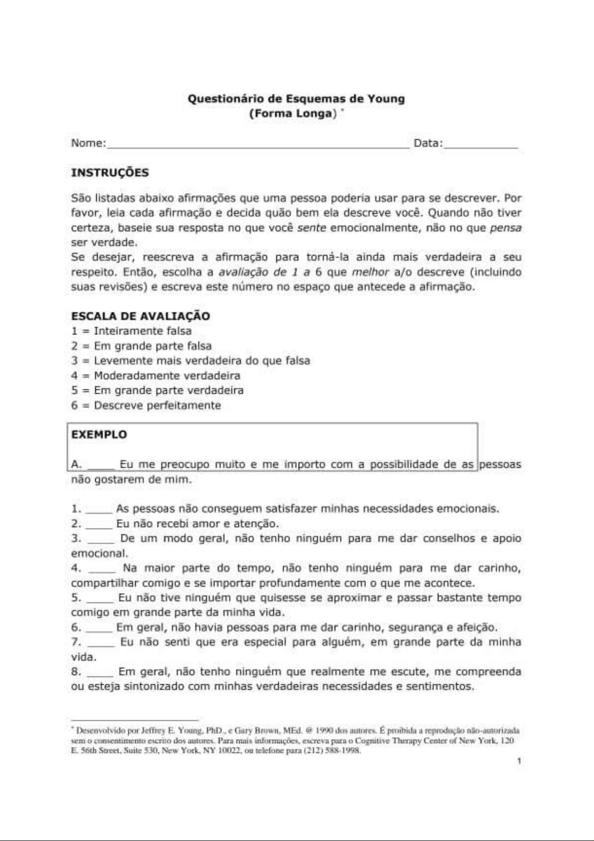 Questionário de Esquemas de Young (Forma Longa) Nome: Data: INSTRUÇÕES São listadas abaixo afirmações que uma pessoa poderia usar para se descrever. Por favor, leia cada afirmação e decida quão bem ela descreve você. Quando não tiver certeza, baseie sua resposta no que você sente emocionalmente, não no que pensa ser verdade. Se desejar, reescreva a afirmação para torná-la ainda mais verdadeira a seu respeito. Então, escolha a avaliação de 1 a 6 que melhor a/o descreve (incluindo suas revisões) e escreva este número no espaço que antecede a afirmação. ESCALA DE AVALIAÇÃO 1 = Inteiramente falsa 2 Em grande parte falsa 3 = Levemente mais verdadeira do que falsa 4 = Moderadamente verdadeira 5 = Em grande parte verdadeira 6 = Descreve perfeitamente EXEMPLO A. Eu me preocupo muito e me importo com a possibilidade de as pessoas não gostarem de mim. 1. As pessoas não conseguem satisfazer minhas necessidades emocionais. 2. Eu não recebi amor e atenção. 3. De um modo geral, não tenho ninguém para me dar conselhos e apoio emocional. 4. Na maior parte do tempo, não tenho ninguém para me dar carinho, compartilhar comigo e se importar profundamente com o que me acontece. 5. Eu não tive ninguém que quisesse se aproximar e passar bastante tempo comigo em grande parte da minha vida. 6. Em geral, não havia pessoas para me dar carinho, segurança e afeição. 7. Eu não senti que era especial para alguém, em grande parte da minha vida. 8. Em geral, não tenho ninguém que realmente me escute, me compreenda ou esteja sintonizado com minhas verdadeiras necessidades e sentimentos. Desenvolvido por Jeffrey E. Young, PhD., e Gary MEd. @ 1990 dos autores. É proibida a reprodução não-autorizada sem o consentimento escrito dos autores. Para mais informações, escreva para o Cognitive Therapy Center of New 120 E. 56th Street, Suite 530, New NY 10022, ou telefone para 19. Eu raramente tenho alguma pessoa forte para me dar bons conselhos ou orientação quando não tenho certeza do que fazer. *pe 10. Eu me preocupo com a possibilidade de as pessoas que eu amo morrerem, mesmo que haja poucas razões médicas para confirmar minhas preocupações. 11. Percebo que me agarro às pessoas com as quais tenho intimidade, por ter medo de que elas me deixem. 12. Eu me preocupo com a possibilidade de as pessoas de quem eu gosto me deixarem ou me abandonarem. 13. Sinto que me falta uma base estável de apoio emocional. 14. Não espero que os relacionamentos importantes durem, acredito que eles vão terminar. 15. Sinto que me apego a parceiros/as que não são capazes de se comprometerem comigo. 16. No final acabarei só. 17. Quando sinto que alguém com quem eu me importo está se afastando, fico desesperada/o. 18. Às vezes, tenho tanto medo de que as pessoas me deixem, que acabo fazendo com que se afastem. 19. Fico incomodado quando alguém me deixa sozinho/a, mesmo que por pouco tempo. 20. Não posso esperar que as pessoas que me apoiam estejam sempre disponíveis. 21. Não devo ficar realmente íntimo das pessoas, porque não posso ter certeza de que poderei contar sempre com elas. 22. Parece que as pessoas importantes da minha vida estão sempre indo e vindo. 23. Tenho muito medo de que as pessoas que eu amo encontrem alguém que vão preferir e me deixem. 24. As pessoas que me são próximas têm sido muito imprevisíveis; ora são legais e disponíveis, ora são zangadas, chateadas absorvidas em si mesmas, brigando, e assim por diante. 25. Preciso tanto das pessoas que tenho medo de perdê-las. 26. Eu me sinto indefeso/a se não tiver pessoas para me proteger, as quais me preocupo muito em perdê-las. 27. Não posso ser eu mesma/o ou expressar que realmente sinto, pois as pessoas me *ab 28. Sinto que as pessoas querem tirar vantagem de mim. 229. Frequentemente, sinto que tenho que me proteger dos outros. 30. Sinto que não posso baixar a guarda na presença dos outros, pois eles me prejudicariam intencionalmente. 31. Se uma pessoa é legal comigo, fico imaginando que ela está querendo alguma coisa. 32. É só uma questão de tempo antes que as pessoas me traiam. 33. A maioria das pessoas só pensa em si mesma. 34. Tenho grande dificuldade em confiar nas pessoas. 35. Desconfio muito dos motivos dos outros. 36. As outras pessoas raramente são honestas, elas geralmente não são o que parecem. 37. Eu geralmente fico procurando os motivos escondidos das pessoas. 38. Se acho que alguém quer me prejudicar, tento prejudicá-la/o primeiro. 39. As pessoas têm de provar coisas para mim antes que eu confie nelas. 40. Invento testes para as pessoas para ver se elas estão me dizendo a verdade e se estão bem-intencionadas. 41. Acredito no ditado: "Quem não controla é 42. Fico com raiva quando penso como fui maltratada/o pelas pessoas durante a minha vida. 43. Por toda minha vida, pessoas que me eram próximas tiraram vantagem de mim ou me usaram para seus propósitos. 44. Fui abusada/o fisicamente, emocionalmente ou sexualmente por pessoas importantes na minha vida. *da 45. Eu não me encaixo. 46. Sou fundamentalmente diferente das outras pessoas. 47. Eu não pertenço a ninguém; sou um/a solitário/a. 48. Sinto-me alienada/o das outras pessoas. 49. Eu me sinto isolada/o e sozinha. 50. Sempre me sinto fora dos grupos. 51. Ninguém me entende realmente. 52. A minha sempre foi diferente das famílias que nos cercavam. 53. vezes, eu me sinto um/a 54. Se eu desaparecesse amanha ninguém perceberia. *ia 55. Nenhum/a homem/mulher que eu desejar vai me amar depois de saber dos meus defeitos. 56. Ninguém que eu desejar vai querer ficar perto de mim depois que conhecer meu verdadeiro eu. 57. Sou inerentemente defeituosa/o e cheia/o de falhas. 358. Por mais que eu tente, sinto que não conseguirei que um/a homem/mulher significativo/a me respeite ou sinta que tenho valor. 59. Não sou digna/o do amor, da atenção e do respeito dos outros. 60. Sinto que não mereço ser amada/o. 61. Sou inacei