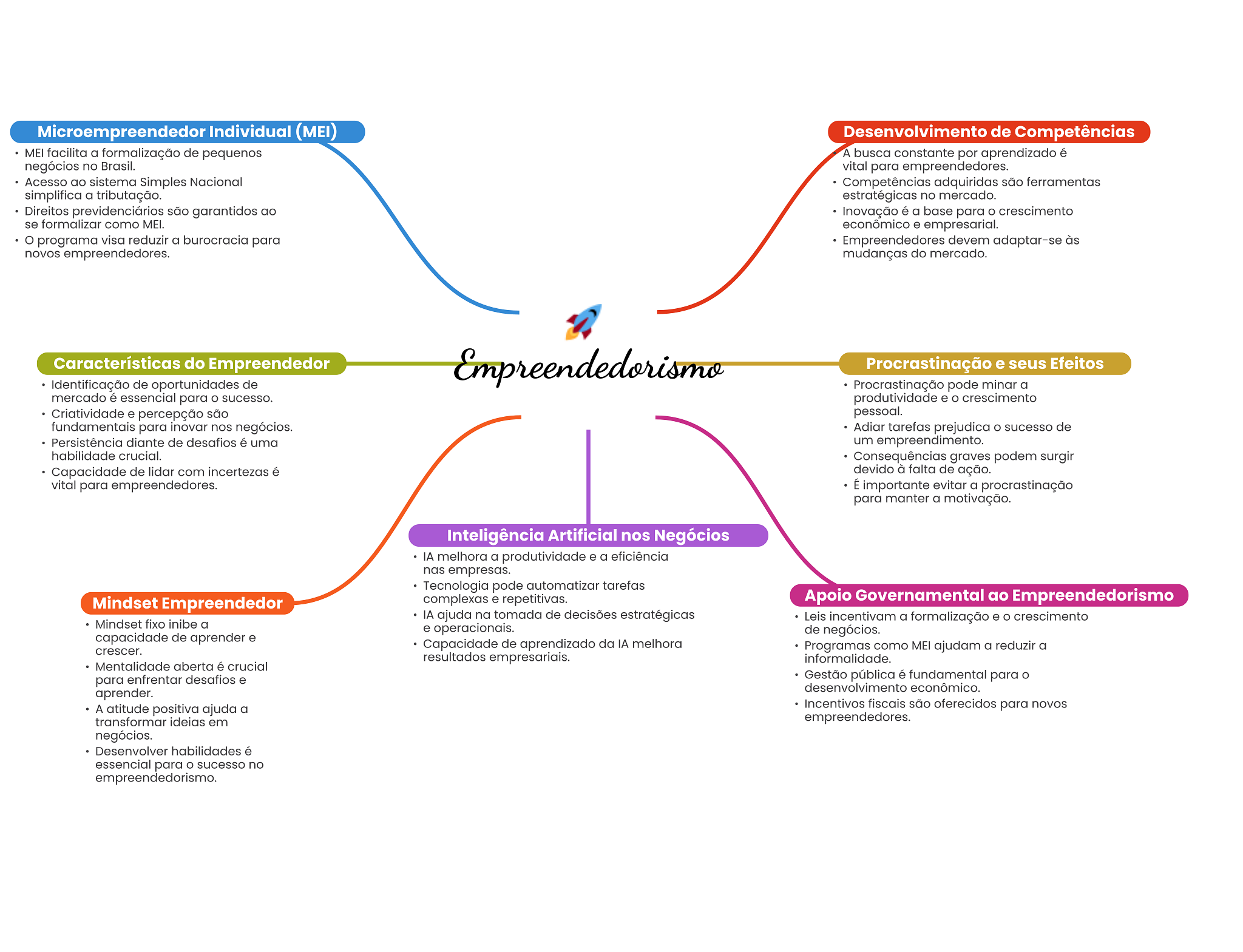 Microempreendedor Individual (MEI) de Competências MEI facilita a formalização de pequenos A busca constante por aprendizado é negócios no Brasil. vital para empreendedores. Acesso ao sistema Simples Nacional Competências adquiridas são ferramentas simplifica a tributação. estratégicas no mercado. Direitos previdenciários são garantidos ao Inovação é a base para crescimento se formalizar como MEI. econômico e empresarial. programa visa reduzir a burocracia para Empreendedores devem adaptar-se às novos empreendedores. mudanças do mercado. Características do Empreendedor Empreendedorismo Procrastinação e seus Efeitos Identificação de oportunidades de Procrastinação pode minar a mercado é essencial para sucesso. produtividade e O crescimento Criatividade e percepção são pessoal. fundamentais para inovar nos negócios. Adiar tarefas prejudica O sucesso de Persistência diante de desafios é uma um empreendimento. habilidade crucial. Consequências graves podem surgir Capacidade de lidar com incertezas é devido à falta de ação. vital para empreendedores. É importante evitar a procrastinação para manter a motivação. Inteligência Artificial nos Negócios IA melhora a produtividade e a eficiência nas empresas. Tecnologia pode automatizar tarefas Mindset Empreendedor complexas e repetitivas. Apoio Governamental ao Empreendedorismo IA ajuda na tomada de decisões estratégicas Leis incentivam a formalização e crescimento Mindset fixo inibe a e operacionais. de negócios. capacidade de aprender e Capacidade de aprendizado da IA melhora crescer. Programas como MEI ajudam a reduzir a resultados empresariais. informalidade. Mentalidade aberta é crucial para enfrentar desafios e Gestão pública é fundamental para O aprender. desenvolvimento econômico. A atitude positiva ajuda a Incentivos fiscais são oferecidos para novos transformar ideias em empreendedores. negócios. Desenvolver habilidades é essencial para sucesso no empreendedorismo.
