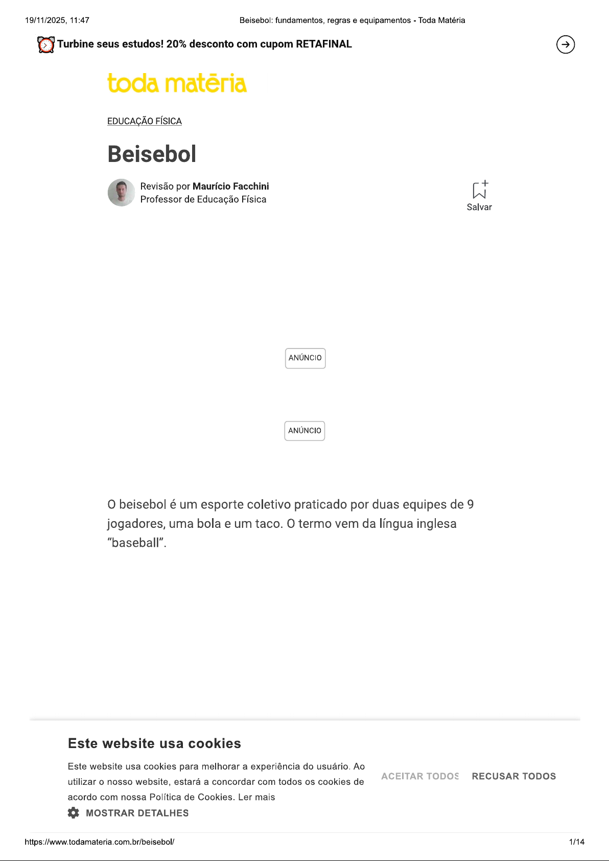 19/11/2025, 11:47 Beisebol: fundamentos, regras e equipamentos Toda Matéria Turbine seus estudos! 20% desconto com cupom RETAFINAL toda matēria EDUCAÇÃO FÍSICA Beisebol Revisão por Maurício Facchini + Professor de Educação Física Salvar ANÚNCIO ANÚNCIO beisebol é um esporte coletivo praticado por duas equipes de 9 jogadores, uma bola e um taco. termo vem da língua inglesa "baseball". Este website usa cookies Este website usa cookies para melhorar a experiência do usuário. Ao ACEITAR TODOS RECUSAR TODOS utilizar o nosso website, estará a concordar com todos os cookies de acordo com nossa Política de Cookies. Ler mais MOSTRAR DETALHES 1/1419/11/2025, 11:47 Beisebol: fundamentos, regras e equipamentos Toda Matéria BRASIL Jogador brasileiro de basebol Nos Estados Unidos é um dos esportes mais populares, praticado por homens e mulheres. A sua prática exige muita agilidade, condicionamento físico e precisão dos atletas. História do Beisebol Há controvérsias sobre a origem do beisebol. Alguns acreditam ser de origem inglesa, e outros acreditam que ele foi criado por Abner Doubleday, em Nova York, no ano de 1839. Este website usa cookies Este website usa cookies para melhorar a experiência do usuário. Ao ACEITAR TODOS RECUSAR TODOS utilizar o nosso website, estará a concordar com todos os cookies de acordo com nossa Política de Cookies. Ler mais MOSTRAR DETALHES 2/1419/11/2025, 11:47 Beisebol: fundamentos, regras e equipamentos Toda Matéria Abner Doubleday, considerado criador do beisebol A verdade é que um jogo semelhante, chamado "rounders", já era praticado no século XVIII na Inglaterra. ANÚNCIO Antes disso, foram encontradas descrições de um esporte com bola e taco em documentos franceses que datam do século XIV. Provavelmente, rounders foi trazido para a América pelos imigrantes F foi para beisebol tal qual Este website usa cookies Este website usa cookies para melhorar a experiência do usuário. Ao ACEITAR TODOS RECUSAR TODOS utilizar o nosso website, estará a concordar com todos os cookies de acordo com nossa Política de Cookies. Ler mais MOSTRAR DETALHES 3/1419/11/2025, 11:47 Beisebol: fundamentos, regras e equipamentos Toda Matéria primeiro jogo oficial dessa modalidade ocorreu em 1846, na cidade de Nova York. Hoje, beisebol é um esporte muito popular em países da América do Norte e central. Ele disseminou-se de forma muita rápida e atualmente podemos encontrar equipes e milhões de adeptos em todas as partes do mundo. Em 1992, nos Jogos Olímpicos de Barcelona, beisebol foi inserido como modalidade olímpica, onde Cuba saiu vencedora. Beisebol no Brasil No Brasil, beisebol foi difundido principalmente por norte- americanos que residiam e trabalhavam no país. No início do século ele começou a ser praticado em São Paulo. Em 1936, ocorreu primeiro campeonato brasileiro de beisebol. Em 1946, surgiu em São Paulo a Federação Paulista de Beisebol e Softbol (FPBS). Depois disso, sua prática espalhou-se por diversos estados do Brasil. Costa Rica Panamá Venezuela Guiana Guiana Francesa Suriname Equador Brasil Peru Bolívia Paraguai Chile Este website usa cookies Este website usa cookies para melhorar a experiência do usuário. Ao ACEITAR TODOS RECUSAR TODOS utilizar o nosso website, estará a concordar com todos os cookies de acordo com nossa Política de Cookies. Ler mais MOSTRAR DETALHES 4/1419/11/2025, 11:47 Beisebol: fundamentos, regras e equipamentos Toda Matéria ANÚNCIO Mapa mostra os campos de beisebol no Brasil Em 1990, foi fundada a Confederação Brasileira de Beisebol e Softbol (CBBS). Essa entidade é responsável pela organização de eventos dessa modalidade em nível nacional. Fundamentos do Beisebol beisebol é praticado num campo ao ar livre e possui 4 bases. Um jogo é composto de 9 entradas (partidas) sem um tempo definido. Possui duas equipes compostas por 9 jogadores cada. De maneira alternada, as equipes atacam e defendem. As posições dos jogadores vão se alternando durante a partida. Primeiro, a equipe visitante ataca, ou seja, cada jogador tentará rebater a bola com bastão e correr para as bases. Enquanto isso, a equipe da casa começa defendendo, ou seja, um jogador (o arremessador) vai arremessar a bola, e os outros 8 jogadores vão posicionar-se para agarrar a bola, caso jogador da equipe adversária consiga rebater a bola. Após os 9 jogadores da equipe visitante atacarem, as funções se invertem. . Este website usa cookies Este website usa cookies para melhorar a experiência do usuário. Ao ACEITAR TODOS RECUSAR TODOS utilizar o nosso website, estará a concordar com todos os cookies de acordo com nossa Política de Cookies. Ler mais MOSTRAR DETALHES 5/1419/11/2025, 11:47 Beisebol: fundamentos, regras e equipamentos Toda Matéria Se a bola for acertada pelo rebatedor, ele deve correr pelas quatro bases do campo. Se ele conseguir atingir as quatro, a equipe ganha um ponto. No beisebol, os pontos são marcados mediante a trajetória percorrida pelos jogadores. Portanto, vence a equipe que tiver mais corridas completas durante a partida. Se o batedor lançar a bola fora do estádio, a equipe recebe um ponto. Esse movimento é chamado de home run. ANÚNCIO Jogadores de Beisebol Este website usa cookies Este website usa cookies para melhorar a experiência do usuário. Ao ACEITAR TODOS RECUSAR TODOS utilizar o nosso website, estará a concordar com todos os cookies de acordo com nossa Política de Cookies. Ler mais MOSTRAR DETALHES 6/1419/11/2025, 11:47 Beisebol: fundamentos, regras e equipamentos Toda Matéria CF CENTER FIELD 8 LF RF LEFT FIELD RIGHT FIELD 7 9 SS 2B SHORTSTOP SECOND BASE 6 4 P 1B THIRD BASE FIRST BASE PITCHER 5 1 3 CATCHER 2 De acordo com a função e posição no campo, os jogadores de beisebol são classificados em: 1. lançador (pitcher) 2. receptor (catcher) 3. jogador de base (first baseman) 4. jogador de base (second baseman) 5. jogador de base (third baseman) 6. jogador interbase (