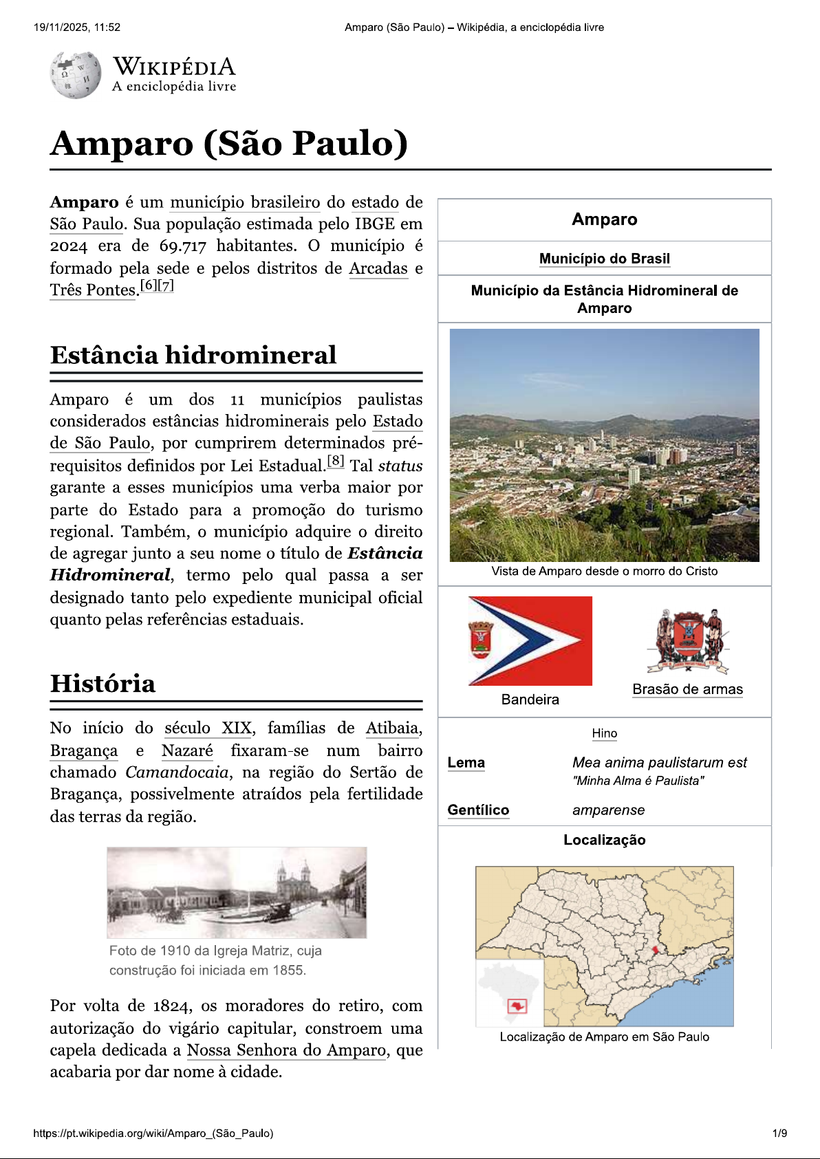 19/11/2025, 11:52 Amparo (São Paulo) Wikipédia, a enciclopédia livre WIKIPÉDIA A enciclopédia livre Amparo (São Paulo) Amparo é um município brasileiro do estado de São Paulo. Sua população estimada pelo IBGE em Amparo 2024 era de 69.717 habitantes. O município é Município do Brasil formado pela sede e pelos distritos de Arcadas e Três Pontes. [6][7] Município da Estância Hidromineral de Amparo Estância hidromineral Amparo é um dos 11 municípios paulistas considerados estâncias hidrominerais pelo Estado de São Paulo, por cumprirem determinados pré- requisitos definidos por Lei Estadual. [8] Tal status garante a esses municípios uma verba maior por parte do Estado para a promoção do turismo regional. Também, o município adquire o direito de agregar junto a seu nome o título de Estância Hidromineral, termo pelo qual passa a ser Vista de Amparo desde o morro do Cristo designado tanto pelo expediente municipal oficial quanto pelas referências estaduais. História Brasão de armas Bandeira No início do século XIX, famílias de Atibaia, Hino Bragança e Nazaré fixaram-se num bairro Lema Mea anima paulistarum est chamado Camandocaia, na região do Sertão de "Minha Alma é Paulista" Bragança, possivelmente atraídos pela fertilidade das terras da região. Gentílico amparense Localização Foto de 1910 da Igreja Matriz, cuja construção foi iniciada em 1855. Por volta de 1824, os moradores do retiro, com autorização do vigário capitular, constroem uma Localização de Amparo em São Paulo capela dedicada a Nossa Senhora do Amparo, que acabaria por dar nome à cidade. 1/919/11/2025, 11:52 Amparo (São Paulo) Wikipédia, a enciclopédia livre Em 8 de abril de 1829, bairro da capela de Nossa Senhora do Amparo ganha a condição de capela curada, data que é oficialmente considerada a fundação de Amparo. Com crescimento dos anos seguintes, 0 aglomerado é elevado a Amparo condição de freguesia (1839). Intendente Capitão Damásio Pires 1850 marca início das Pimentel *1853 lavouras de café, ciclo que Localização de Amparo no Brasil +1926 impulsionaria a elevação da vila Nossa Senhora do Amparo à categoria de cidade Três P em 1863. Amparo No período de 1870 a 1875, Antônio Pedro e José Pedro Wikimedia OpenStreetMap de Godoy Moreira (irmãos de João Pedro de Godoy Mapa de Amparo Moreira fundador de Coordenadas 22° 42' 03" S, 46° 50" Pedreira/SP e tios maternos País Brasil Magistrado Dr. do Intendente Damásio Pires Flávio Augusto de Unidade São Paulo Pimentel), foram Oliveira Queiroz - federativa *1865 +1933 (Foto primeiros eleitores de da tela existente na Amparo já que no "antigo Municípios Oeste: Pedreira e limítrofes Jaguariúna; Sala do Juri do regime" havia o sistema de Norte: Santo Antônio de Forum de Amparo eleições indiretas e uns Posse, Itapira e Serra Negra; SP) tantos contribuintes ou Leste: Monte Alegre do Sul e votantes davam direito à Tuiuti; Sul: Morungaba nomeação de um eleitor, que os representava no Distância até a 138 capital colégio eleitoral, nas eleições provinciais e História gerais. Fundação 8 de abril de 1829 (196 anos) Por lei provincial Administração promulgada em 1873 foi Prefeito(a) Carlos Alberto Martins (MDB, criada a Comarca de 2021-2028) Amparo, com os termos Características geográficas reunidos de Socorro e Artur Piqueroby de Serra Negra. Área total [2] 446,009 km² Aguiar Whitaker, autor da alcunha Flor da População 73 145 hab. Montanha (1929). Quando da sagração da total (Estimativa Igreja Matriz no ano de populacional 1878, foi entronizada a Densidade 164 2/919/11/2025, 11:52 Amparo (São Paulo) Wikipédia, a enciclopédia livre imagem de Nossa Senhora do Amparo, trazida da Clima tropical de altitude (Cwa) cidade portuguesa do Porto sob patronato da Altitude 674 m Baronesa de Campinas, Da. Anna Cintra. Fuso horário Hora de Brasília (UTC-3) Nas décadas seguintes, a cidade prosperou com Indicadores café, ganhou serviço de correios, inaugurou um jornal ("Tribuna Amparense"), iluminação com IDH 0,785 alto lampiões a querosene e a Companhia Mogiana de Estradas de Ferro, para escoar sua crescente PIB R$ 1 405 673,706 mil produção de cafeeira rumo ao porto de Santos. (IBGE/2008[5]) PIB per capita Em 1878, Amparo recebe a visita de Dom Pedro II, que é hospedado pelo Barão de Campinas, cidade Sítio amparo.sp.gov.br (http://ww já considerada a maior produtora de café do Brasil w.amparo.sp.gov.br) Império. (Prefeitura) camaraamparo.sp.gov.br (htt Aos 8 de setembro de 1885 era inaugurado o Clube p://www.camaraamparo.sp.g 8 de Setembro tradicional clube sócio cultural da ov.br) (Câmara) cidade. O Dr. Bernardino de Campos, um de seus fundadores, foi eleito o seu presidente. Na gestão (de 1897 a 1899), do intendente capitão Damásio Pires Pimentel, foi inaugurada em 8 de maio de 1898 a iluminação elétrica da cidade. Pela lei 2886 de 3 de abril de 2003, a prefeitura de Amparo, homenageando-o, deu seu nome a um logradouro da cidade: a rua Intendente Damásio Pires Pimentel. Ofício de Antônio Prado, em nome da Princesa Isabel, agradecendo a Câmara municipal de Amparo pelas felicitações da sanção da Lei Áurea. APESP 3/919/11/2025, 11:52 Amparo (São Paulo) Wikipédia, a enciclopédia livre Na quinzena de 1902, assume a direção da Comarca Juiz de direito Dr. Flavio Augusto de Oliveira Queirós sendo ele magistrado a permanecer por mais tempo na judicatura amparense cerca de 20 anos. Dr. Flavio, também, foi presidente do Clube 8 de Setembro nos anos 1904 1914 a 1915 1919 a 1921. Casou-se nessa cidade em 26 de março de 1904 com Julieta Goulart Penteado Pimentel (Yaya), filha do intendente Damásio Pires Pimentel. Durante os anos 20, a então Igreja Matriz, agora Catedral Nossa Senhora do Amparo, consoante projeto do engenheiro civil amparense Amador Cintra do Prado, neto do Barão de Campinas, é radicalmente reformada, tendo suas paredes reforçadas e suas torres fi