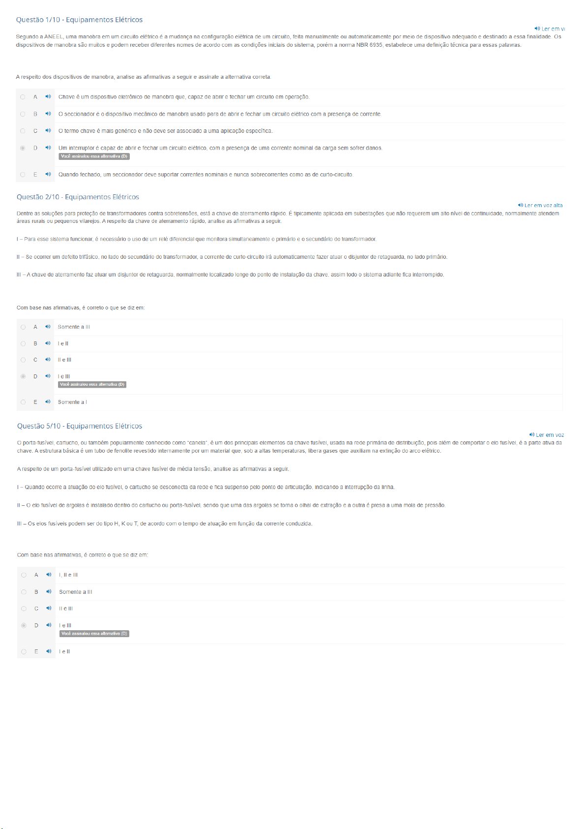 Questão 1/10 Equipamentos Elétricos Ler em Segundo a ANEEL, uma manobra em um circuito elétrico é a mudança na configuração elétrica de um circuito, feita manualmente ou automaticamente por meio de dispositivo adequado e destinado a essa finalidade. Os dispositivos de manobra são muitos e podem receber diferentes nomes de acordo com as condições iniciais do sistema, porém a norma NBR 6935, estabelece uma definição técnica para essas palavras. A respeito dos dispositivos de manobra, analise as afirmativas a seguir e assinale a alternativa A Chave é um dispositivo eletrônico de manobra que, capaz de abrir e fechar um circuito em operação. seccionador é dispositivo mecânico de manobra usado para de abrir e fechar um circuito elétrico com a presença de corrente. termo chave é mais genérico e não deve ser associado a uma aplicação específica. D Um interruptor é capaz de abrir e fechar um circuito elétrico, com a presença de uma corrente nominal da carga sem sofrer danos. Você assinalou essa alternativa (D) E Quando fechado, um seccionador deve suportar correntes nominais e nunca sobrecorrentes como as de Questão 2/10 Equipamentos Elétricos Ler em voz alta Dentre as soluções para proteção de transformadores contra sobretensões, está a chave de aterramento rápido. É tipicamente aplicada em subestações que não requerem um alto nível de normalmente atendem áreas rurais ou pequenos vilarejos. A respeito da chave de aterramento rápido, analise as afirmativas a seguir. Para esse sistema funcionar, é necessário uso de um relé diferencial que monitora simultaneamente primário e secundário do transformador. - Se ocorrer um defeito trifásico, no lado do secundário do transformador, a corrente de curto-circuito irá automaticamente fazer atuar disjuntor de retaguarda, no lado primário. III A chave de aterramento faz atuar um disjuntor de retaguarda, normalmente localizado longe do ponto de instalação da chave, assim todo sistema adiante fica Com base nas afirmativas, é correto que se diz em: A Somente a III III D III Você assinalou essa alternativa (D) E Somente Questão 5/10 Equipamentos Elétricos Ler em porta-fusível, cartucho, ou também popularmente conhecido como "canela", é um dos principais elementos da chave usada na rede primária de distribuição, pois além de comportar elo fusível, é a parte ativa da chave. A estrutura básica é um tubo de fenolite revestido internamente por um material que, sob a altas temperaturas, libera gases que auxiliam na extinção do arco A respeito de um porta-fusível utilizado em uma chave fusível de média tensão, analise as afirmativas a seguir. Quando ocorre a atuação do elo fusível, cartucho se desconecta da rede e fica suspenso pelo ponto de articulação, indicando a interrupção da linha. elo fusível de argolas é instalado dentro do cartucho ou porta-fusível, sendo que uma das argolas se torna olhal de extração e a outra é presa a uma mola de pressão. III Os elos fusíveis podem ser do tipo H, K ou T, de acordo com 0 tempo de atuação em função da corrente conduzida. Com base nas afirmativas, é correto 0 que se diz em: A III Somente III III III Você assinalou essa alternativa (D) EQuestão 6/10 Equipamentos Elétricos Ler em alt Uma usina geradora pode apresentar baixa produtividade em função da ausência de chuvas por exemplo ou ainda parar para correção de falhas. Nesses casos, para suprir a demanda e evitar interrupções no fornecimento, parte da carga é destinada a outra fonte geradora. No entanto, é necessário que os sistemas estejam interligados entre si, essa estrutura é chamada de Sistema Interligado Nacional (SIN). A respeito da caracterização do sistema elétrico brasileiro, analise as afirmativas a seguir. Esquema Regional de Alívio de Carga (ERAC) monitora a corrente elétrica da rede e prevê um possível desligamento por sobrecarga. Quando se insere uma carga não planejada na rede elétrica, ocorre aumento da corrente nominal e, ao perceber essa alteração no valor da corrente, 0 ERAC atua desligando parte das cargas. sistema elétrico de potência brasileiro é dividido em três partes principais, a geração, a transmissão e a distribuição de energia. III fornecimento de energia para consumidores pode ser feito em quatro níveis de tensão distintos: transmissão, subtransmissão, distribuição primária e distribuição secundária. Com base nas afirmativas, é correto que se diz em: A B Você assinalou essa alternativa (B) Somente D Somente III E Todas estão corretas Questão 7/10 Equipamentos Elétricos Ler em VC Os capacitores são dispositivos muito versáteis, atuando nos mais variados níveis, desde pequenos circuitos eletrônicos até nas altas tensões do setor elétrico. Um capacitor é basicamente constituído de um par placas condutoras, instaladas paralelamente e separadas por um material dielétrico. seu funcionamento está baseado na capacidade de armazenar uma certa quantidade de energia no campo elétrico formado entre as placas. A respeito da aplicação de bancos de capacitores, analise as afirmativas a seguir. uso de capacitores para correção do fator de potência, baseia-se em cancelar efeito indutivo da carga, deixando 0 sistema com comportamento resistivo. Os bancos em derivação ou bancos em derivância, são usados em geradores para que consigam maior potência ativa. III Para as instalações de média tensão, entre 2,4 e 25 kV, com potência reativa abaixo de 400 0 uso de capacitores é inviável para correção do fator de potência. Com base nas afirmativas, é correto que se diz em: A Somente a Somente a III III III E Você assinalou essa alternativa (E) Questão 8/10 Equipamentos Elétricos Ler Uma chave de uso interno é projetada exclusivamente para instalação interna a um edifício ou alojamento, onde está protegida contra intempéries como vento, chuva, depósito de poeira, condensação e granizo