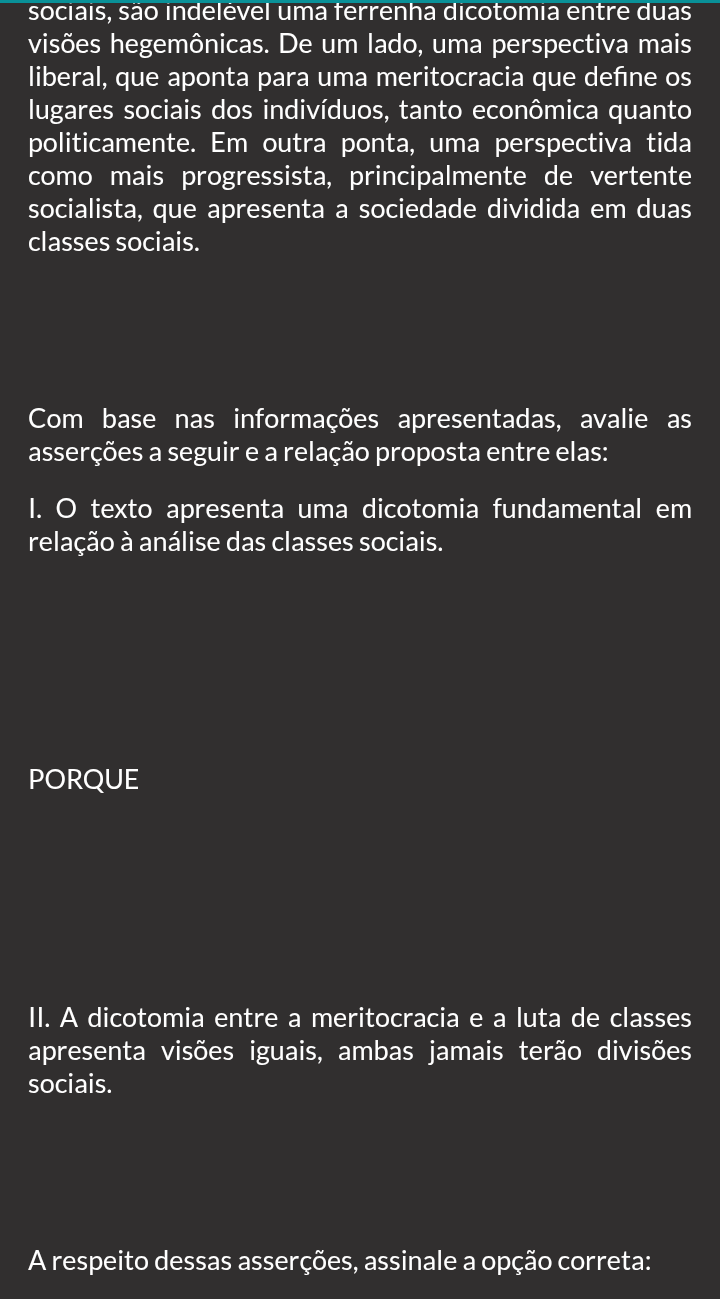 sociais, são uma terrenha dicotomia entre duas visões hegemônicas. De um lado, uma perspectiva mais liberal, que aponta para uma meritocracia que define os lugares sociais dos indivíduos, tanto econômica quanto politicamente. Em outra ponta, uma perspectiva tida como mais progressista, principalmente de vertente socialista, que apresenta a sociedade dividida em duas classes sociais. Com base nas informações apresentadas, avalie as asserções a seguir e a relação proposta entre elas: I. texto apresenta uma dicotomia fundamental em relação à análise das classes sociais. PORQUE II. A dicotomia entre a meritocracia e a luta de classes apresenta visões iguais, ambas jamais terão divisões sociais. A respeito dessas asserções, assinale a opção correta: