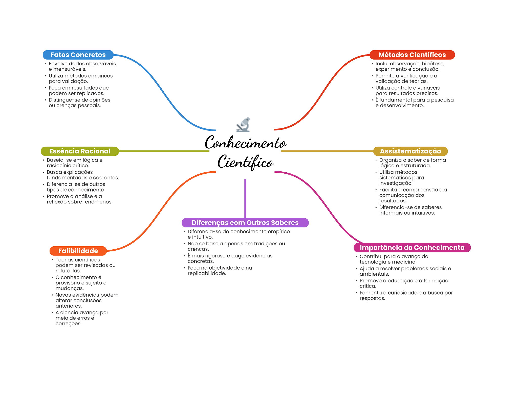 Fatos Concretos Métodos Científicos Envolve dados observáveis Inclui observação, hipótese, e mensuráveis. experimento e conclusão. Utiliza métodos empíricos Permite a verificação e a para validação. validação de teorias. Foca em resultados que Utiliza controle e variáveis podem ser replicados. para resultados precisos. Distingue-se de opiniões É fundamental para a pesquisa ou crenças pessoais. e Conhecimento Essência Racional Assistematização Baseia-se em lógica e Científico Organiza saber de forma raciocínio crítico. lógica e estruturada. Busca explicações Utiliza métodos fundamentadas e coerentes. sistemáticos para Diferencia-se de outros investigação. tipos de conhecimento. Facilita a compreensão e a Promove a análise e a comunicação dos reflexão sobre fenômenos. resultados. Diferencia-se de saberes informais ou intuitivos. Diferenças com Outros Saberes Diferencia-se do conhecimento empírico e intuitivo. Não se baseia apenas em tradições ou Falibilidade crenças. Importância do Conhecimento É mais rigoroso e exige evidências Teorias científicas Contribui para avanço da concretas. tecnologia e medicina. podem ser revisadas ou refutadas. Foca na objetividade e na Ajuda a resolver problemas sociais e replicabilidade. ambientais. conhecimento é provisório e sujeito a Promove a educação e a formação crítica. mudanças. Novas evidências podem Fomenta a curiosidade e a busca por alterar conclusões respostas. anteriores. A ciência avança por meio de erros e correções.
