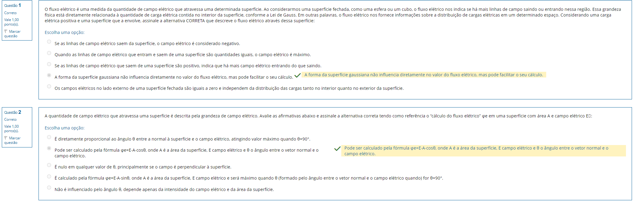 Questão 1 fluxo elétrico é uma medida da quantidade de campo elétrico que atravessa uma determinada superfície. Ao considerarmos uma superfície fechada, como uma esfera ou um cubo, 0 fluxo elétrico nos indica se há mais linhas de campo saindo ou entrando nessa região. Essa grandeza Correto física está diretamente relacionada à quantidade de carga elétrica contida no interior da superfície, conforme a Lei de Gauss. Em outras palavras, fluxo elétrico nos fornece informações sobre a distribuição de cargas elétricas em um determinado espaço. Considerando uma carga Vale 1,00 elétrica positiva e uma que a envolve, assinale a alternativa CORRETA que descreve fluxo elétrico através dessa superfície: ponto(s). P Marcar Escolha uma opção: questão Se as linhas de campo elétrico saem da campo elétrico é considerado negativo. Quando as linhas de campo elétrico que entram e saem de uma superficie são quantidades iguais, O campo elétrico é máximo. Se as linhas de campo elétrico que saem de uma superficie são positivo, indica que há mais campo elétrico entrando do que saindo. A forma da gaussiana não influencia diretamente no valor do fluxo elétrico, mas pode facilitar seu cálculo. A forma da superfície gaussiana não influencia diretamente no valor do fluxo elétrico, mas pode facilitar seu cálculo. Os campos elétricos no lado externo de uma fechada são iguais a zero e independem da distribuição das cargas tanto no interior quanto no exterior da superfície. Questão 2 A quantidade de campo elétrico que atravessa uma superfície é descrita pela grandeza de campo elétrico. Avalie as afirmativas abaixo e assinale a alternativa correta tendo como referência 0 "cálculo do fluxo elétrico" фе em uma superfície com área A e campo elétrico Correto Vale 1,00 Escolha uma opção: ponto(s). Marcar É diretamente proporcional ao ângulo entre a normal à e O campo elétrico, atingindo valor máximo quando questão Pode ser calculado pela onde A é a área da E campo elétrico e ângulo entre O vetor normal e Pode ser calculado pela fórmula onde A é a da superfície, E campo elétrico e ângulo entre vetor normal e O campo elétrico. campo elétrico. É nulo em qualquer valor de principalmente se campo é perpendicular à superfície. É calculado pela onde A é a da E campo elétrico e será máximo quando (formado pelo ângulo entre vetor normal e campo elétrico quando) for Não é influenciado pelo ângulo depende apenas da intensidade do campo elétrico e da área da superfície.