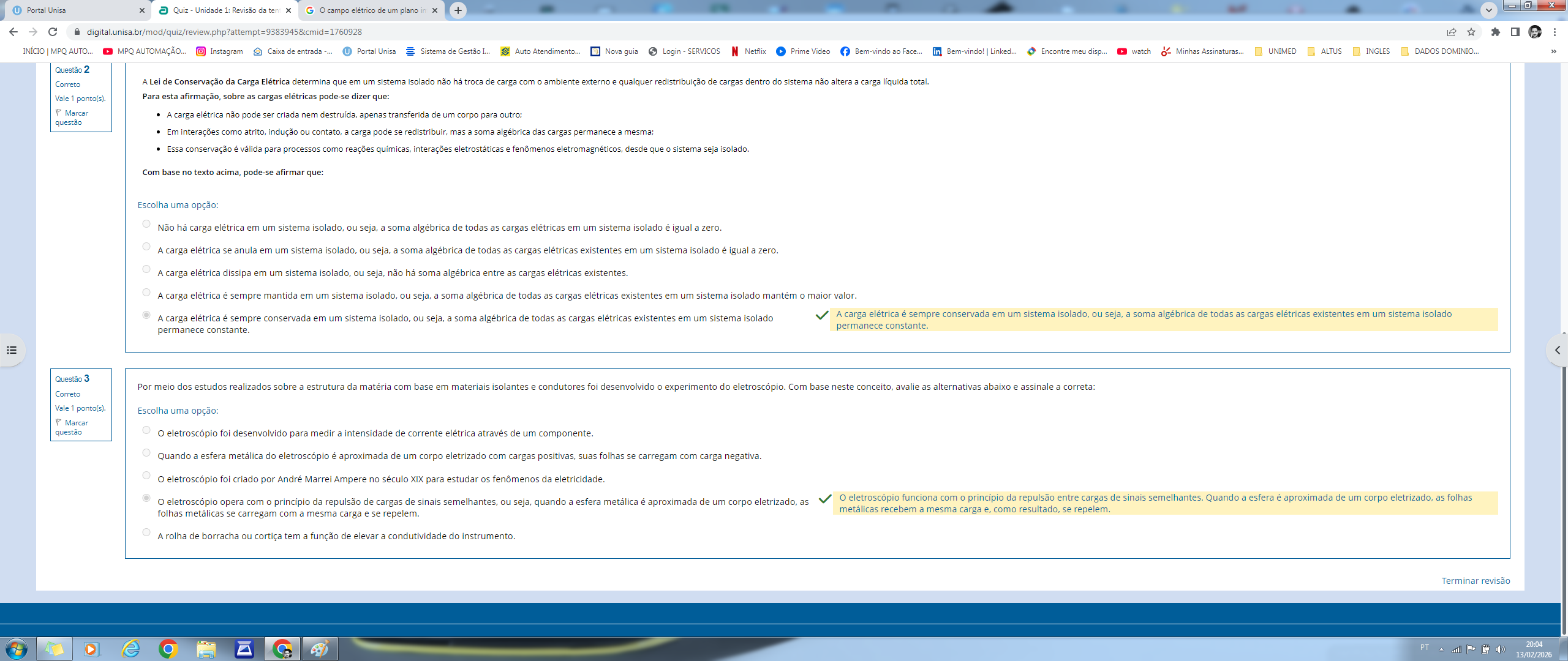 digital.unisa.br/mod/quiz/review.php?attempt=93839458cmid=1760928 MPQ AUTO... MPQ AUTOMAÇÃO.. Instagram Caixa de entrada Portal Unisa Sistema de Gestão I... Auto Atendimento... Nova guia Login SERVICOS Netflix Prime Video Bem-vindo ao Face... Bem-vindo! Encontre meu disp... watch Minhas UNIMED ALTUS INGLES DADOS DOMINIO... > Questão 2 Correto A Lei de Conservação da Carga Elétrica determina que em um sistema isolado não há troca de carga com ambiente externo e qualquer redistribuição de cargas dentro do sistema não altera a carga líquida total. Vale ponto(s). Para esta afirmação, sobre as cargas elétricas pode-se dizer que: Marcar A carga elétrica não pode ser criada nem destruída, apenas transferida de um corpo para outro; questão Em interações como atrito, indução ou contato, a carga pode se redistribuir, mas a soma algébrica das cargas permanece a mesma; Essa conservação é válida para processos como reações químicas, interações eletrostáticas e fenômenos eletromagnéticos, desde que sistema seja isolado. Com base no texto acima, pode-se afirmar que: Escolha uma opção: Não há carga elétrica em um sistema isolado, ou seja, a soma algébrica de todas as cargas elétricas em um sistema isolado igual a zero. A carga elétrica se anula em um sistema isolado, ou seja, a soma algébrica de todas as cargas elétricas existentes em um sistema isolado é igual a zero. A carga elétrica dissipa em um sistema isolado, ou seja, não soma algébrica entre as cargas elétricas existentes. A carga elétrica é sempre mantida em um sistema isolado, ou seja, a soma algébrica de todas as cargas elétricas existentes em um sistema isolado mantém maior valor. A carga elétrica é sempre conservada em um sistema isolado, ou seja, a soma algébrica de todas as cargas elétricas existentes em um sistema isolado A carga elétrica é sempre conservada em um sistema isolado, ou seja, a soma algébrica de todas as cargas elétricas existentes em um sistema isolado permanece constante. permanece constante. Questão 3 Por meio dos estudos realizados sobre a estrutura da matéria com base em materiais isolantes e condutores foi desenvolvido experimento do eletroscópio. Com base neste conceito, avalie as alternativas abaixo e assinale a correta: Correto Vale ponto(s). Escolha uma opção: Marcar questão eletroscópio foi desenvolvido para medir a intensidade de corrente elétrica através de um componente. Quando a esfera metálica do eletroscópio é aproximada de um corpo eletrizado com cargas positivas, suas folhas se carregam com carga negativa. eletroscópio foi criado por Marrei Ampere no século XIX para estudar os fenômenos da eletricidade. eletroscópio opera com princípio da repulsão de cargas de sinais semelhantes, ou seja, quando a esfera metálica é aproximada de um corpo eletrizado, as eletroscópio funciona com princípio da repulsão entre cargas de sinais semelhantes. Quando a esfera é aproximada de um corpo eletrizado, as folhas folhas metálicas se carregam com a mesma carga e se repelem. metálicas recebem a mesma carga e, como resultado, se repelem. A rolha de borracha ou cortiça tem a função de elevar a condutividade do instrumento. Terminar revisão