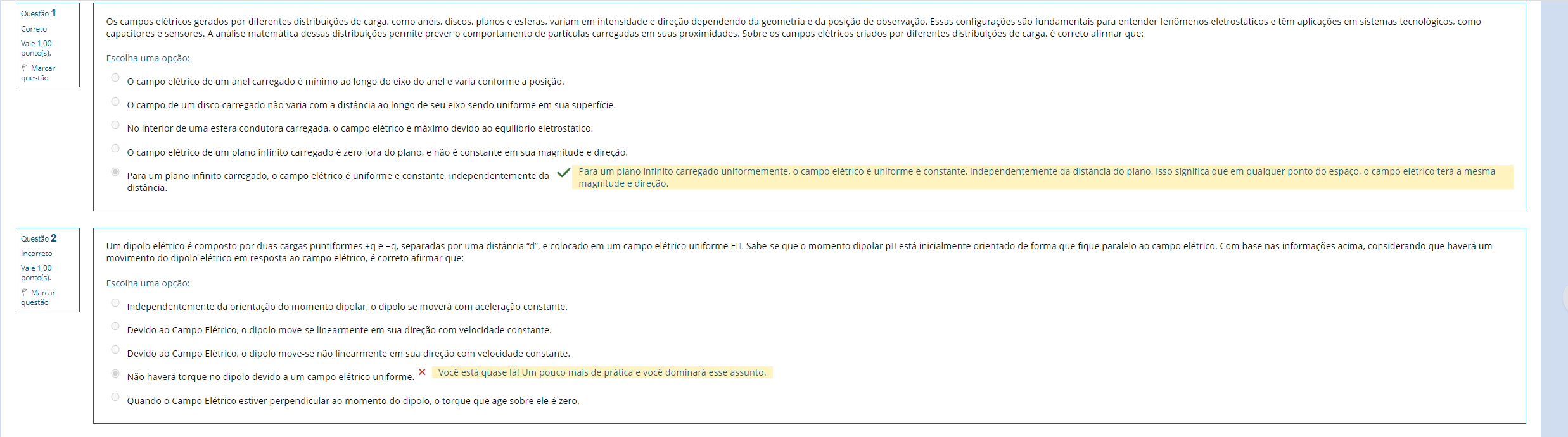 Questão 1 Os campos elétricos gerados por diferentes distribuições de carga, como anéis, discos, planos e esferas, variam em intensidade e direção dependendo da geometria e da posição de observação. Essas configurações são fundamentais para entender fenômenos eletrostáticos e têm aplicações em sistemas tecnológicos, como Correto capacitores e sensores. A análise matemática dessas distribuições permite prever comportamento de partículas carregadas em suas proximidades. Sobre os campos elétricos criados por diferentes distribuições de carga, é correto afirmar que: Vale 1,00 ponto(s). Escolha uma opção: P Marcar questão campo elétrico de um anel carregado é mínimo ao longo do eixo do anel e varia conforme a posição. campo de um disco carregado não varia com a distância ao longo de seu eixo sendo uniforme em sua superfície. No interior de uma esfera condutora carregada, campo elétrico é máximo devido ao equilíbrio eletrostático. campo elétrico de um plano infinito carregado é zero fora do plano, e não é constante em sua magnitude e direção. Para um plano infinito carregado, campo elétrico é uniforme e constante, independentemente da Para um plano infinito carregado uniformemente, campo elétrico é uniforme e constante, independentemente da distância do plano. Isso significa que em qualquer ponto do espaço, campo elétrico terá a mesma distância. magnitude direção. Questão 2 Um dipolo elétrico é composto por duas cargas puntiformes +q e -q, separadas por uma distância "d", e colocado em um campo elétrico uniforme ED. Sabe-se que momento dipolar está inicialmente orientado de forma que fique paralelo ao campo elétrico. Com base nas informações acima, considerando que haverá um Incorreto movimento do dipolo elétrico em resposta ao campo elétrico, é correto afirmar que: Vale 1.00 ponto(s). Escolha uma opção: Marcar questão Independentemente da orientação do momento dipolar, 0 dipolo se moverá com aceleração constante. Devido ao Campo Elétrico, dipolo move-se linearmente em sua direção com velocidade constante. Devido ao Campo Elétrico, dipolo move-se não linearmente em sua direção com velocidade constante. Não torque no dipolo devido a um campo elétrico uniforme. Você está quase lá! Um pouco mais de prática e você dominará esse assunto. Quando Campo Elétrico estiver perpendicular ao momento do dipolo, 0 torque que age sobre ele é zero.