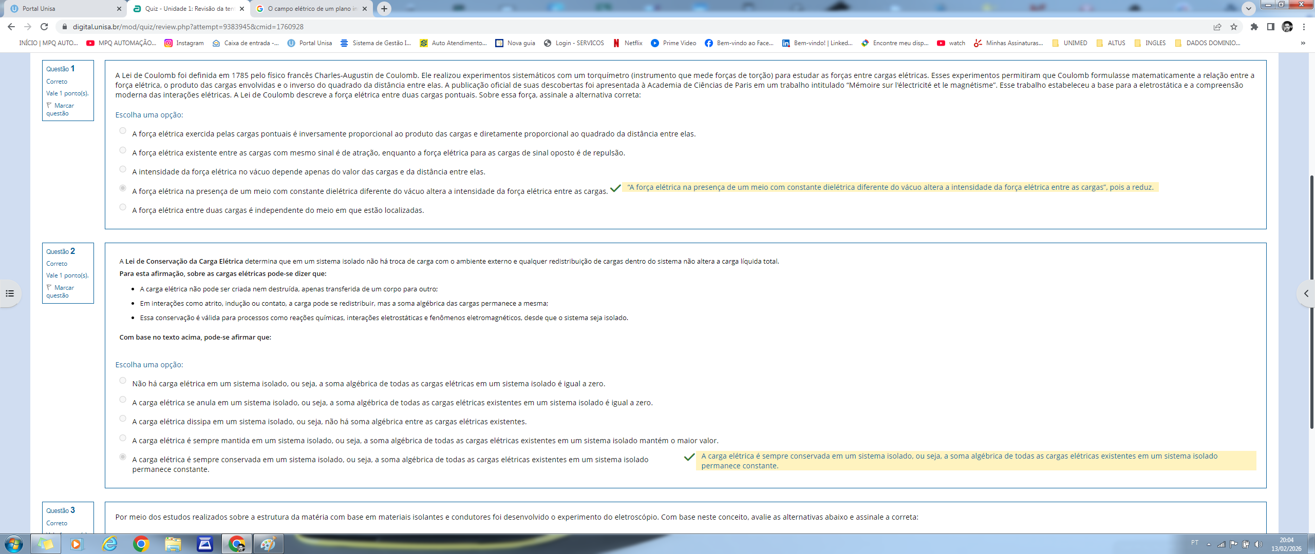 digital.unisa.br/mod/quiz/review.php?attempt=93839458cmid=1760928 MPQ AUTO.. MPQ AUTOMAÇÃO.. Instagram Caixa de entrada Portal Unisa Sistema de Gestão I... Auto Atendimento.. Nova guia Login SERVICOS Netflix Prime Video Bem-vindo ao Face.. Bem-vindo! Linked.. Encontre meu disp... watch Minhas Assinaturas.. UNIMED ALTUS INGLES DADOS DOMINIO.. Questão 1 A Lei de Coulomb foi definida em 1785 pelo físico francês Charles-Augustin de Coulomb. Ele realizou experimentos sistemáticos com um (instrumento que mede forças de torção) para estudar as forças entre cargas elétricas. Esses experimentos permitiram que Coulomb formulasse matematicamente a relação entre a Correto força elétrica, 0 produto das cargas envolvidas e inverso do quadrado da distância entre elas. A publicação oficial de suas descobertas foi apresentada à Academia de Ciências de Paris em um trabalho intitulado "Mémoire sur l'électricité et le magnétisme". Esse trabalho estabeleceu a base para a eletrostática e a compreensão Vale ponto(s). das interações elétricas. A Lei de Coulomb descreve a força elétrica entre duas cargas pontuais. Sobre essa força, assinale a alternativa correta: P Marcar questão Escolha uma opção: A força elétrica exercida pelas cargas pontuais é inversamente proporcional ao produto das cargas e diretamente proporcional ao quadrado da distância entre elas. A força elétrica existente entre as cargas com mesmo sinal é de atração, enquanto a força elétrica para as cargas de sinal oposto é de repulsão. A intensidade da força elétrica no vácuo depende apenas do valor das cargas e da distância entre elas. A força elétrica na presença de um meio com constante dielétrica diferente do vácuo altera a intensidade da força elétrica entre as cargas. "A força elétrica na presença de um meio com constante dielétrica diferente do vácuo altera a intensidade da força elétrica entre as cargas", pois a reduz. A força elétrica entre duas cargas é independente do meio em que estão localizadas. Questão 2 Correto A Lei de Conservação da Carga Elétrica determina que em um sistema isolado não há troca de carga com ambiente externo e qualquer redistribuição de cargas dentro do sistema não altera a carga líquida total. Vale ponto(s). Para esta afirmação, sobre as cargas elétricas pode-se dizer que: P Marcar A carga elétrica não pode ser criada nem destruída, apenas transferida de um corpo para outro; questão Em interações como atrito, indução ou contato, a carga pode se redistribuir, mas a soma algébrica das cargas permanece a Essa conservação é válida para processos como reações químicas, interações eletrostáticas e fenômenos eletromagnéticos, desde que sistema seja isolado. Com base no texto acima, pode-se afirmar que: Escolha uma opção: Não há carga elétrica em um sistema isolado, ou seja, a soma algébrica de todas as cargas elétricas em um sistema isolado é igual a zero. A carga elétrica se anula em um sistema isolado, ou seja, a soma algébrica de todas as cargas elétricas existentes em um sistema isolado é igual a zero. A carga elétrica dissipa em um sistema isolado, ou seja, não há soma algébrica entre as cargas elétricas existentes. A carga elétrica é sempre mantida em um sistema isolado, ou seja, a soma algébrica de todas as cargas elétricas existentes em um sistema isolado mantém 0 maior valor. A carga elétrica é sempre conservada em um sistema isolado, ou seja, a soma algébrica de todas as cargas elétricas existentes em um sistema isolado A carga elétrica é sempre conservada em um sistema isolado, ou seja, a soma algébrica de todas as cargas elétricas existentes em um sistema isolado permanece constante. permanece constante. Questão 3 Por meio dos estudos realizados sobre a estrutura da matéria com base em materiais isolantes e condutores foi desenvolvido experimento do eletroscópio. Com base neste conceito, avalie as alternativas abaixo e assinale a correta: Correto