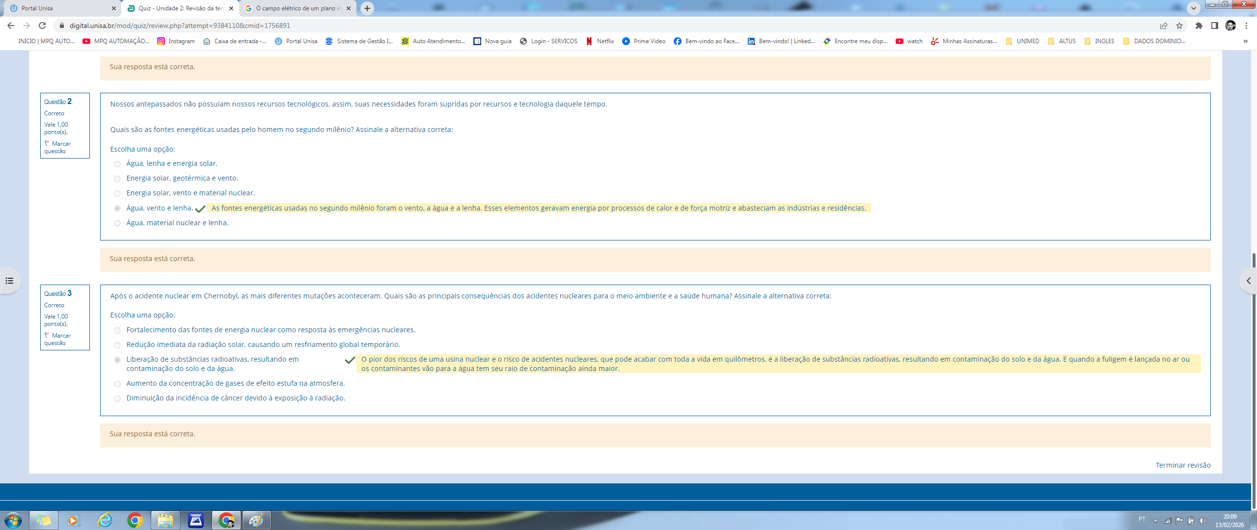 INÍCIO MPQ MPQ AUTOMAÇÃO... Instagram Caixa de entrada Portal Unisa Sistema de Gestão I... Auto Atendimento... Nova guia Login Netflix Prime Video Bem-vindo ao Face... Bem-vindo! Linked.. Encontre meu disp... watch Minhas UNIMED ALTUS INGLES DADOS DOMINIO.. Sua resposta está correta. Questão 2 Nossos antepassados não possuíam nossos recursos tecnológicos, assim, suas necessidades foram supridas por recursos e tecnologia daquele tempo. Correto Vale 1,00 ponto(s). Quais são as fontes energéticas usadas pelo homem no segundo milênio? Assinale a alternativa correta: P Marcar questão Escolha uma opção: Água, lenha e energia solar. Energia solar, geotérmica e vento. Energia solar, vento e material nuclear. Água, vento e lenha. As fontes energéticas usadas no segundo milênio foram vento, a água e a lenha. Esses elementos geravam energia por processos de calor e de força motriz e abasteciam as indústrias e residências. Água, material nuclear e lenha. Sua resposta está correta. Questão 3 Após acidente nuclear em Chernobyl, as mais diferentes mutações aconteceram. Quais são as principais consequências dos acidentes nucleares para meio ambiente e a saúde humana? Assinale a alternativa correta: Correto Vale 1,00 Escolha uma opção: ponto(s). Fortalecimento das fontes de energia nuclear como resposta às emergências nucleares. P Marcar questão Redução imediata da radiação solar, causando um resfriamento global temporário. Liberação de substâncias radioativas, resultando em pior dos riscos de uma usina nuclear e risco de acidentes nucleares, que pode acabar com toda a vida em quilômetros, é a liberação de substâncias radioativas, resultando em contaminação do solo e da água. E quando a fuligem é lançada no ar ou contaminação do solo e da água. os contaminantes vão para a água tem seu raio de contaminação ainda maior. Aumento da concentração de gases de efeito estufa na atmosfera. Diminuição da incidência de câncer devido à exposição à radiação. Sua resposta está correta. Terminar revisão