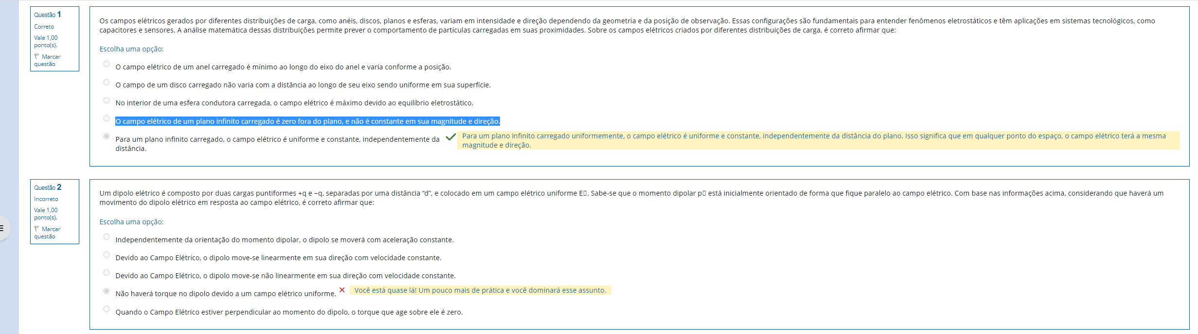 Questão 1 Os campos elétricos gerados por diferentes distribuições de carga, como anéis, discos, planos e esferas, variam em intensidade e direção dependendo da geometria e da posição de observação. Essas configurações são fundamentais para entender fenômenos eletrostáticos e têm aplicações em sistemas tecnológicos, como Correto capacitores e sensores. A análise matemática dessas distribuições permite prever comportamento de partículas carregadas em suas proximidades. Sobre os campos elétricos criados por diferentes distribuições de carga, é correto afirmar que: Vale 1.00 ponto(s). Escolha uma opção: P Marcar questão campo elétrico de um anel carregado é mínimo ao longo do eixo do anel e varia conforme a posição. campo de um disco carregado não varia com a distância ao longo de seu eixo sendo uniforme em sua superfície. No interior de uma esfera condutora carregada, campo elétrico é máximo devido ao equilíbrio eletrostático. campo elétrico de um plano infinito carregado é zero fora do plano, e não é constante em sua magnitude e direção Para um plano infinito carregado, campo elétrico é uniforme e constante, independentemente da Para um plano infinito carregado uniformemente, campo elétrico é uniforme e constante, independentemente da distância do plano. Isso significa que em qualquer ponto do espaço, campo elétrico terá a mesma distância. magnitude direção. Questão 2 Um dipolo elétrico é composto por duas cargas puntiformes +q e separadas por uma distância "d", e colocado em um campo elétrico uniforme ED. Sabe-se que momento dipolar está inicialmente orientado de forma que fique paralelo ao campo elétrico. Com base nas informações acima, considerando que haverá um Incorreto movimento do dipolo elétrico em resposta ao campo elétrico, é correto afirmar que: Vale 1,00 ponto(s). Escolha uma opção: P Marcar questão Independentemente da orientação do momento dipolar, dipolo se moverá com aceleração constante. Devido ao Campo Elétrico, dipolo move-se linearmente em sua direção com velocidade constante. Devido ao Campo Elétrico, dipolo move-se não linearmente em sua direção com velocidade constante. Não haverá torque no dipolo devido a um campo elétrico uniforme. Você está quase lá! Um pouco mais de prática e você dominará esse assunto. Quando 0 Campo Elétrico estiver perpendicular ao momento do dipolo, torque que age sobre ele é zero.