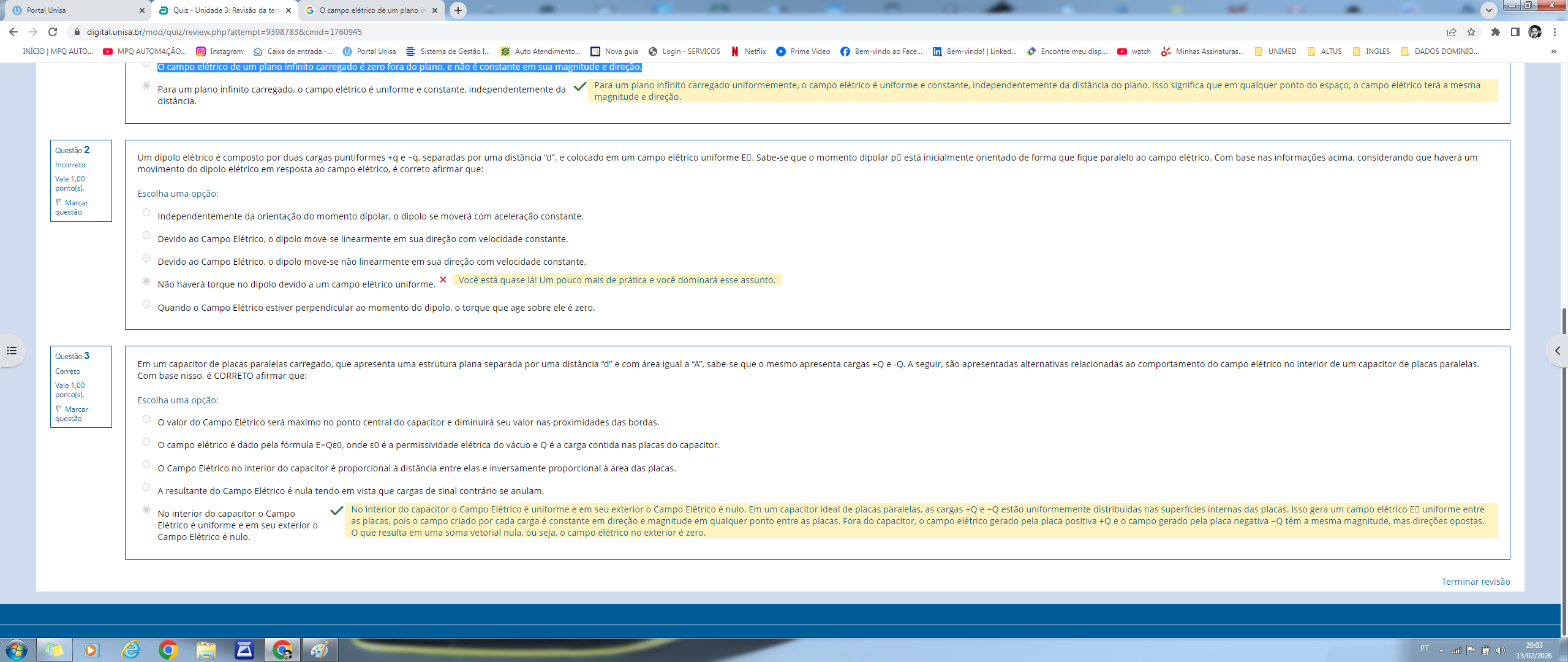 MPQ AUTO.. MPQ AUTOMAÇÃO... Instagram Caixa de entrada Portal Unisa Sistema de Gestão I... Auto Atendimento... Nova guia Login SERVICOS Netflix Prime Video Bem-vindo ao Face... Bem-vindo! Linked.. Encontre meu disp.. watch Minhas UNIMED ALTUS INGLES DADOS DOMINIO.. campo um plano zero fora do plano, não constante em sua Para um plano infinito carregado, campo elétrico é uniforme e constante, independentemente da Para um plano infinito carregado uniformemente, 0 campo elétrico é uniforme e constante, independentemente da distância do plano. Isso significa que em qualquer ponto do espaço, campo elétrico terá a mesma distância. magnitude direção. Questão 2 Um dipolo elétrico é composto por duas cargas puntiformes +q e separadas por uma distância "d", e colocado em um campo elétrico uniforme Sabe-se que momento dipolar está inicialmente orientado de forma que fique paralelo ao campo elétrico. Com base nas informações acima, considerando que haverá um Incorreto movimento do dipolo elétrico em resposta ao campo elétrico, é correto afirmar que: Vale 1,00 ponto(s). Escolha uma opção: P Marcar questão Independentemente da orientação do momento dipolar, dipolo se moverá com aceleração constante. Devido ao Campo Elétrico, dipolo move-se linearmente em sua direção com velocidade constante. Devido ao Campo Elétrico, dipolo move-se não linearmente em sua direção com velocidade constante. Não haverá torque no dipolo devido a um campo elétrico uniforme. Você está quase Um pouco mais de prática e você dominará esse assunto. Quando Campo Elétrico estiver perpendicular ao momento do dipolo, torque que age sobre ele é zero. Questão 3 Em um capacitor de placas paralelas carregado, que apresenta uma estrutura plana separada por uma distância "d" e com área igual a "A", sabe-se que mesmo apresenta cargas +Q e -Q. A seguir, são apresentadas alternativas relacionadas ao comportamento do campo elétrico no interior de um capacitor de placas paralelas. Correto Com base nisso, CORRETO afirmar que: Vale 1,00 ponto(s). Escolha uma opção: P Marcar questão valor do Campo Elétrico será máximo no ponto central do capacitor e diminuirá seu valor nas proximidades das bordas. campo elétrico é dado pela fórmula onde é a permissividade elétrica do vácuo e Q é a carga contida nas placas do capacitor. Campo Elétrico no interior do capacitor proporcional distância entre elas e inversamente proporcional área das placas. A resultante do Campo Elétrico é nula tendo em vista que cargas de sinal contrário se anulam. No interior do capacitor Campo No interior do capacitor Campo Elétrico é uniforme e em seu exterior Campo Elétrico é nulo. Em um capacitor ideal de placas paralelas, as cargas +Q e -Q estão uniformemente distribuídas nas internas das placas. Isso gera um campo elétrico uniforme entre Elétrico é uniforme e em seu exterior as placas, pois campo criado por cada carga é constante em direção e magnitude em qualquer ponto entre as placas. Fora do capacitor, campo elétrico gerado pela placa positiva +Q e campo gerado pela placa negativa -Q têm a mesma magnitude, mas direções opostas. Campo Elétrico é nulo. que resulta em uma soma vetorial nula, ou seja, O campo elétrico no exterior é zero. Terminar revisão