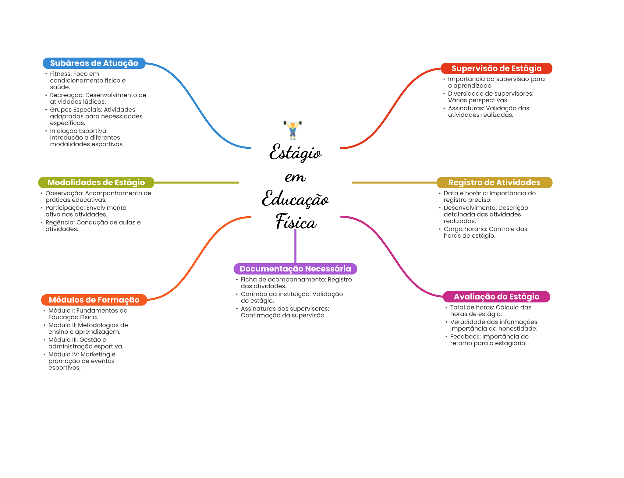 Subáreas de Atuação Supervisão de Estágio Fitness: Foco em condicionamento físico e Importância da supervisão para saúde. aprendizado. Recreação: Desenvolvimento de Diversidade de supervisores: atividades lúdicas. Várias perspectivas. Grupos Especiais: Atividades Assinaturas: Validação das adaptadas para necessidades atividades realizadas. específicas. Iniciação Esportiva: Introdução a diferentes modalidades esportivas. Estágio em Modalidades de Estágio Registro de Atividades Observação: Acompanhamento de Educação Data e horário: Importância do práticas educativas. registro preciso. Participação: Envolvimento Desenvolvimento Descrição ativo nas atividades. detalhada das atividades Regência: Condução de aulas e Física realizadas. atividades. Carga horária: Controle das horas de estágio. Documentação Necessária Ficha de acompanhamento: Registro das atividades. Carimbo da instituição: Validação Módulos de Formação do estágio. Avaliação do Estágio Assinaturas dos supervisores: Total de horas: Cálculo das Módulo I: Fundamentos da Educação Física. Confirmação da supervisão. horas de estágio. Módulo II: Metodologias de Veracidade das informações: ensino e aprendizagem. Importância da honestidade. Módulo III: Gestão e Feedback: Importância do administração esportiva. retorno para estagiário. Módulo IV: Marketing e promoção de eventos esportivos.