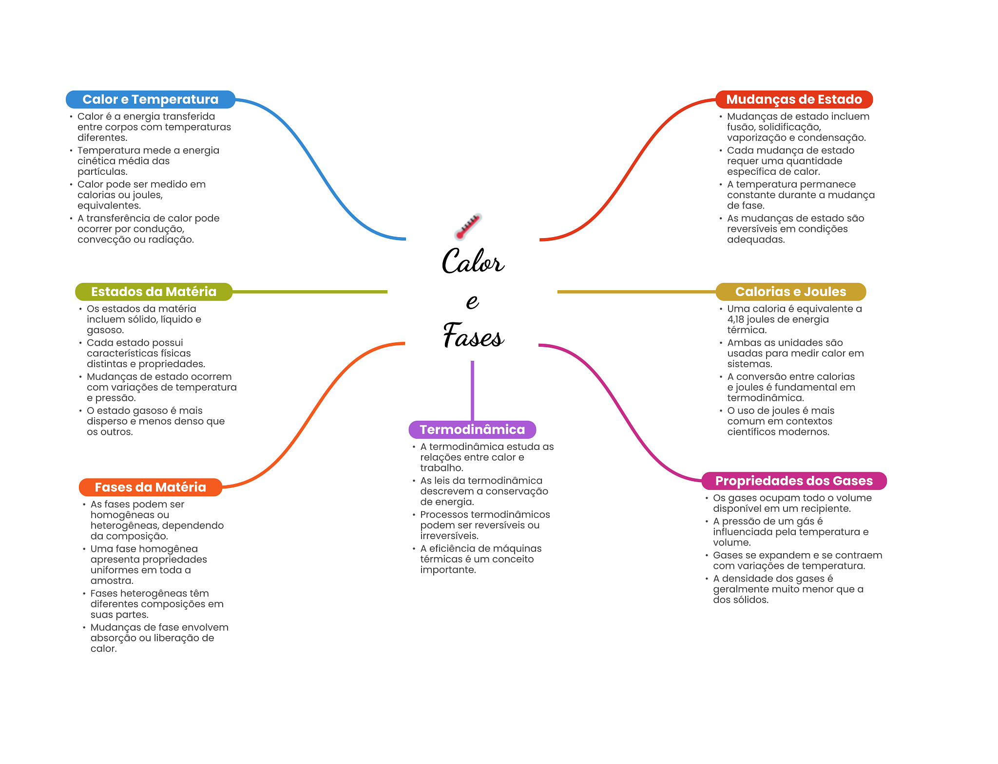 Calor e Temperatura Mudanças de Estado Calor é a energia transferida Mudanças de estado incluem entre corpos com temperaturas fusão, solidificação, diferentes. vaporização e condensação. Temperatura mede a energia Cada mudança de estado cinética média das requer uma quantidade partículas. específica de calor. Calor pode ser medido em A temperatura permanece calorias ou joules, constante durante a mudança equivalentes. de fase. A transferência de calor pode As mudanças de estado são ocorrer por condução, reversíveis em condições convecção ou radiação. adequadas. Calor Estados da Matéria Calorias e Joules Os estados da matéria e Uma caloria é equivalente a incluem sólido, líquido e 4,18 joules de energia gasoso. Fases térmica. Cada estado possui Ambas as unidades são características físicas usadas para medir calor em distintas e propriedades. sistemas. Mudanças de estado ocorrem A conversão entre calorias com variações de temperatura e joules é fundamental em e pressão. termodinâmica. estado gasoso é mais O uso de joules é mais disperso e menos denso que comum em contextos OS outros. Termodinâmica científicos modernos. A termodinâmica estuda as relações entre calor e trabalho. As leis da termodinâmica Fases da Matéria Propriedades dos Gases descrevem a conservação As fases podem ser de energia. Os gases ocupam todo volume homogêneas ou Processos termodinâmicos disponível em um recipiente. heterogêneas, dependendo podem ser reversíveis ou A pressão de um gás é da composição. irreversíveis. influenciada pela temperatura e volume. Uma fase homogênea A eficiência de máquinas apresenta propriedades térmicas é um conceito Gases se expandem e se contraem uniformes em toda a importante. com variações de temperatura. amostra. A densidade dos gases é Fases heterogêneas têm geralmente muito menor que a diferentes composições em dos sólidos. suas partes. Mudanças de fase envolvem absorção ou liberação de calor.