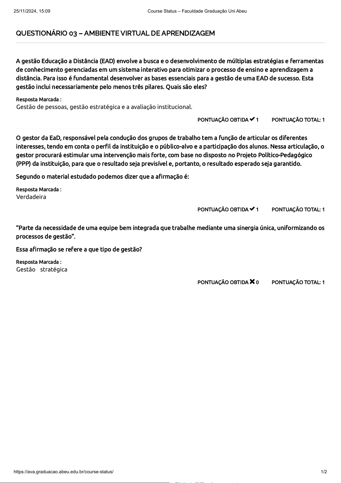 QUESTIONÁRIO 03 – AMBIENTE VIRTUAL DE APRENDIZAGEM PONTUAÇÃO TOTAL: 1PONTUAÇÃO OBTIDA 1 A gestão Educação a Distância (EAD) envolve a busca e o desenvolvimento de múltiplas estratégias e ferramentas de conhecimento gerenciadas em um sistema interativo para otimizar o processo de ensino e aprendizagem a distância. Para isso é fundamental desenvolver as bases essenciais para a gestão de uma EAD de sucesso. Esta gestão inclui necessariamente pelo menos três pilares. Quais são eles? Resposta Marcada : Gestão de pessoas, gestão estratégica e a avaliação institucional. PONTUAÇÃO TOTAL: 1PONTUAÇÃO OBTIDA 1 O gestor da EaD, responsável pela condução dos grupos de trabalho tem a função de articular os diferentes interesses, tendo em conta o per�l da instituição e o público-alvo e a participação dos alunos. Nessa articulação, o gestor procurará estimular uma intervenção mais forte, com base no disposto no Projeto Político-Pedagógico (PPP) da instituição, para que o resultado seja previsível e, portanto, o resultado esperado seja garantido. Segundo o material estudado podemos dizer que a a�rmação é: Resposta Marcada : Verdadeira PONTUAÇÃO TOTAL: 1PONTUAÇÃO OBTIDA 0 “Parte da necessidade de uma equipe bem integrada que trabalhe mediante uma sinergia única, uniformizando os processos de gestão”. Essa a�rmação se refere a que tipo de gestão? Resposta Marcada : Gestão estratégica 25/11/2024, 15:09 Course Status – Faculdade Graduação Uni Abeu https://ava.graduacao.abeu.edu.br/course-status/ 1/2 4 / 5 PONTUAÇÃO TOTAL: 1PONTUAÇÃO OBTIDA 1 Sobre a organização da manutenção e infraestrutura em programas e cursos de EaD, julgue as a�rmações a seguir. I- O pro�ssional da modalidade de EaD deve estar aberto a mudanças e capaz de trabalhar em equipe, estar na posição de facilitador, orientar a construção do conhecimento, ou seja, deve haver uma reorientação do ensino que acontece acidentalmente gerenciamento de ensino e aprendizagem e suporte aos alunos encontram, exploram e selecionam informações multimídia. II- Conhecendo a estrutura do ensino a distância dentro e fora da instituição, o gestor deve desenvolver três características essenciais para o correto desenvolvimento de seu trabalho para atender às necessidades do público-alvo. III- O responsável pela EaD deve oferecer segurança ao aluno e em geral saber como funciona toda a estrutura institucional para utilizar com e�ciência as exigências da EaD. IV- A re�exão sobre a gestão EaD permeia uma uniformidade de ações de pro�ssionais que, juntos, quebrantam o desenvolvimento da EaD como um todo, a partir da criação de antigos métodos, antigos arranjos didáticos e formas de interação, mediados pelo uso da Internet e das TIC’s mais recentes. Resposta Marcada : I, II e III estão corretas PONTUAÇÃO TOTAL: 1PONTUAÇÃO OBTIDA 1 Interação síncrona entre um grupo de participantes de um curso ou disciplina para discutir temas de interesse mútuo em tempo real. Os bate-papos são úteis quando um grupo não pode se encontrar pessoalmente em reuniões para que possam compartilhar experiências com outras pessoas do mesmo curso. Também é muito útil quando um aluno não pode comparecer presencialmente para discutir o conteúdo da disciplina com o professor. Essa a�rmação se refere a qual elemento para interação? Resposta Marcada : Chat Total de Pontos 25/11/2024, 15:09 Course Status – Faculdade Graduação Uni Abeu https://ava.graduacao.abeu.edu.br/course-status/ 2/2