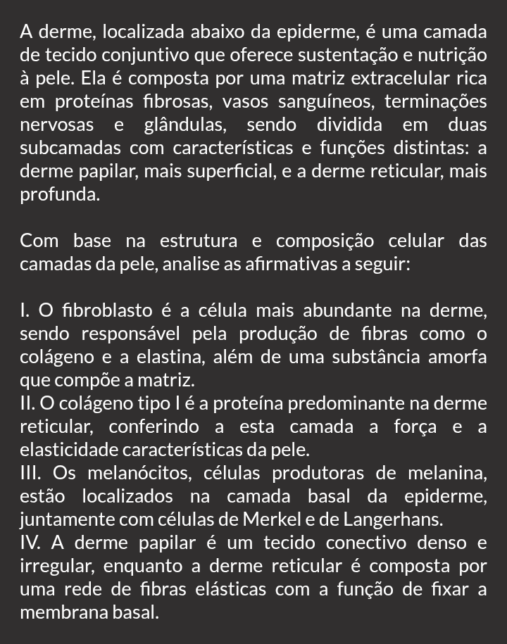 A derme, localizada abaixo da epiderme, é uma camada de tecido conjuntivo que oferece sustentação e nutrição à pele. Ela é composta por uma matriz extracelular rica em proteínas fibrosas, vasos sanguíneos, terminações nervosas e glândulas, sendo dividida em duas subcamadas com características e funções distintas: a derme papilar, mais superficial, e a derme reticular, mais profunda. Com base na estrutura e composição celular das camadas da pele, analise as afirmativas a seguir: I. fibroblasto é a célula mais abundante na derme, sendo responsável pela produção de fibras como o colágeno e a elastina, além de uma substância amorfa que compõe a matriz. II. colágeno tipo é a proteína predominante na derme reticular, conferindo a esta camada a força e a elasticidade características da pele. III. Os melanócitos, células produtoras de melanina, estão localizados na camada basal da epiderme, juntamente com células de Merkel e de Langerhans. IV. A derme papilar é um tecido conectivo denso e irregular, enquanto a derme reticular é composta por uma rede de fibras elásticas com a função de fixar a membrana basal.