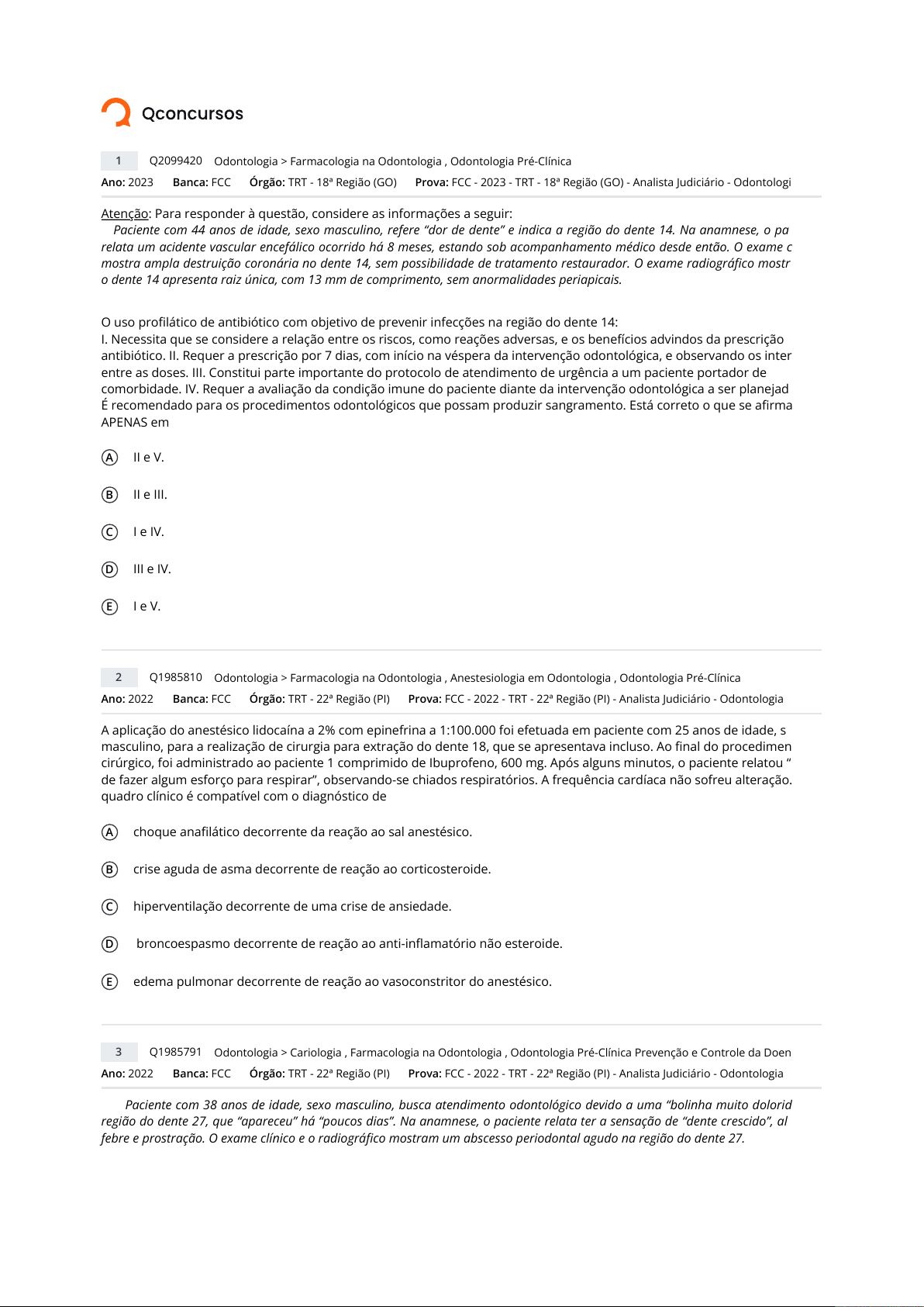 www.qconcursos.com Ano: 2023 Banca: FCC Órgão: TRT - 18ª Região (GO) Atenção: Para responder à questão, considere as informações a seguir: Paciente com 44 anos de idade, sexo masculino, refere “dor de dente” e indica a região do dente 14. Na anamnese, o paciente relata um acidente vascular encefálico ocorrido há 8 meses, estando sob acompanhamento médico desde então. O exame clínico mostra ampla destruição coronária no dente 14, sem possibilidade de tratamento restaurador. O exame radiográfico mostra que o dente 14 apresenta raiz única, com 13 mm de comprimento, sem anormalidades periapicais. O uso profilático de antibiótico com objetivo de prevenir infecções na região do dente 14: I. Necessita que se considere a relação entre os riscos, como reações adversas, e os benefícios advindos da prescrição do antibiótico. II. Requer a prescrição por 7 dias, com início na véspera da intervenção odontológica, e observando os intervalos entre as doses. III. Constitui parte importante do protocolo de atendimento de urgência a um paciente portador de comorbidade. IV. Requer a avaliação da condição imune do paciente diante da intervenção odontológica a ser planejada. V. É recomendado para os procedimentos odontológicos que possam produzir sangramento. Está correto o que se afirma APENAS em A II e V. B II e III. C I e IV. D III e IV. E I e V. Ano: 2022 Banca: FCC Órgão: TRT - 22ª Região (PI) A aplicação do anestésico lidocaína a 2% com epinefrina a 1:100.000 foi efetuada em paciente com 25 anos de idade, sexo masculino, para a realização de cirurgia para extração do dente 18, que se apresentava incluso. Ao final do procedimento cirúrgico, foi administrado ao paciente 1 comprimido de Ibuprofeno, 600 mg. Após alguns minutos, o paciente relatou “ter de fazer algum esforço para respirar”, observando-se chiados respiratórios. A frequência cardíaca não sofreu alteração. O quadro clínico é compatível com o diagnóstico de A choque anafilático decorrente da reação ao sal anestésico. B crise aguda de asma decorrente de reação ao corticosteroide. C hiperventilação decorrente de uma crise de ansiedade. D broncoespasmo decorrente de reação ao anti-inflamatório não esteroide. E edema pulmonar decorrente de reação ao vasoconstritor do anestésico. Ano: 2022 Banca: FCC Órgão: TRT - 22ª Região (PI) Paciente com 38 anos de idade, sexo masculino, busca atendimento odontológico devido a uma “bolinha muito dolorida” na região do dente 27, que “apareceu” há “poucos dias”. Na anamnese, o paciente relata ter a sensação de “dente crescido”, além de febre e prostração. O exame clínico e o radiográfico mostram um abscesso periodontal agudo na região do dente 27. 1 Q2099420 > Odontologia Farmacologia na Odontologia , Odontologia Pré-Clínica Prova: FCC - 2023 - TRT - 18ª Região (GO) - Analista Judiciário - Odontologia 2 Q1985810 > Odontologia Farmacologia na Odontologia , Anestesiologia em Odontologia , Odontologia Pré-Clínica Prova: FCC - 2022 - TRT - 22ª Região (PI) - Analista Judiciário - Odontologia 3 Q1985791 > Odontologia Cariologia , Farmacologia na Odontologia , Odontologia Pré-Clínica Prevenção e Controle da Doença Prova: FCC - 2022 - TRT - 22ª Região (PI) - Analista Judiciário - Odontologia https://www.qconcursos.com/questoes-de-concursos/quest…true&per_page=20&sort=newest&subject_ids%5B%5D=1617 18/02/2026, 08:49 Página 1 de 9 Mobile User O controle químico do biofilme supragengival deve ser feito por meio de A cloreto de cetilpiridínio, 3 vezes ao dia, por 7 dias. B digluconato de clorexidina a 0,12%, a cada 12 horas, por 7 dias. C peróxido de hidrogênio, a cada 12 horas, por 10 dias. D cloreto de cetilpiridínio, 3 vezes ao dia, em dias alternados. E digluconato de clorexidina a 0,12%, a cada 12 horas, uso contínuo. Ano: 2022 Banca: FCC Órgão: TRT - 22ª Região (PI) O tratamento medicamentoso do abscesso periodontal agudo consiste na prescrição de A Claritromicina, 500 mg a cada 12 horas, por 7 dias e reavaliação do quadro clínico. B Metronidazol, 250 mg, a cada 4 horas, por 7 dias e reavaliação do quadro clínico. C Amoxicilina, 500 mg, a cada 6 horas, por 10 dias para evitar reincidência do quadro agudo. D Amoxicilina, 500 mg, a cada 8 horas, por 3 dias e reavaliação do quadro clínico. E Metronidazol, 250 mg, a cada 8 horas, por 14 dias para evitar reincidência do quadro agudo. Ano: 2022 Banca: FCC Órgão: TRT - 22ª Região (PI) Paciente com 31 anos de idade, sexo masculino, relata “não conseguir abrir a boca” após a cirurgia para extração do dente 47, realizada há dois dias. O exame clínico mostra a presença de trismo. A abordagem medicamentosa para tratamento do trismo inclui a prescrição de A ibuprofeno, 200 mg, a cada 6 horas, por uma semana. B dipirona sódica, 500 mg, a cada 4 horas, por 2 dias. C tramadol, 50 mg, a cada 4 horas, por 2 dias. D dipirona sódica, 1 mg, a cada 4 horas, por uma semana. E tramadol, 50 mg, a cada 4 horas, por uma semana. Ano: 2022 Banca: FCC Órgão: TRT - 22ª Região (PI) Paciente com 22 anos de idade, sexo feminino, tem indicação para extração do dente 46. A paciente não refere doenças crônicas na anamnese. A anestesia por bloqueio regional utilizando um tubete de prilocaína a 3% com felipressina a 0,03 UI/mL foi iniciada e, durante procedimento anestésico, a paciente passou a apresentar tremor nas mãos. O profissional interrompeu o procedimento e observou quadro clínico compatível com a sobredosagem do sal anestésico por injeção intravascular acidental. A conduta do cirurgião-dentista consiste em 4 Q1985789 > Odontologia Periodontia , Farmacologia na Odontologia , Odontologia Pré-Clínica Prova: FCC - 2022 - TRT - 22ª Região (PI) - Analista Judiciário - Odontologia 5 Q1985784 > Odontologia Farmacologia na Odontologia , Odontologia Pré-Clínica Prova: FCC - 2022 - TRT - 22ª Re