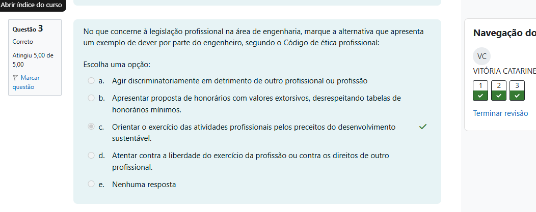 Abrir do curso Questão 3 No que concerne à legislação profissional na de engenharia, marque a alternativa que apresenta Navegação Correto um exemplo de dever por parte do engenheiro, segundo O Código de ética profissional: Atingiu 5,00 de VC 5,00 Escolha uma opção: VITÓRIA CATARIN Marcar a. Agir discriminatoriamente em detrimento de outro profissional ou profissão questão 1 2 3 b. Apresentar proposta de honorários com valores extorsivos, desrespeitando tabelas de honorários mínimos. Terminar revisão C. Orientar exercício das atividades profissionais pelos preceitos do desenvolvimento sustentável. d. Atentar contra a liberdade do exercício da profissão ou contra direitos de outro profissional. e. Nenhuma resposta