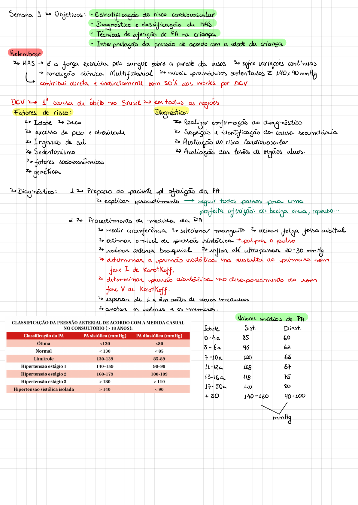 Semana 3 2 Objetivos:- Estratificaçãodo risco cardiovascular -Diagnóstico e classificaçãoda HAS - Técnicas de aferição de PA na criança -Interpretaçãoda pressão de acordo com a idade da criança Relembrar ↳>HAS- éa força exercida pelo sangue sobre a parede dos vasos 2 sofre variacies continuas ↳ -> condiçãoclínico. Multifatorial 20 niveis prussócias sustentados? 140x90mmHg contribui direta e indiretamente com 50% das mortes por DCV DCV 2 1: causa de óbito no Brasil 2 em todas as regiões Fatores de risco: Diagnóstico: ->Idade 2 sexo =>Realizar confirmaçãodo diagnóstico ↳ excesso de peso e obesidade ↳Suspeiçar e identificaçardocausa secundário &>Ingestãode sah =>Avaliaçãodo risco Cardiovascular &> Sedentarismo 2 Avaliaçãodas lesões de orgãos alvos. &>fatores socioeconômicos 2genética 2 Diagnóstico:12 Preparo do paciente pl aferição da PA 2 explicar procedimento - seguir todos passos parar uma perfeita aferição:ex:bexiga cheia, repouso... 2 2 Procedimento de medida da DA ↳medir circunferência do selecionar manguito deixar folga fossa cubital ↳ estimar o nivel de pressosistólica palpar o pulso 3 palpan artéria branquial 2 inflar atéultrapassar 20-30 mmHg ↳>determinar a priscovistólicona ausculta do primeiro som fare I de Rorothoft. 2determinar pressão diastólica no desaparecimentodo som fase V de Korotkoff. 2 esperar de 1 a 2mantes de novos medidos ↳.anotar as volores e os membros. Valores médios de PA Idade Sist. Diast. 0-4a 85 60 5 -6a 95 62 7- 10 a 200 65 11-12a 108 67 13-16a 118 75 17-50a 120 80 +50 140-160 90 -100 mmHg 2.Aferição de PA na criança &>Cuidados importantes:- posicionamento - tranquila por alguns min. - bexiga vazia - sem realizaçode esforço ↳>escolha do manguito adequado: *cr. nas ultimas horas ↳medir a circunferência do braço ↳> crianças com obsidade, diabetes ou outras ↳determinar o ponto médio condições cardiovasculares ↳tamanho ideal:cobre 40% da largura se ↳ verificagorfeita a cado 80-100% do compriment consulta. -> para aferição - seguir os mesmos passes 2 manguitos de punto nodever se utilizar dos. 2 Nãoháestudes que comprovem => Avaliaçãodos valores encontrados na PA ~a classificaçãode PA pediátricon kva em consi- demagar - PA, estrutura e idade. ⑧- ↳Ex:PA=101x52 mmHg - sinaliza na tabela o valor mais próximo * A classificaçãofinal considera-se o maiopercentil ↳) no caso - 495 e aplica-se na classificago de D. Ade acordo com a faixaetária. =>Estratificação de risco cardiovascular o Reconhecimento dos fatores de risco cardiovascular =>Identificaçãode resses em organs-alvo 2 Classificaçãodo risco:baito/moderado/ alto · niveis de PA · FRCV associados Fatores de riscos associados · Lesões de órgãos- alvos · Dav/renal estabelecidas ↳.Doenca Cardiovascular 2. Doença coronariana - Angina -Infarto do miocárdio - Insuficiência Cardiaca 2 DA -Doenças da aorta - Aneurismas, Hematomas, Ulcerações &> Doença Cerebrovascular &> Doença Renal Crônica - AVC isquêmico - estágio 4 (TFG-e:30 mh/min - Ave hemorrágico &>Retinopatia Hipertensiva . Acidente isquêmico transitório - Hemorragia/Exsudato/Papitedema 2 Razões para a estimativa de RCV ↳>estimar os riscos de eventos cordiovasculares em médio e longo prazos ↳>determinar o nivel de atençãoa saide - como frequência dos atendimentos &>determinar a precocidade de iniciodo tratamento farmacológico ↳>determinar a intensidade do controle dos fatores de risco modificáveis FR: 2.Desafios na avaliaçodo visco cardiovascular na HA: ->idade 2 duraçãoda exposiçarà doença ou au Fi (idade vascular e idade metabólica ( 2 momento da aferição e valor da PA (MAPA,MRPA) -> +50% dos pacientes hipertensos tem FRCV 2 a identificação de FR adicionais deve fazer parte da avaliaçardiagnóstica do paciente hipertenso ↳ presença de história familiar de DCV &> O visco cardiovascular deve ser estimado em todos os pacientes hipertensos por meio de escores simples baseados nos niveis de PA, presença de FR adicionais e comorbidades. ->ADICIONAR O CREC NSTE
