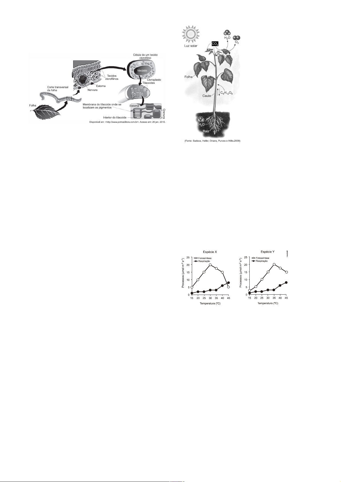 TEXTO PARA A PRÓXIMA QUESTÃO: Com base na ilustração abaixo, que apresenta uma enorme variedade de estruturas que viabilizam a realização da fotossíntese, responda à(s) questão(ões). 1. (Uefs 2016) O processo fotossintético realizado pela estrutura em destaque a) ocorre na epiderme do vegetal. b) é limitado a organismos pluricelulares. c) tem como objetivo liberar o oxigênio para a atmosfera. d) ocorre em dois compartimentos distintos do mesmo orgânulo. e) utiliza a água, absorvida pelas folhas, na membrana do tilacoide. 2. (Ufjf-pism 1 2015) Recentemente, um estudante de engenharia do Royal College of Art, na Inglaterra, desenvolveu uma folha artificial capaz de produzir e liberar oxigênio na atmosfera. Resumidamente, o experimento consistiu na criação de uma espécie de tecido composto por proteínas, onde foram fixados cloroplastos extraídos de plantas reais, sendo possível recriar em laboratório uma das etapas do processo da fotossíntese. Considerando as informações apresentadas, é CORRETO afirmar que: a) a etapa da fotossíntese recriada em laboratório consiste no uso de energia luminosa para a quebra de moléculas de glicose e liberação de oxigênio. b) nas folhas naturais, a liberação de oxigênio decorrente do processo fotossintético é realizada através de estruturas chamadas hidatódios. c) a etapa da fotossíntese recriada em laboratório teria tido o mesmo sucesso se, ao invés de cloroplastos, tivessem sido fixadas mitocôndrias no tecido composto por proteínas. d) em condições naturais, o processo da fotossíntese recriado em laboratório é influenciado pela composição mineral do solo. e) a etapa da fotossíntese recriada em laboratório consiste no uso de energia luminosa para a quebra de moléculas de água e liberação de oxigênio. 3. (Uepa 2015) Se todos os açúcares produzidos pelo processo ilustrado abaixo em um ano, tivessem a forma de cubos de açúcar, haveria 300 quatrilhões deles. Se fossem dispostos em linha, esses cubos se estenderiam da Terra até Plutão. Isso representa uma imensa produção de energia. Sobre o processo abordado no enunciado, observe a imagem abaixo e analise as afirmativas. I. Os produtos liberados para o ambiente são água e oxigênio. II. O processo ilustrado acima refere-se à respiração vegetal. III. Ocorre absorção de dióxido de carbono pelas folhas. IV. É um processo que ocorre na presença da luz solar. V. A água utilizada no processo é absorvida pelas folhas. A alternativa que contém todas as afirmativas corretas é: a) I e II b) I, III e IV c) I, III e V d) II, III e V e) II, III, IV e V 4. (Unicamp 2015) O crescimento das plantas é afetado pelo balanço entre a fotossíntese e a respiração. O padrão de resposta desses dois importantes processos fisiológicos em função da temperatura é apresentado nos gráficos abaixo, relativos a duas espécies de plantas. Sobre as espécies X e Y, é correto afirmar: a) A espécie Y não apresenta ganho líquido de carbono a 15°C. b) As duas espécies têm perda líquida de carbono a 45°C. c) A espécie Y crescerá menos do que a espécie X a 25°C. d) As duas espécies têm ganho líquido de carbono a 45°C. 5. (Unesp 2014) Um pequeno agricultor construiu em sua propriedade uma estufa para cultivar alfaces pelo sistema de hidroponia, no qual as raízes são banhadas por uma solução aerada e com os nutrientes necessários ao desenvolvimento das plantas. Para obter plantas maiores e de crescimento mais rápido, o agricultor achou que poderia aumentar a eficiência fotossintética das plantas e para isso instalou em sua estufa equipamentos capazes de controlar a umidade e as concentrações de CO2 e de O2 na atmosfera ambiente, além de equipamentos para controlar a luminosidade e a temperatura. É correto afirmar que o equipamento para controle da a) umidade relativa do ar é bastante útil, pois, em ambiente mais úmido, os estômatos permanecerão fechados por mais tempo, aumentando a eficiência fotossintética. b) temperatura é dispensável, pois, independentemente da temperatura ambiente, quanto maior a intensidade luminosa maior a eficiência fotossintética. c) concentração de CO2 é bastante útil, pois um aumento na concentração desse gás pode, até certo limite, aumentar a eficiência fotossintética. d) luminosidade é dispensável, pois, independentemente da intensidade luminosa, quanto maior a temperatura ambiente maior a eficiência fotossintética. e) concentração de O2 é bastante útil, pois quanto maior a concentração desse gás na atmosfera ambiente maior a eficiência fotossintética. 6. (G1 - cftmg 2014) As reações químicas representadas no esquema podem ocorrer em uma mesma célula. Sobre essas reações químicas, é INCORRETO afirmar que a(o) a) oxigênio origina-se da molécula de água. b) fase luminosa é independente da fase química. c) carboidrato produzido gera outras substâncias. d) luz é fundamental para a excitação dos elétrons. 7. (Pucrj 2013) A fotossíntese é um processo complexo que ocorre em duas fases: fase luminosa e Ciclo de Calvin. Sobre as duas etapas da fotossíntese, foram feitas as seguintes afirmativas: I. Na fase luminosa, ocorre a conversão da energia solar em energia química. II. Na fase luminosa, ocorre liberação de oxigênio, produção de NADPH e consumo de ATP. III. No Ciclo de Calvin, o CO2 atmosférico é incorporado em moléculas orgânicas do cloroplasto. IV. O Ciclo de Calvin necessita indiretamente da luz, pois a produção de açúcar depende do ATP e NADPH produzidos na fase luminosa. Estão corretas: a) Somente I, II e III. b) Somente II, III e IV. c) Somente I, III e IV. d) Somente I, II e IV. e) Todas as afirmativas. 8. Analise as alternativas a seguir e marque aquela que melhor define o processo de quimiossíntese. a) A quimiossíntese é um processo em que há a produção de matéria orgânica a partir da energia luminosa. b) A quimiossíntese 