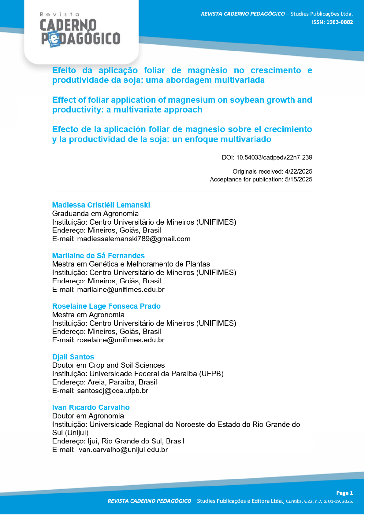 Revista REVISTA CADERNO PEDAGÓGICO Studies Publicações Ltda. CADERNO ISSN: 1983-0882 AGOGICO Efeito da aplicação foliar de magnésio no crescimento e produtividade da soja: uma abordagem multivariada Effect of foliar application of magnesium on soybean growth and productivity: a multivariate approach Efecto de la aplicación foliar de magnesio sobre el crecimiento y la productividad de la soja: un enfoque multivariado DOI: 10.54033/cadpedv22n7-239 Originals received: 4/22/2025 Acceptance for publication: 5/15/2025 Madiessa Cristiéli Lemanski Graduanda em Agronomia Instituição: Centro Universitário de Mineiros (UNIFIMES) Endereço: Mineiros, Goiás, Brasil E-mail: madiessalemanski789@gmail.com Marilaine de Sá Fernandes Mestra em Genética e Melhoramento de Plantas Instituição: Centro Universitário de Mineiros (UNIFIMES) Endereço: Mineiros, Goiás, Brasil E-mail: marilaine@unifimes.edu.br Roselaine Lage Fonseca Prado Mestra em Agronomia Instituição: Centro Universitário de Mineiros (UNIFIMES) Endereço: Mineiros, Goiás, Brasil E-mail: roselaine@unifimes.edu.br Djail Santos Doutor em Crop and Soil Sciences Instituição: Universidade Federal da Paraíba (UFPB) Endereço: Areia, Paraíba, Brasil E-mail: santosdj@cca.ufpb.br Ivan Ricardo Carvalho Doutor em Agronomia Instituição: Universidade Regional do Noroeste do Estado do Rio Grande do Sul (Unijuí) Endereço: Rio Grande do Sul, Brasil E-mail: Page 1 REVISTA CADERNO PEDAGÓGICO Studies Publicações e Editora Ltda., Curitiba, v.22, n.7, p. 01-19.2025.Revista REVISTA CADERNO PEDAGÓGICO Studies Publicações Ltda. CADERNO ISSN: 1983-0882 AGOGICO Rodrigo Vieira da Silva Doutor em Fitopatologia Instituição: Instituto Federal Goiano (IF Goiano) Endereço: Morrinhos, Goiás, Brasil E-mail: rodrigo.silva@ifgoiano.edu.br Alexandre Igor de Azevedo Pereira Doutor em Entomologia Instituição: Instituto Federal Goiano (IF Goiano) Endereço: Urutaí, Goiás, Brasil E-mail: alexandre.pereira@ifgoiano.edu.br Gustavo Santos Petersen Graduando em Agronomia Instituição: Centro Universitário de Mineiros (UNIFIMES) Endereço: Mineiros, Goiás, Brasil E-mail: gustavopetersen7@outlook.com Éder Vaz de Almeida Mestrando em Produção Vegetal Instituição: Universidade de Rio Verde (UniRV) Endereço: Rio Verde, Goiás, Brasil E-mail: ederalmeidavaz@yahoo.com.br Luiz Leonardo Ferreira Doutor em Agronomia Instituição: Centro Universitário de Mineiros (UNIFIMES) Endereço: Mineiros, Goiás, Brasil E-mail: leoagrozoo@hotmail.com RESUMO A aplicação foliar de magnésio (Mg) pode influenciar significativamente o crescimento e a produtividade da soja, impactando variáveis estruturais e reprodutivas da cultura. Este estudo avaliou diferentes manejos com Mg via foliar em um experimento conduzido em Mineiros-GO. O delineamento experimental foi em blocos ao acaso, com cinco tratamentos, e a análise estatística incluiu MANOVA, correlação de Pearson, análise de trilha, análise de variáveis canônicas e o índice MGIDI para ranqueamento dos tratamentos. Os resultados indicaram que os tratamentos influenciaram significativamente características analisadas. tratamento MgF5 se destacou como o mais eficiente, apresentando melhor desempenho nas características produtivas e maior proximidade ao ideótipo ideal. Dessa forma, recomenda-se o manejo com MgF5 para maximizar a produtividade da soja, uma vez que demonstrou superioridade na promoção do crescimento e no rendimento da cultura. Palavras-chave: Glycine max. Magnésio Foliar. Produtividade. Análise Multivar- iada. Page 2 REVISTA CADERNO PEDAGÓGICO Studies Publicações e Editora Ltda., Curitiba, v.22, n.7, p. 01-19.2025.Revista REVISTA CADERNO PEDAGÓGICO Studies Publicações Ltda. CADERNO ISSN: 1983-0882 AGOGICO ABSTRACT Foliar application of magnesium (Mg) can significantly influence soybean growth and productivity, impacting structural and reproductive variables of the crop. This study evaluated different managements with Mg via foliar application in an experiment conducted in Mineiros-GO. The experimental design was randomized blocks, with five treatments, and the statistical analysis included MANOVA, Pearson correlation, path analysis, canonical variable analysis and the MGIDI index for ranking the treatments. The results indicated that the treatments significantly influenced the analyzed characteristics. The MgF5 treatment stood out as the most efficient, presenting better performance in the productive characteristics and greater proximity to the ideal ideotype. Therefore, management with MgF5 is recommended to maximize soybean productivity, since it demonstrated superiority in promoting growth and crop yield. Keywords: Glycine max. Leaf Magnesium. Productivity. Multivariate Analysis. RESUMEN La aplicación foliar de magnesio (Mg) puede influir significativamente en el crecimiento y la productividad de la soja, impactando las variables estructurales y reproductivas del cultivo. Este estudio evaluó diferentes manejos con Mg vía aplicación foliar en un experimento realizado en Mineiros-GO. El diseño experimental fue de bloques al azar, con cinco tratamientos y el análisis estadístico incluyó MANOVA, correlación de Pearson, análisis de caminos, análisis de variables canónicas y el índice MGIDI para rankear los tratamientos. Los resultados indicaron que los tratamientos influyeron significativamente en las características analizadas. El tratamiento MgF5 se destacó como el más eficiente, presentando mejor desempeño en características productivas y mayor cercanía al ideotipo ideal. Por lo tanto, se recomienda el manejo con MgF5 para maximizar la productividad de la soja, ya que ha demostrado superioridad en la promoción del crecimiento y el rendimiento del cultivo. Palabras clave: Glycine max. Magnesio de las Hojas. Productividad. Análisis Multivariado. 1 INTRODUÇÃO A soja é uma das culturas mais importantes do mundo, destacando-se pela sua importante contribu