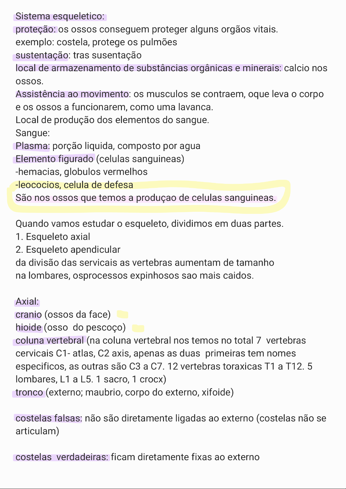 Sistema esqueletico: proteção: os conseguem proteger alguns orgãos vitais. exemplo: costela, protege os pulmões sustentação: tras susentação local de armazenamento de substâncias orgânicas e minerais: calcio nos OSSOS. Assistência ao movimento: os musculos se contraem, oque leva corpo e os a funcionarem, como uma lavanca. Local de produção dos elementos do sangue. Sangue: Plasma: porção liquida, composto por agua Elemento figurado (celulas sanguineas) -hemacias, globulos vermelhos -leococios, celula de defesa São nos que temos a produçao de celulas sanguineas. Quando vamos estudar esqueleto, dividimos em duas partes. 1. Esqueleto axial 2. Esqueleto apendicular da divisão das servicais as vertebras aumentam de tamanho na lombares, osprocessos expinhosos sao mais caidos. Axial: cranio (ossos da face) hioide (osso do pescoço) coluna vertebral (na coluna vertebral nos temos no total 7 vertebras cervicais C1- atlas, C2 axis, apenas as duas primeiras tem nomes especificos, as outras são C3 a C7. 12 vertebras toraxicas T1 a T12. 5 lombares, L1 a L5. 1 sacro, 1 crocx) tronco (externo; maubrio, corpo do externo, xifoide) costelas falsas: não são diretamente ligadas ao externo (costelas não se articulam) costelas verdadeiras: ficam diretamente fixas ao externocostelas flutuantes: ficam diretamente fixas ao externo -esqueleto apendicular. apenticular: membros: -cingulo: (une um membro ao corpo) -superior -equilio e clavicula (membro superior) -inferior, do quadril No total temos 206 -existem alguns fatores que podem alterar a contagem. Fator etario molera: OSSO frontal do rescem nasido (Chamado de fontanela) Bregma Osso Osso Sutura sagital Forame Lambda Crânio fetal Crânio adultoFatores etários Ílio Púbis Ísquio outros exemplos: do quadril de um adulto é formado por um unico do rescem nascido por Fatores individuais: -Persistência da divisão do frontal no adulto; -Ossos extranumerários podem ocorrer. (exemplo: vertebra numerica) Criterios de contagem. os sensamoides (ossos que estão no interior do tendão) e os osiculos da orelha, não são computados. menores -estribio -maderno -bigorna (tambem não estão na contagem) Classificação dos levando em consideração as formas dos OSSOS. Ossos longos. -comprimento maior que a largura exemplo: femur, umeroOsso longo Epífise proximal Cavidade medular Diáfise Epífise distal -Diafise: encontramos uma cavidade chamada cavidade medular. adulto: medula amarela criança:medula ossea vermelha. -Epifise: medula ossea vermelha. medula ossea vermelha: local de produção dos elementos figurados (celula sanguinea). conforme envelhecemos, a medula ossea é substituida pela medula ossea amarela. medula ossea amarela: armazena trigliceriduos ( gordura) -osso que não é longo e contém medula ossea vermelha é osso do quadril. medula ossea vermelha, presente tambem nas vertebras. Osso Plano comprimento equivale a largura (plano pois é fino) exemplo: escapula, (cranio: frontal, parietal e occipital)Osso plano Ex: frontal, parietal e occiptal Ex: escápula Osso curto comprimento equivale a largura, que equivale a expessura. exemplo: do carpo, do tarço. Osso curto Ex: ossos do carpo Ex: osso do tarso Osso irregular (forma indefinida) exemplo: vertebras, temporalOsso irregular Ex: vértebras Ex: temporal Osso pneumatico não tem forma definida, possui cavidades que são revestidas por mucosa, e essas cavidades são preenchidas por ar exemplo: frontal, mandibula, temporal, etmoide (nariz, cavidade nasal, esfemoide). Osso pneumático Ex: frontal, maxilar, temporal, etmóide* e esfenóide Ossos sesamoide interior do tendão exemplo: patelaOsso sesamóide Músculo Quadriceps Fêmur Patela Tendão patelar Fíbula Tíbia Ex: patela Periosteo: membrana que cobre os Os são revestidos por uma camada de tecido conjuntivo especializado, periósteo, com exceção das superfícies articulares, que são revestidas por cartilagem hialina. periósteo Tipos de substancia osseas: Compacto: apresenta poucos espaços e é a forma de tecido ósseo mais resistente. É encontrado abaixo do periósteo de todos os e constitui a maior parte das diáfises dos longos. Esponjoso: sempre localizado no interior do OSSO, protegido por uma camada de compacto.Osso compacto trabecular esponjoso Osso