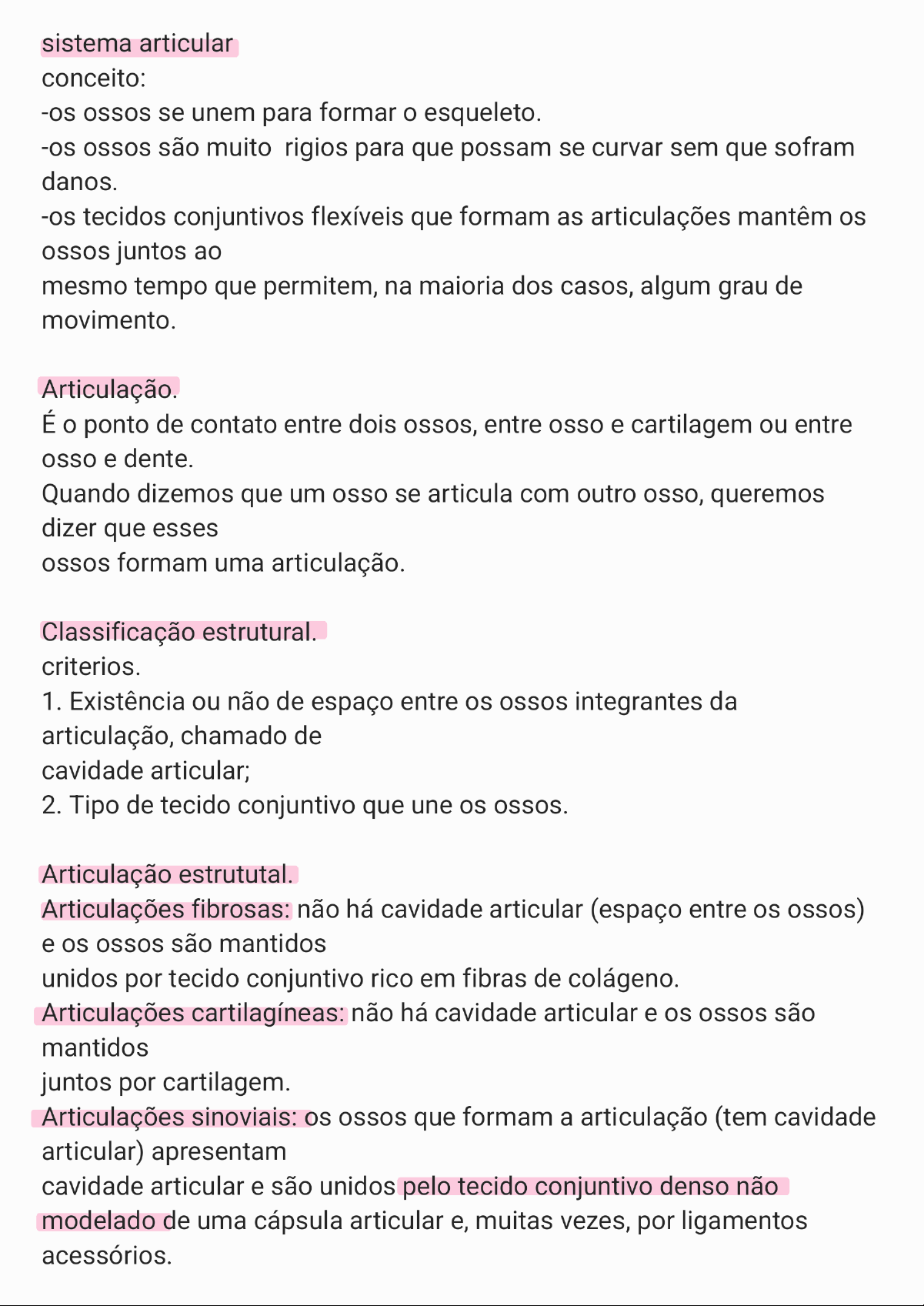 sistema articular conceito: -os OSSOS se unem para formar esqueleto. -os são muito rigios para que possam se curvar sem que sofram danos. -os tecidos conjuntivos flexíveis que formam as articulações mantêm os juntos ao mesmo tempo que permitem, na maioria dos casos, algum grau de movimento. Articulação. É o ponto de contato entre dois entre e cartilagem ou entre osso e dente. Quando dizemos que um se articula com outro queremos dizer que esses ossos formam uma articulação. Classificação estrutural. criterios. 1. Existência ou não de espaço entre os integrantes da articulação, chamado de cavidade articular; 2. Tipo de tecido conjuntivo que une os OSSOS. Articulação estrututal. Articulações fibrosas: não há cavidade articular (espaço entre os ossos) e os são mantidos unidos por tecido conjuntivo rico em fibras de colágeno. Articulações cartilagíneas: não há cavidade articular e os ossos são mantidos juntos por cartilagem. Articulações sinoviais: os que formam a articulação (tem cavidade articular) apresentam cavidade articular e são unidos pelo tecido conjuntivo denso não modelado de uma cápsula articular e, muitas vezes, por ligamentos acessórios.propriamente dito -frouxo: +celula, -prioteina -denso: -celula, +proteina (modelado e não modelado) especializado: cartilagem não especializado -hialina -fibrocartilagem Classificação funcional Relação com grau de movimento que permitem. Sinartrose: uma articulação imóvel. (não tem movimento) Anfiartrose: uma articulação discretamente móvel. (leve movimento) Diartrose: uma articulação livremente móvel. Todas as diartroses são articulações sinoviais. Elas apresentam várias formas e possibilitam diversos tipos diferentes. (auto grau de movimento). Articulação fibrosas -ha dois tipos de articulação fibrosas: 1- sindesmoses: possuem grande quantidade de tecido conjutivo EX: Sindesmose dentoalveolar (gonfose) EX: Sindesmose rádioulnar (Sinartrose) e Sindesmose tíbiofibular (Anfiartrose)2- Saturas: menos tecido conjutivo do que as sindesmoses e são encontradas principalmente entre os do crânio. podem ser sinartroses ou anfiartroses Tipo 1: Satura Plana: união linear retilinea ou aproximadamente retlinea EX: Ossos nasais Tipo 2: Satura escamosa: união em bisel Ex: parietal e temporalTipo 3: satura serratil: união em linha denteada Bregma Osso frontal Sutura coronal Sutura sagital Forame parietal (para veia emissária) Osso parietal Lambda Sutura lambdóide Osso occipital Ex: parietais Tipo 4: Esquindilese: é a articulação que se verifica entre uma superfície em forma de crista de um a qual se aloja em uma superfície em forma de uma fenda de outro Sobotta Ex: vômer e esfenóide OBS: quando as saturas estão bem marcadas, e um de um individuo mais jovem. Ja quando quase não veos, é de um individuo mais velho. Articulação cartiligeneas. As articulações entre os ocorrem pela interposição de uma camada de cartilagem.Tipo 1- Sincondroses: material conectivo é cartilagem hialina. São raras e são sinartroses (nao tem movimento). 1 Ex: sincondrose esfeno-occipital Tipo 2- Sínfises: as extremidades dos da articulação são recobertas por cartilagem hialina, porém um disco largo e plano de fibrocartilagem conecta os São anfiartroses. Ex: sínfise púbica Ex: disco intervertebral Articulações sinovial. A característica única da articulação sinovial é a presença de um espaço chamado de cavidade articular ou cavidade sinovial entre os integrantes da articulação. Uma vez que a cavidade articular possibilita movimento considerável na articulação, todas as articulações sinoviais são classificadas do ponto de vistafuncional como livremente móveis (diartroses). Os na articulação sinovial são cobertos por uma camada de cartilagem hialina chamada de cartilagem articular. A cartilagem articular reduz atrito entre os na articulação durante movimento e ajuda a absorver impactos. CÁPSULA frontal ARTICULAR: da MEMBRANA articulação FIBROSA da MEMBRANA SINOVIAL CÁPSULA artculação MEMBRANA CAVIDADE CARTILAGEM FIBROSA ARTICULAR ARTICULAR MEMBRANA CARTILAGEM SINOVIAL ARTICULAR da CAVIDADE ARTICULAR (CONTÉM LÍQUIDO SINOVIAL) A. Corte frontal R. Muitas articulações sinoviais também possuem ligamentos acessórios chamados de ligamentos extracapsulares e ligamentos intracapsulares. Tubérculo adutor (epicôndilo medial do Ligamento cruzado posterior Ligamento cruzado anterior Ligamento meniscofemoral posterior Côndilo medial do Côndilo lateral do articular) (superfície articular) Tendão do poplíteo Menisco medial Ligamento colateral fibular Ligamento colateral tibial Menisco lateral Côndilo medial da tíbia Cabeça da fíbulaEm algumas articulações sinoviais, como a do joelho, coxins em forma de meia-lua de fibrocartilagem são encontrados entre as faces articulares dos e fixados à cápsula fibrosa. Esses coxins são chamados de discos articulares ou meniscos. Meniscos do Joelho Disco da ATM cavidade articular: tem um liquido dentro chamado de liquido sinovial que absorve os impactos, e é produzido pela membrana sinovial