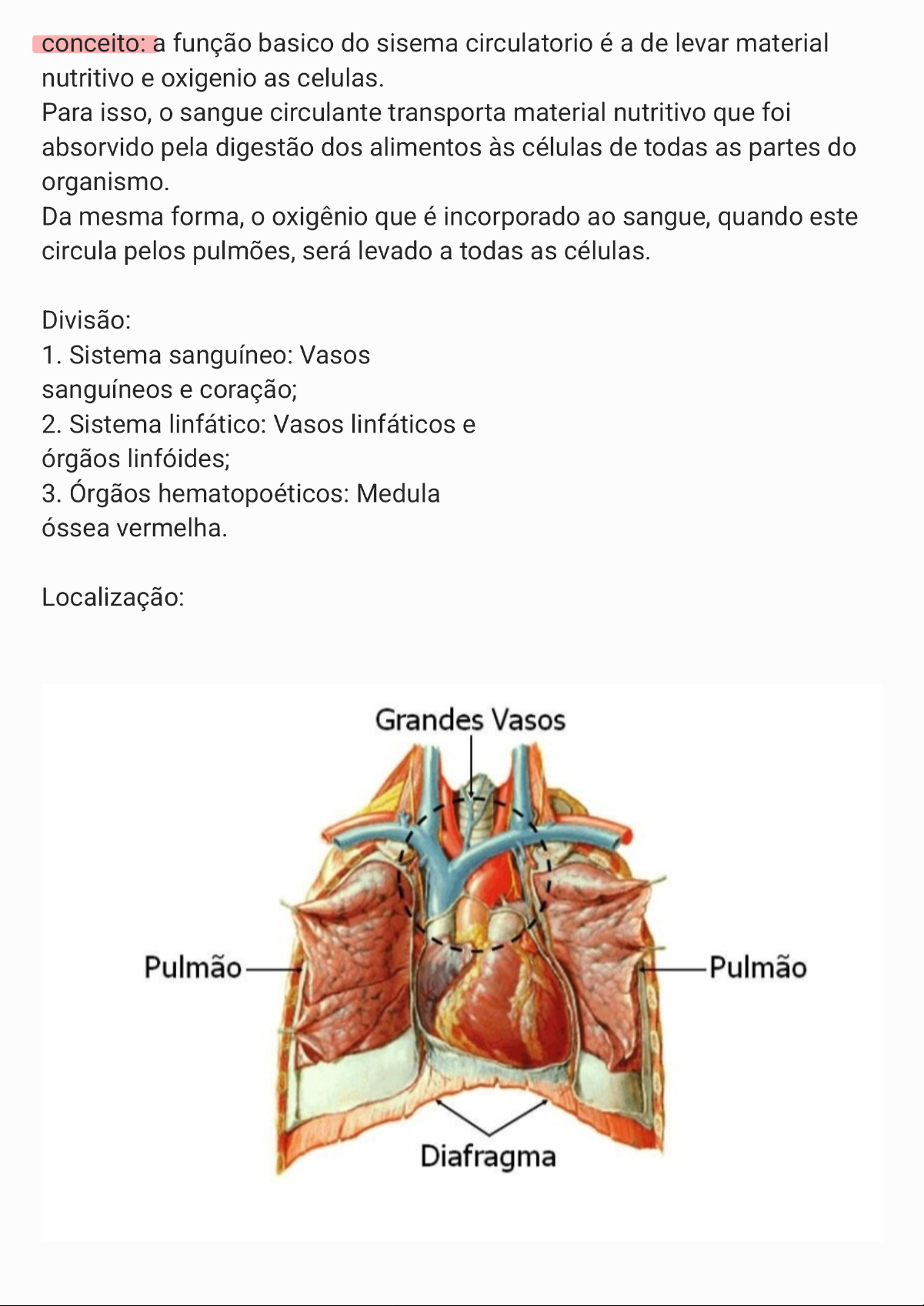 conceito: a função basico do sisema circulatorio é a de levar material nutritivo e oxigenio as celulas. Para isso, sangue circulante transporta material nutritivo que foi absorvido pela digestão dos alimentos às células de todas as partes do organismo. Da mesma forma, oxigênio que é incorporado ao sangue, quando este circula pelos pulmões, será levado a todas as células. Divisão: 1. Sistema sanguíneo: Vasos sanguíneos e coração; 2. Sistema linfático: Vasos linfáticos e órgãos linfóides; 3. Órgãos hematopoéticos: Medula óssea vermelha. Localização: Grandes Vasos Pulmão Pulmão DiafragmaPericardio. (membrana de tecido conjutio que recobre coração) função: manter coração no mediastino. Pericárdio Pericárdio Pericárdio Saco Pericárdio fibroso seroso Lâmina Lâmina parietal visceral Entre as duas lâminas do pericárdio seroso existe uma cavidade virtual, a cavidade do pericárdio. -cavidade do pericardio: fica entre as laminas. existe um liquido na cividade, chamado de liquido pericardio. PERICARDIUM Heart wall FIBROUS PERICARDIUM ENDOCARDIUM PARIETAL LAYER OF SEROUS PERICARDIUM Trabeculae carneae Coronary blood vessels Pericardial cavity MYOCARDIUM VISCERAL LAYER OF (CARDIAC MUSCLE) SEROUS PERICARDIUM (EPICARDIUM)Parede do coração. camada 1- camada do coração corresponde a lamina visceral e pode S chamada de epicardio (é a parede mais externa do coração). camada 2- miocardio, composto por tecido muscular cardioco. camada 3- (mais interna) chamada de endoardio, composto por teciddo epitelial Coração (formato). -tem formato de cone Base Face voltado para pulmonar lado esquerdo. direita Face pulmonar esquerda Ápice Face diafragmática Face esternocostal base: grandes vasos.4 camaras -2 camaras superiores: atrios (receptores) entra no coração. -2 camadas inferiores: ventriculos (ejetoras-bombeadoras) sai do coração Arco da Átrio DIREITO Átrio Direito Esquerdo Átrio Direito DIREITO Ventrículo Direito Ventrículo Ventrículo Direito Esquerdo Atrio Atrio E 1 3 ventriculo E D2 1- septo interatrial: entre os atrios 2- septo interverticular: entre os ventriculos. 3- septo atrioventricular: entre atrios e ventriculos (D e E) 4- Ostio atroventricular: (D e E) abertura.Atrio direito, auricula direita (externa) auemnta a capacidade receptora do atrio Parte ascendente da aorta Tronco pulmonar Aurícula direita Veia cava superior Cone arterial Artéria pulmonar direita Crista terminal Reflexão do pericárdio Septo atrioventricular Veia pulmonar (da parte membranácea superior direita do septo interventricular) Átrio esquerdo Válvula septal da valva atrioventricular direita (tricúspide) Veia pulmonar Músculos pectineos inferior direita Óstio do Septo interatrial seio coronário Limbo da fossa oval Válvula do seio coronário Fossa oval (de Tebésio) Válvula da veia cava inferior (de Eustáquio) Veia cava inferior Átrio direito aberto: vista lateral direita -veia cava inferior -veia cava superior levam sangue direto para atrio direito -seio coronario -musculo pectinio (encontrado na parede interna do atrio direito, aparencia enrugada) sangue é encaminhado do AD para VD pelo ostio. -valva atrioventricular direita, ela é formada por tres valvulas e pode ser chamada de tricuspide. -quandoo sangue chega ao atrio direito, a valva está fechada, atrio ira atingir volume maximo e ira contrair, quando contrai, abre a valva e após que sangue passa, ela fecha. fechamento é importante para que o sangue não volte, impede o fluxo. -musculos papilares: é importante para fixar a valva. -cordas tandineas: ponto de fixação para a valva tricuspide do ventriculo direito, sangue é bombeado para tronco pulmonar (arteia curta) se ramifica na arteia pulmonar direita e esquerda.Coração Ventrículo direito Reflexão do pericárdio Tronco pulmonar Aorta Seio transverso do pericárdio Seio transverso Válvula semilunar anterior do pericárdio Válvula semilunar direita Valva do tronco Veia cava superior Válvula semilunar esquerda pulmonar Aurícula direita Cone arterial Átrio direito Crista supraventricular Músculo Parte membranácea do papilar septal septo interventricular Parte muscular Válvula do septo Valva anterior interventricular atrio- ventricular Válvula direita septal (tricúspide Válvula Trabécula posterior septomarginal "banda moderadora" Cordas tendíneas Músculo papilar posterior Músculo papilar anterior Ventrículo direito aberto: vista anterior Trabéculas -arteias pulmonares: sangue vai para pulmão direito e esquerdo, nos sangue oxigenado vai ser encaminhado para atrio esquerdo -4 veias pulmonares (vista posterior) -2veias esquerdas (1 superior e 1 inferior) -2 veias direitas (1 superior e 1 inferior) Atrio esquerdo (AE) Coração Átrio esquerdo Músculos pectíneos Artérias pulmonares Aurícula esquerda Veias pulmonares Válvula do forame oval Átrio esquerdo Valva atrioventricular esquerda (mitral) Ventrículo esquerdo-muscuo pactineo - sangueoxigenado passa do AE para VE pelo obliquio -valva do ventriculo esquerdo é formada poe 2 valvulas, chamada de biscupide. Coração Ventrículo esquerdo Válvula da valva da aorta Válvula anterior da valva atrioventricular esquerda (mitral) Músculo papilar anterior Trabéculas cárneas Válvula posterior da valva atrioventricular Músculo papilar posterior Cordas tendíneas esquerda (mitral) Do VE sangue é bombeado para aorts e vai para todo corpo Vasos base: Coração Vasos da base Arco da aorta Veia cava superior Artéria pulmonar direita Artéria pulmonar esquerda Aurícula direita Veia pulmonar superior direita esquerda terminal Veia pulmonar superior esquerda Átrio esquerdo Átrio direito Veia pulmonar inferior esquerda Veia pulmonar inferior direita Reflexão pericárdia coronário Veia oblíqua do Veia cava inferior esquerdo Ventrículo esquerdo Ventrículo direito Seio coronário -veia cava superior -veia cava inferior -aorta -tronco pulmonar -veias pulmonaresVasos sanguineos Os