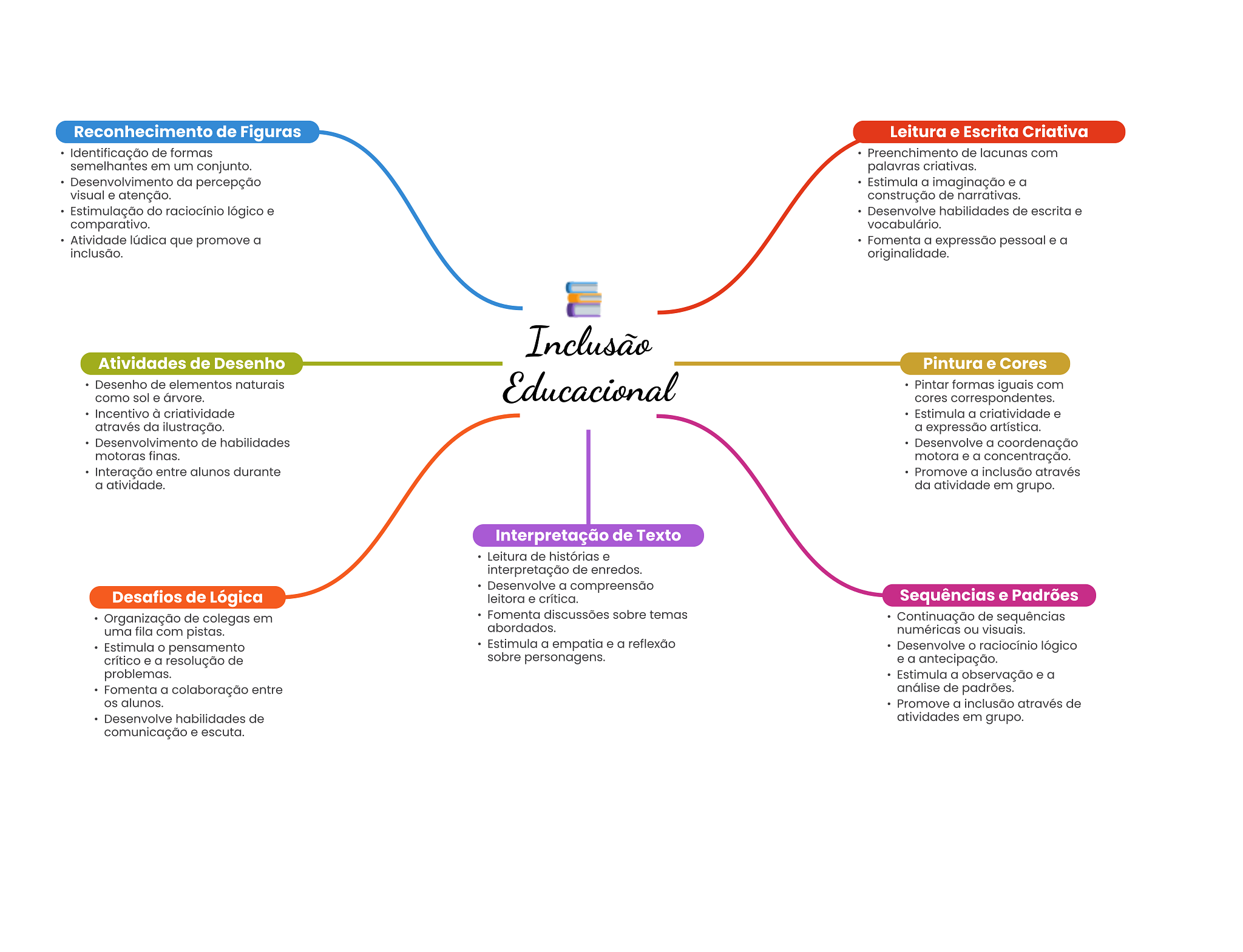 Reconhecimento de Figuras Leitura e Escrita Criativa Identificação de formas Preenchimento de lacunas com semelhantes em um conjunto. palavras criativas. Desenvolvimento da percepção Estimula a imaginação e a visual e atenção. construção de narrativas. Estimulação do raciocínio lógico e Desenvolve habilidades de escrita e comparativo. vocabulário. Atividade lúdica que promove a Fomenta a expressão pessoal e a inclusão. originalidade. Inclusão Atividades de Desenho Pintura e Cores Desenho de elementos naturais Educacional Pintar formas iguais com como sol e árvore. cores correspondentes. Incentivo à criatividade Estimula a criatividade e através da ilustração. a expressão artística. Desenvolvimento de habilidades Desenvolve a coordenação motoras finas. motora e a concentração. Interação entre alunos durante Promove a inclusão através a atividade. da atividade em grupo. Interpretação de Texto Leitura de histórias e interpretação de enredos. Desenvolve a compreensão Desafios de Lógica leitora e crítica. Sequências e Padrões Organização de colegas em Fomenta discussões sobre temas Continuação de sequências uma fila com pistas. abordados. numéricas ou visuais. Estimula pensamento Estimula a empatia e a reflexão Desenvolve O raciocínio lógico crítico e a resolução de sobre personagens. e a antecipação. problemas. Estimula a observação e a Fomenta a colaboração entre análise de padrões. alunos. Promove a inclusão através de Desenvolve habilidades de atividades em grupo. comunicação e escuta.