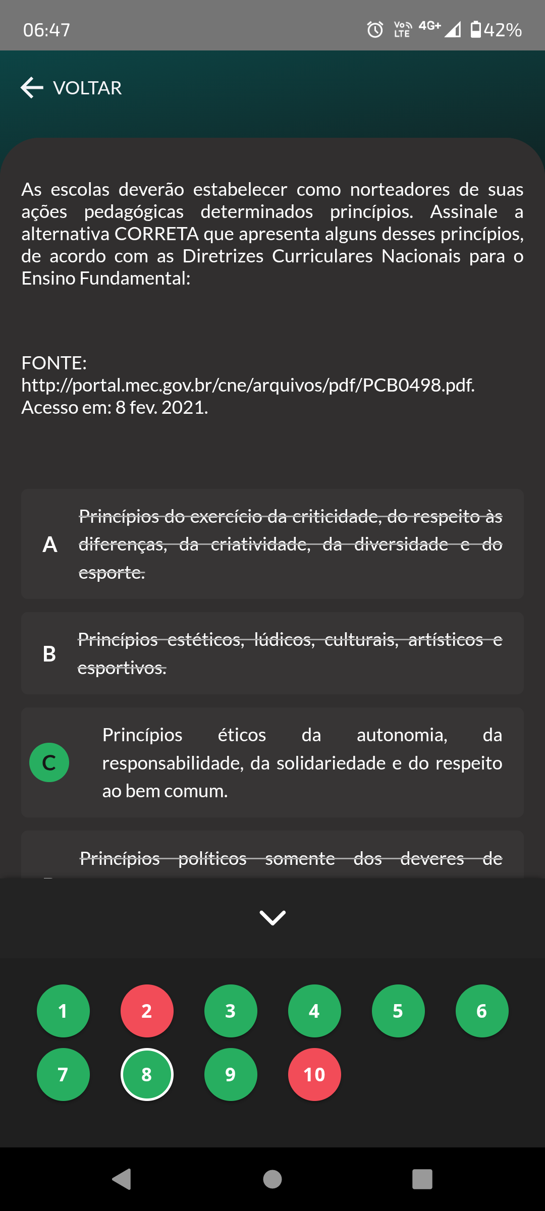 06:47 4G+ LTE 42% VOLTAR As escolas deverão estabelecer como norteadores de suas ações pedagógicas determinados princípios. Assinale a alternativa CORRETA que apresenta alguns desses princípios, de acordo com as Diretrizes Curriculares Nacionais para o Ensino Fundamental: FONTE: http://portal.mec.gov.br/cne/arquivos/pdf/PCB0498.pdf. Acesso em: 8 fev. 2021. Princípios do exercício da criticidade, do respeito às A diferenças, da criatividade, da diversidade e do esporte. Princípios estéticos, lúdicos, culturais, artísticos e esportivos. Princípios éticos da autonomia, da responsabilidade, da solidariedade e do respeito ao bem comum. Princípios políticos somente dos deveres de 1 2 3 4 5 6 7 8 9 10