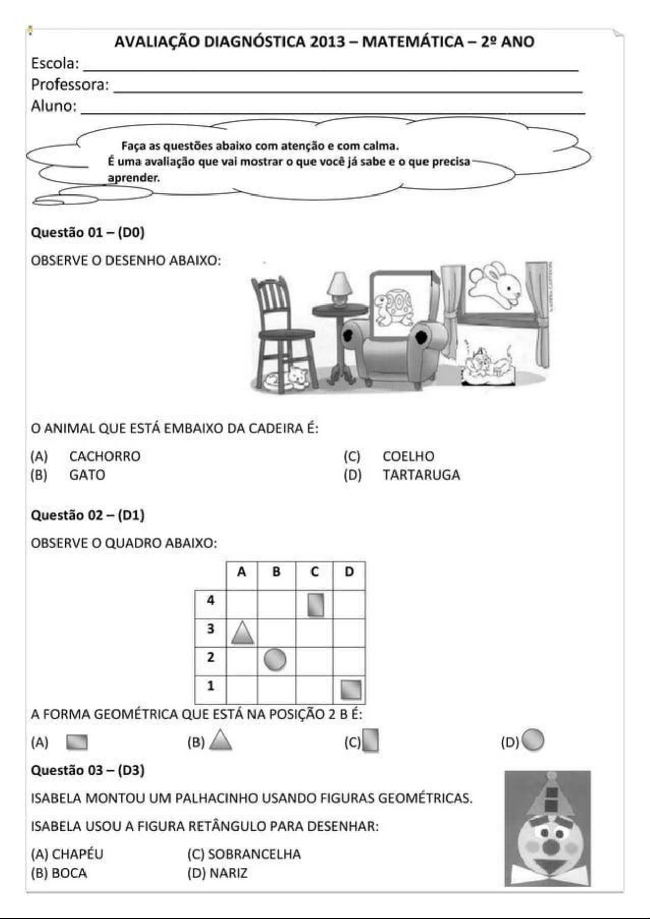 AVALIAÇÃO DIAGNÓSTICA 2013 - - MATEMÁTICA - ANO Escola: Professora: Aluno: Faça as questões abaixo com atenção e com calma. É uma avaliação que vai mostrar que você já sabe e que precisa aprender. Questão 01 - - OBSERVE DESENHO ABAIXO: o ANIMAL QUE ESTÁ EMBAIXO DA CADEIRA É: (A) CACHORRO (C) COELHO (B) GATO (D) TARTARUGA Questão 02 - - (D1) OBSERVE o QUADRO ABAIXO: A D 4 3 2 1 A FORMA GEOMÉTRICA QUE ESTÁ NA POSIÇÃO 2 (A) (B) (C) (D) Questão 03 - - (D3) ISABELA MONTOU UM PALHACINHO USANDO FIGURAS GEOMÉTRICAS. ISABELA USOU A FIGURA RETÂNGULO PARA DESENHAR: (A) CHAPÉU (C) SOBRANCELHA (B) BOCA (D) NARIZQuestão 04 - - (D4) A CAIXA DE LEITE TEM A FORMA DE: (A) (B) (C) (D) Questão 05 - - (D6) OBSERVE CARTÃO QUE LIA FEZ: A PARTE DA LETRA QUE COMPLETA CARTÃO QUE LIA FEZ É: (A) (B) (C) (D) Questão 06 - - (D8) JOÃO TRABALHA NO ZOOLÓGICO E FOI CONFERIR PESO DE ALGUNS ANIMAIS. OBSERVANDO os ANIMAIS, PODEMOS PERCEBER QUE 0 MAIS PESADO É: (A) MACACO (C) LEÃO (B) COBRA (D) COELHO Questão 07 - - (D9) A MÃE DE RAFAEL COMPROU TECIDO PARA FAZER SUA CALÇA DE UNIFORME. o INSTRUMENTO UTILIZADO PARA MEDIR 0 TECIDO FOI: (A)BALANÇA (C) LITRO (B) FITA MÉTRICA (D)TERMÔMETROQuestão 08 - (D10) DAVI PESOU SEUS ANIMAIS. o GATO PESOU 3 QUILOS E COELHO 2 QUILOS. os DOIS ANIMAIS JUNTOS PESARAM: A) 7 QUILOS (B) 5 QUILOS (C) 3 QUILOS (D) 1 QUILO 3 Kg 2 Kg Questão 09 - (D11) DE OBSERVE CALENDÁRIO DO MÊS DE FEVEREIRO DE 2013. DOM TER SEX 1 2 3 4 5 6 7 8 9 10 11 12 13 14 15 16 17 18 19 20 21 22 23 24 25 26 27 28 EM 2013, o CARNAVAL FOI COMEMORADO NO DIA 12 DE FEVEREIRO. o DIA DA SEMANA QUE ACONTECEU CARNAVAL FOI: (A) DOMINGO (C) TERÇA-FEIRA (B) SEGUNDA-FEIRA (D) QUARTA-FEIRA Questão 10 - (D13) AS CENAS ABAIXO ESTÃO FORA DE ORDEM, ENUMERE AS CENAS E COLOQUE-AS NA ORDEM CORRETA.Questão 11 - (D14) RELÓGIO ABAIXO MOSTRA HORÁRIO QUE COMEÇA A AULA DE EDUCAÇÃO FÍSICA DA TURMA DO ANO. 12 11 10 2 9 3 8 4 7 5 6 A AULA DE EDUCAÇÃO FÍSICA COMEÇA: (A)10 HORAS (B) 9 HORAS (C) 8 HORAS (D)7 HORAS Questão 12 - (D15) RITA COMEÇOU A TAREFA DE CASA ÀS 2 HORAS DA TARDE E TERMINOU ÀS 3 HORAS. o TEMPO QUE RITA GASTOU PARA FAZER A TAREFA FOI: 12 12 11 11 (A) 4 HORAS 10 2 10 2 3 3 (B) 3 HORAS 4 4 (C) 2 HORAS 7 5 7 6 5 (D) 1 HORA INÍCIO DA TAREFA FIM DA TAREFA Questão 13 - (D16) VEJA A QUANTIDADE DE DINHEIRO QUE LUANA JUNTOU PARA COMPRAR UMA REVISTINHA DA MÔNICA. 2 2 2 2 REAIS REAIS A QUANTIDADE DE DINHEIRO QUE LUANA JUNTOU FOI: (A) 2 REAIS (B) 3 REAIS (C) 4REAIS (D) SREAISQuestão 14 - (D17) VOCÊ CONHECE PARAPAN? SÃO AS OLIMPÍADAS DOS ATLETAS QUE POSSUEM ALGUMA NECESSIDADE ESPECIAL. OBSERVE A CORRIDA DISPUTADA POR ALGUMAS CRIANÇAS QUE UTILIZAM CADEIRAS DE RODAS: TÉO RUAN HUGO IVO DAVI ABEL GIL A CRIANÇA QUE CJHEGOU EM TERCEIRO LUGAR NA CORRIDA FOI (A) IVO (B) HUGO (C) RUAN (D) ABEL Questão 15 - (D18) LEIA A PARLENDA. UM, DOIS, FEIJÃO COM ARROZ SETE, OITO COMER BISCOITO TRÊS, QUATRO, FEIJÃO NO PRATO NOVE, DEZ, COMER PASTEIS NOME DO NÚMERO QUE COMPLETA A PARLENDA É (A) QUATRO SEIS FALAR (B) CINCO , INGLÊS (C) SEIS (D) SETEQuestão 16 - (D19) VEJA os NÚMEROS QUE DIEGO PINTOU EM SEU CARRINHO 3 7 1 9 4 o NÚMERO PAR PINTADO NO CARRINHO É: (A) 1 (B) 3 (C) 4 (D)7 Questão 17 - (D20) VEJA A QUANTIDADE DE BRINQUEDOS NAS PRATELEIRAS DA LOJA. ESCREVA DENTRO DO QUADRO NÚMERO QUE INDICA A QUANTIDADE DE ELEMENTOS DE CADA PRATELEIRA. Questão 18 - (D22) MARIANA SEPAROU SUA COLEÇÃO DE BONECAS EM GRUPINHOS DE 10. A QUANTIDADE DE BONECAS DE MARIANA É: (A) 1 DEZENA E 3 UNIDADES (C) 3 DEZENAS E 2 UNIDADES (B) 2 DEZENAS E 3 UNIDADES (D) 4 DEZENAS E 2 UNIDADESQuestão 19 - (D23) LEIA AVISO: FALTAM 19 DIAS PARA A INAUGURAÇÃO DA NÚMERO 19 ESCRITO NO AVISO É FORMADO POR: (A) 1 DEZENA E 9 UNIDADES (C) 1 DEZENA (B) 9 DEZENAS E 1 UNIDADE (D) 9 DEZENAS Questão 20 (D24) LARA ESTAVA BRINCANDO DE PULAR CORDA. ELA CONTAVA DE 5 EM 5. NA SUA CONTAGEM LARA ESQUECEU ALGUNS NÚMEROS. 5 10 15 25 30 NÚMERO ESQUECIDO FOI: (A) 12 (B) 15 (C) 18 (D) 20 Questão 21 - (D25) VEJA ABAIXO AS CAMISAS DE UNIFORME DA SELEÇÃO BRASILEIRA: 5 10 7 1 AS CAMINSAS FORAM ENTREGUES PARA os JOGADORES EM ORDEM CRESCENTE. A ORDEM DE ENTREGA FOI: (B) 1 5 7 10 (C) 1 7 5 10 (D) 10-7-5-1Questão 22 (D27) OBSERVE DO SUPERMERCADO BRETAS. 0 1 2 3 4 5 6 7 8 9 o NÚMERO DA VAGA EM QUE o CARRO ESTÁ ESTACIONADO É: (A) 4 (B) 5 (C) 6 (D) 7 Questão 23 - (D28) RAFAEL PEDIU UM X-SALADA, BATATA FRITA E UM 5 REAIS LANCHE DE RAFAEL CUSTOU: REFRIGERANTE 2 BATATA FRITA 3 2 REALS (A) 8 REAIS (C) 10 REAIS CACHORRO-QUENTE 4 REAIS (B) 9REAIS (D) 11 REAIS Questão 24 (D32) TIAGO E PEDRO FAZEM ANIVERSÁRIO NA MESMA DATA. TIAGO ESTÁ COMPLETANDO 05 ANOS E PEDRO o DOBRO DA IDADE DE TIAGO. MARQUE o BOLO QUE REPRESENTA A IDADE QUE PEDRO ESTÁ COMPLETANDO. (A) 5 (B) 8 (C) 10 (D) 12 Questão 25 (D33) NA CRECHE SONHO ENCANTADO A PROFESSORA PESQUISOU AS BRINCADEIRAS PREFERIDAS PELOS ALUNOS. BRINCADEIRAS PREFERIDAS A BRINCADEIRA PREFERIDA BRINCADEIRA TOTAL PELOS ALUNOS É: QUEIMADA 5 AMARELINHA 7 (A) MORTO VIVO MORTO-VIVO 8 (B) PEGA PEGA ESTÁTUA 9 (C) QUEIMADA PEGA-PEGA 10 (D) ESTÁTUAATENÇÃO!!!!!!! ORIENTAÇÃO À PROFESSORA: Prezada professora, A avaliação de Matemática do ano deverá ser toda lida, questão por questão, para os alunos.