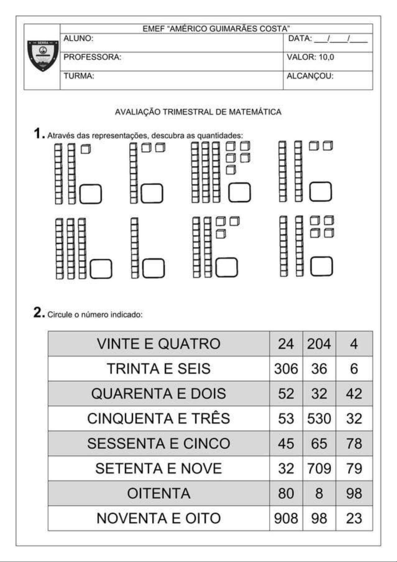 EMEF "AMÉRICO GUIMARÃES COSTA" ALUNO: DATA: / / PROFESSORA: VALOR: 10,0 TURMA: ALCANÇOU: AVALIAÇÃO TRIMESTRAL DE MATEMÁTICA 1. Através das representações, descubra as quantidades: 2. Circule o número indicado: VINTE E QUATRO 24 204 4 TRINTA E SEIS 306 36 6 QUARENTA E DOIS 52 32 42 CINQUENTA E TRÊS 53 530 32 SESSENTA E CINCO 45 65 78 SETENTA E NOVE 32 709 79 OITENTA 80 8 98 NOVENTA E OITO 908 98 233. Resolva os probleminhas: A) Havia um grupo de 8 abelhas. Duas foram embora. B) Um velhinho estava com 9 balões na mão 4 voaram. 4. Catarina comprou 14 pulseiras e ganhou mais 12 de sua irmã. Com quantas pulseiras Catarina ficou? 5. Resolva: A) 54 B) 24 C) 61 D) 80 + 24 + 57 E) 35 F) 80 G) 30 H) 70 - 18 - 47 - 17 - 67