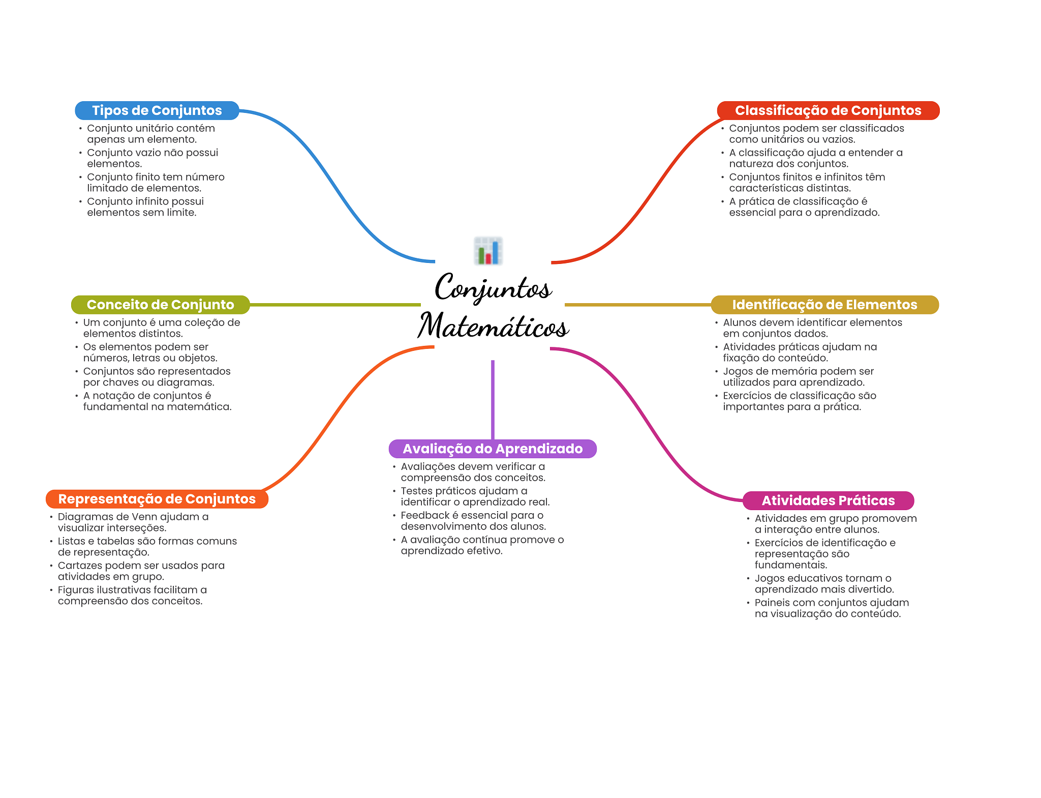 Tipos de Conjuntos Classificação de Conjuntos Conjunto unitário contém Conjuntos podem ser classificados apenas um elemento. como unitários ou vazios. Conjunto vazio não possui A classificação ajuda a entender a elementos. natureza dos conjuntos. Conjunto finito tem número Conjuntos finitos e infinitos têm limitado de elementos. características distintas. Conjunto infinito possui A prática de classificação é elementos sem limite. essencial para aprendizado. Conjuntos Conceito de Conjunto Identificação de Elementos Um conjunto é uma coleção de Matemáticos Alunos devem identificar elementos elementos distintos. em conjuntos dados. Os elementos podem ser Atividades práticas ajudam na números, letras ou objetos. fixação do conteúdo. Conjuntos são representados Jogos de memória podem ser por chaves ou diagramas. utilizados para aprendizado. A notação de conjuntos é Exercícios de classificação são fundamental na matemática. importantes para a prática. Avaliação do Aprendizado Avaliações devem verificar a compreensão dos conceitos. Testes práticos ajudam a Representação de Conjuntos identificar aprendizado real. Atividades Práticas Diagramas de Venn ajudam a Feedback é essencial para Atividades em grupo promovem visualizar interseções. desenvolvimento dos alunos. a interação entre alunos. Listas e tabelas são formas comuns A avaliação contínua promove Exercícios de identificação e de representação. aprendizado efetivo. representação são Cartazes podem ser usados para fundamentais. atividades em grupo. Jogos educativos tornam Figuras ilustrativas facilitam a aprendizado mais divertido. compreensão dos conceitos. Paineis com conjuntos ajudam na visualização do conteúdo.