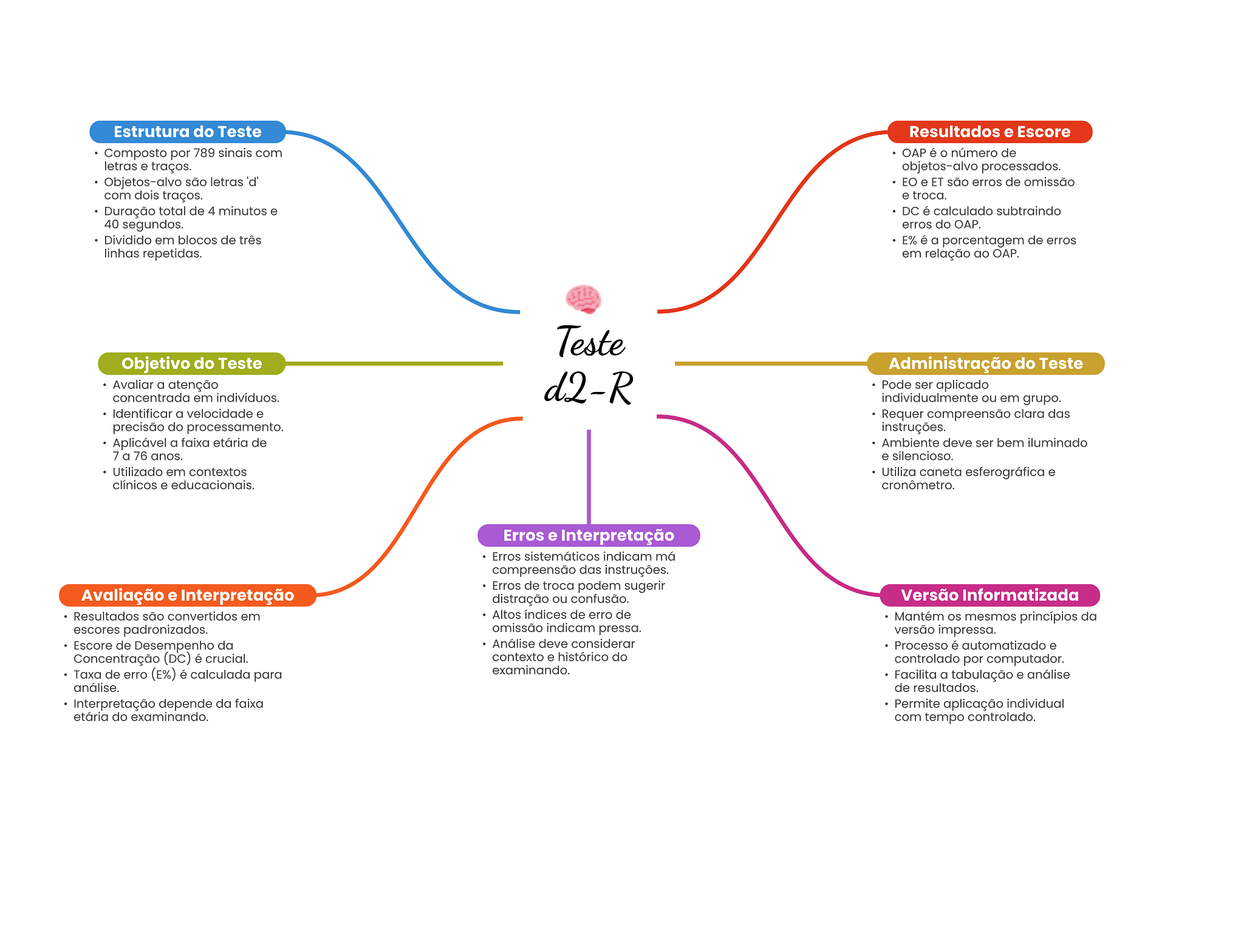 Estrutura do Teste Resultados e Escore Composto por 789 sinais com OAP é o número de letras e traços. objetos-alvo processados. Objetos-alvo são letras 'd' e ET são erros de omissão com dois traços. e troca. Duração total de 4 minutos e DC é calculado subtraindo 40 segundos. erros do OAP. Dividido em blocos de três E% é a porcentagem de erros linhas repetidas. em relação ao OAP. Teste Objetivo do Teste Administração do Teste Avaliar a atenção d2-R Pode ser aplicado concentrada em indivíduos. individualmente ou em grupo. Identificar a velocidade e Requer compreensão clara das precisão do processamento. instruções. Aplicável a faixa etária de Ambiente deve ser bem iluminado 7 a 76 anos. e silencioso. Utilizado em contextos Utiliza caneta esferográfica e clínicos e educacionais. cronômetro. Erros e Interpretação Erros sistemáticos indicam má compreensão das instruções. Erros de troca podem sugerir Avaliação e Interpretação distração ou confusão. Versão Informatizada Resultados são convertidos em Altos de erro de Mantém mesmos princípios da escores padronizados. omissão indicam pressa. versão impressa. Escore de Desempenho da Análise deve considerar Processo é automatizado e Concentração (DC) é crucial. contexto e histórico do controlado por computador. Taxa de erro (E%) é calculada para examinando. Facilita a tabulação e análise análise. de resultados. Interpretação depende da faixa Permite aplicação individual etária do examinando. com tempo controlado.