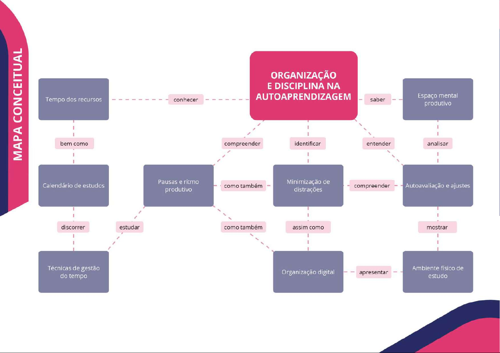 MAPA CONCEITUAL ORGANIZAÇÃO E DISCIPLINA NA conhecer AUTOAPRENDIZAGEM Espaço mental Tempo dos recursos saber produtivo bem como compreender identificar entender analisar Pausas e ritmo Calendário de estudos Minimização de como também compreender Autoavaliação e ajustes produtivo distrações discorrer estudar como também assim como mostrar Técnicas de gestão Ambiente físico de Organização digital apresentar do tempo estudo
