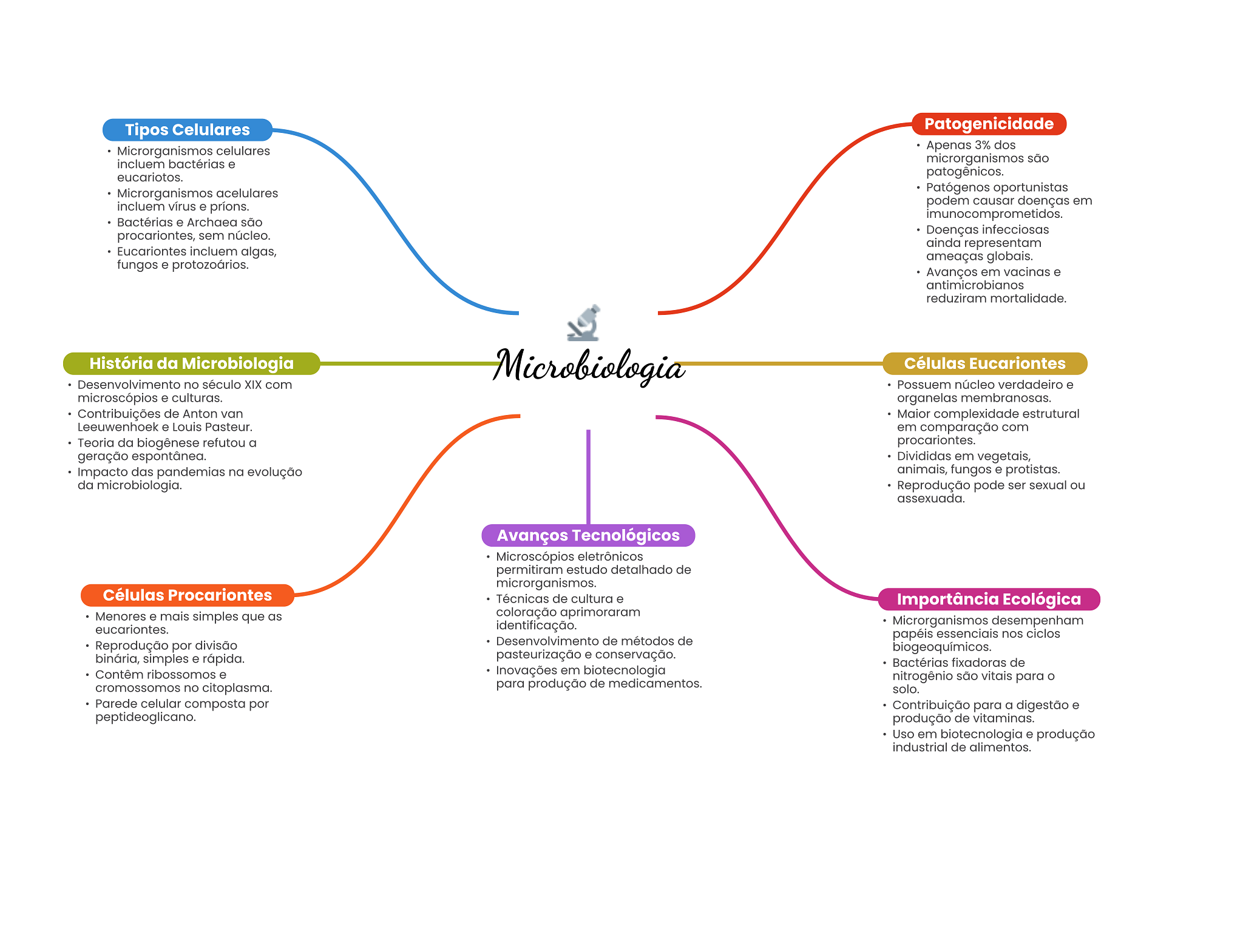 Tipos Celulares Patogenicidade Microrganismos celulares Apenas 3% dos incluem bactérias e microrganismos são eucariotos. patogênicos. Microrganismos acelulares Patógenos oportunistas incluem vírus e príons. podem causar doenças em imunocomprometidos. Bactérias e Archaea são procariontes, sem núcleo. Doenças infecciosas ainda representam Eucariontes incluem algas, ameaças globais. fungos e protozoários. Avanços em vacinas e antimicrobianos reduziram mortalidade. História da Microbiologia Microbiologia Células Eucariontes Desenvolvimento no século XIX com Possuem núcleo verdadeiro e microscópios e culturas. organelas membranosas. Contribuições de Anton van Maior complexidade estrutural Leeuwenhoek e Louis Pasteur. em comparação com Teoria da biogênese refutou a procariontes. geração espontânea. Divididas em vegetais, Impacto das pandemias na evolução animais, fungos e protistas. da microbiologia. Reprodução pode ser sexual ou assexuada. Avanços Tecnológicos Microscópios eletrônicos permitiram estudo detalhado de microrganismos. Células Procariontes Técnicas de cultura e Importância Ecológica Menores e mais simples que as coloração aprimoraram eucariontes. identificação. Microrganismos desempenham Reprodução por divisão Desenvolvimento de métodos de papéis essenciais nos ciclos biogeoquímicos. binária, simples e rápida. pasteurização e conservação. Bactérias fixadoras de Contêm ribossomos e Inovações em biotecnologia nitrogênio são vitais para O cromossomos no citoplasma. para produção de medicamentos. solo. Parede celular composta por Contribuição para a digestão e peptideoglicano. produção de vitaminas. Uso em biotecnologia e produção industrial de alimentos.